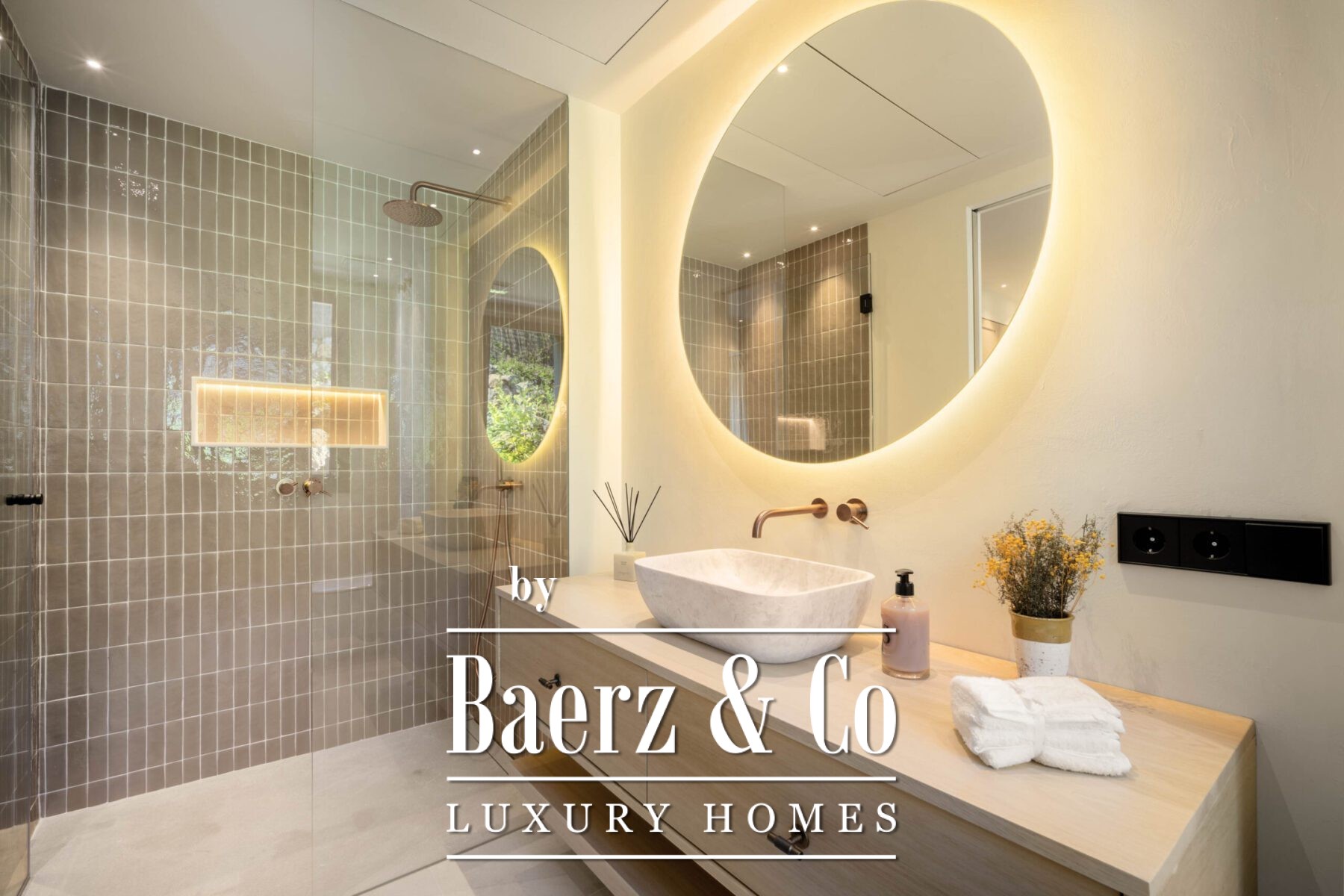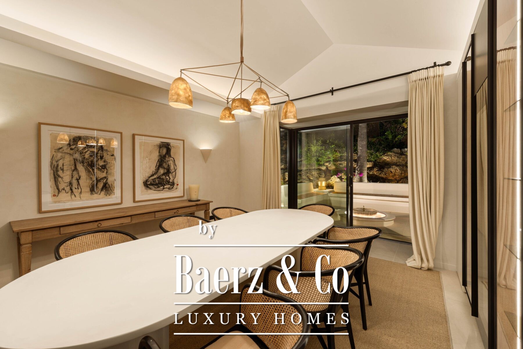 Step inside to discover a calming palette of natural tones, soaring vaulted ceilings, and an open-plan living space that seamlessly flows into a modern kitchen and dining area. Each detail has been carefully curated, from the sleek finishes and custom furnishings to the high-spec appliances and ambient lighting. Floor-to-ceiling glass doors invite natural light throughout and open onto a generous terrace complete with a sunken lounge, outdoor kitchen, and a striking infinity-edge pool that appears to float above the landscape.