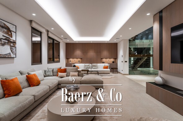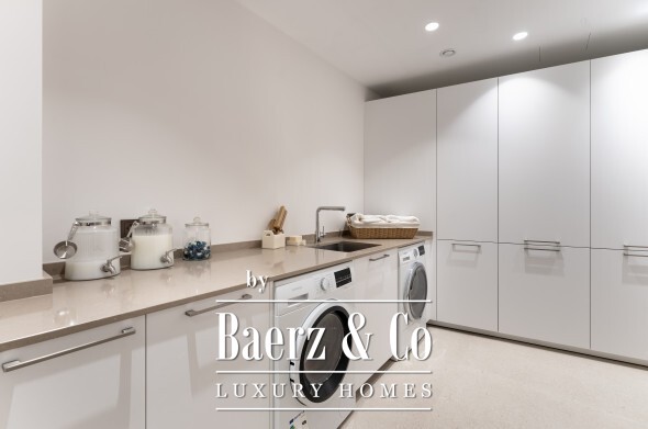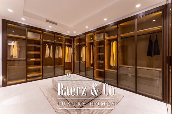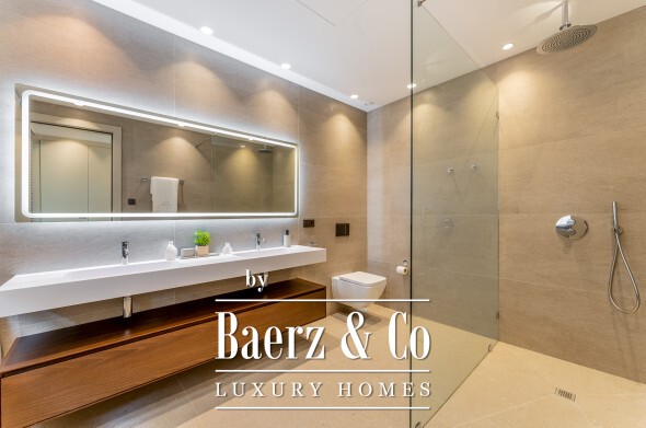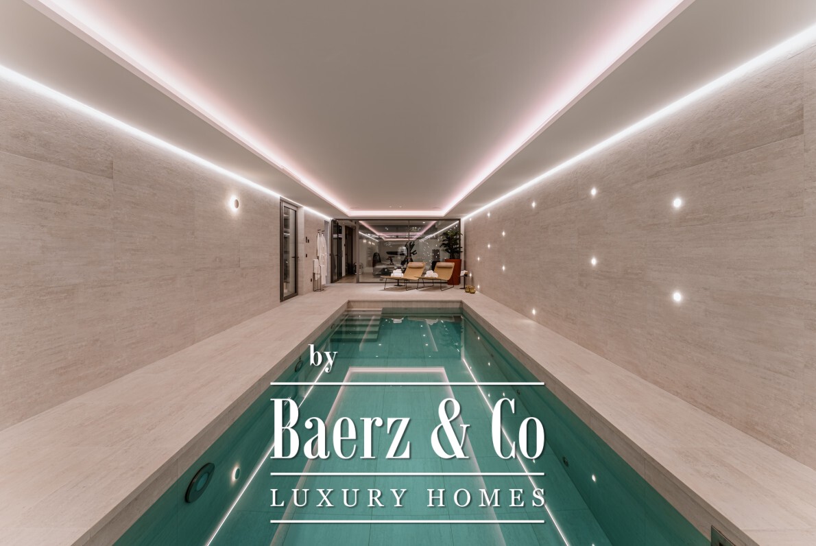 The main floor offers both flow and formality: a living salon, a 12-seat dining room, and a fully outfitted kitchen with a central island provide convivial zones for everyday life and entertaining. The seamless connection to terrace and lawns opens up an outdoor world shaped by a summer kitchen, al fresco dining, barbecue, and a private pool surrounded by curated gardens. Light traces each space through expansive floor-to-ceiling windows.