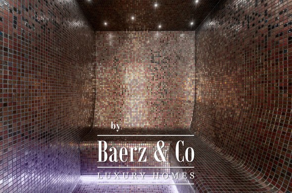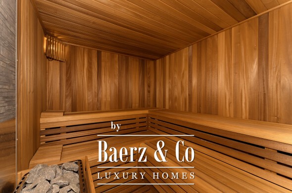 The upper level delivers both privacy and perspective. The master suite features dual bathrooms, separate wardrobes, and expanses of glass framing the landscape. Two further guest suites, one with a private terrace, complete this sanctuary. On the lower floor, a spa with heated indoor pool, sauna, gym, and steam room await, complemented by an entertainment lounge, climate-controlled wine cellar, and a staffed apartment with its own kitchen. Four cars rest securely in the garage, with additional guest parking for six vehicles.