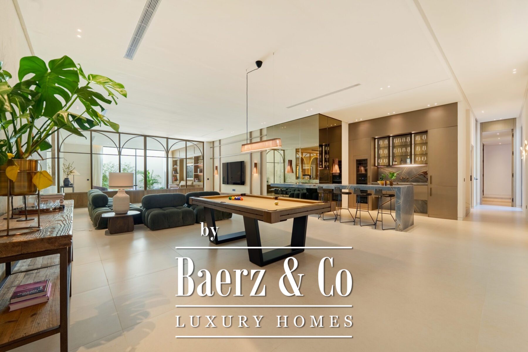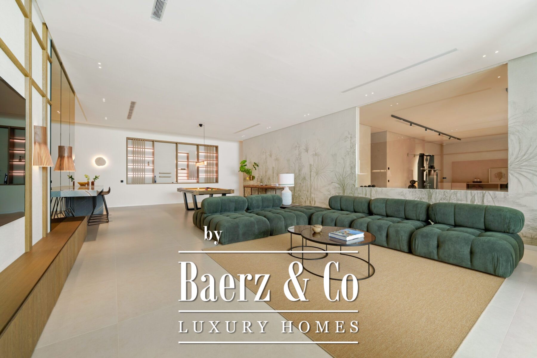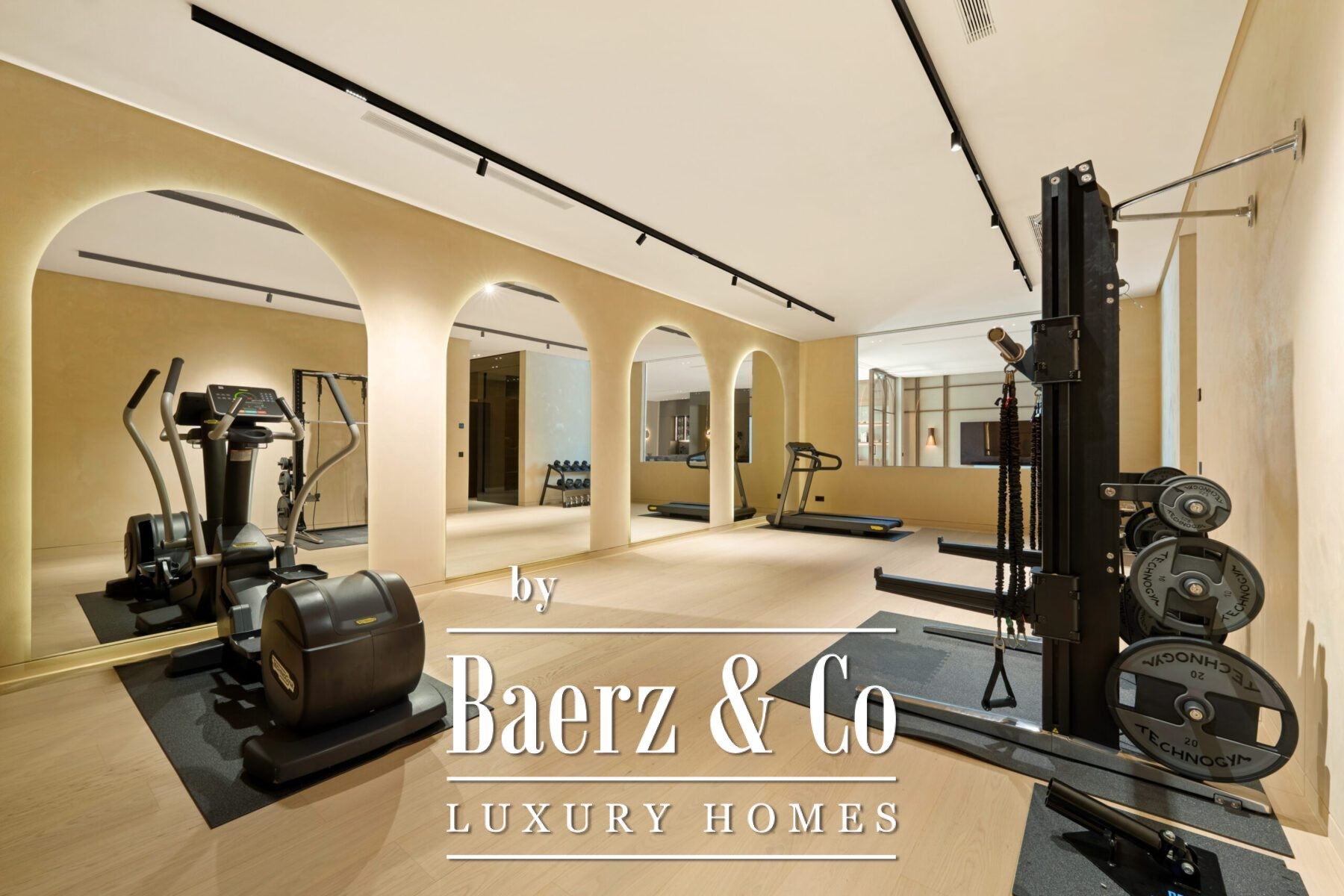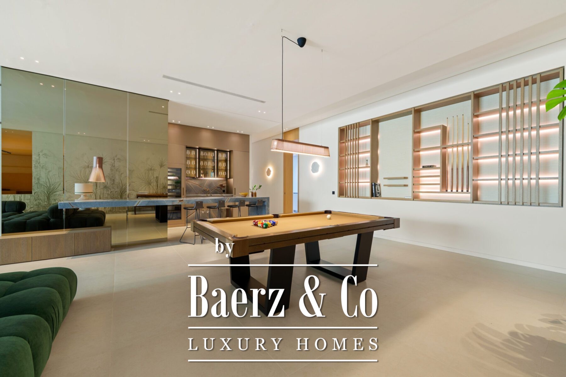 The lower level is dedicated to leisure and lifestyle. It boasts a playroom, TV lounge, bar, gym, and sauna, as well as two additional en-suite bedrooms and a home office.