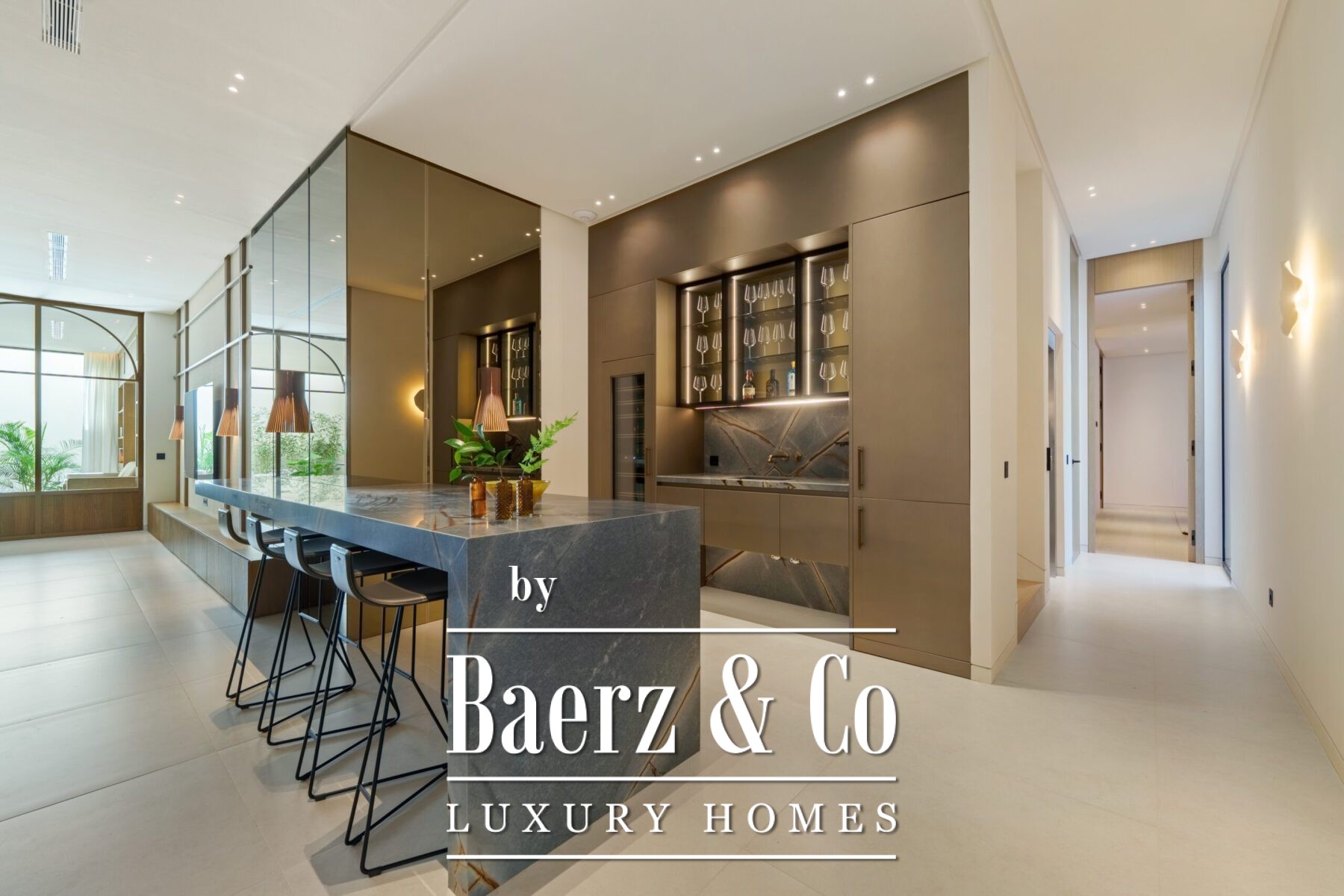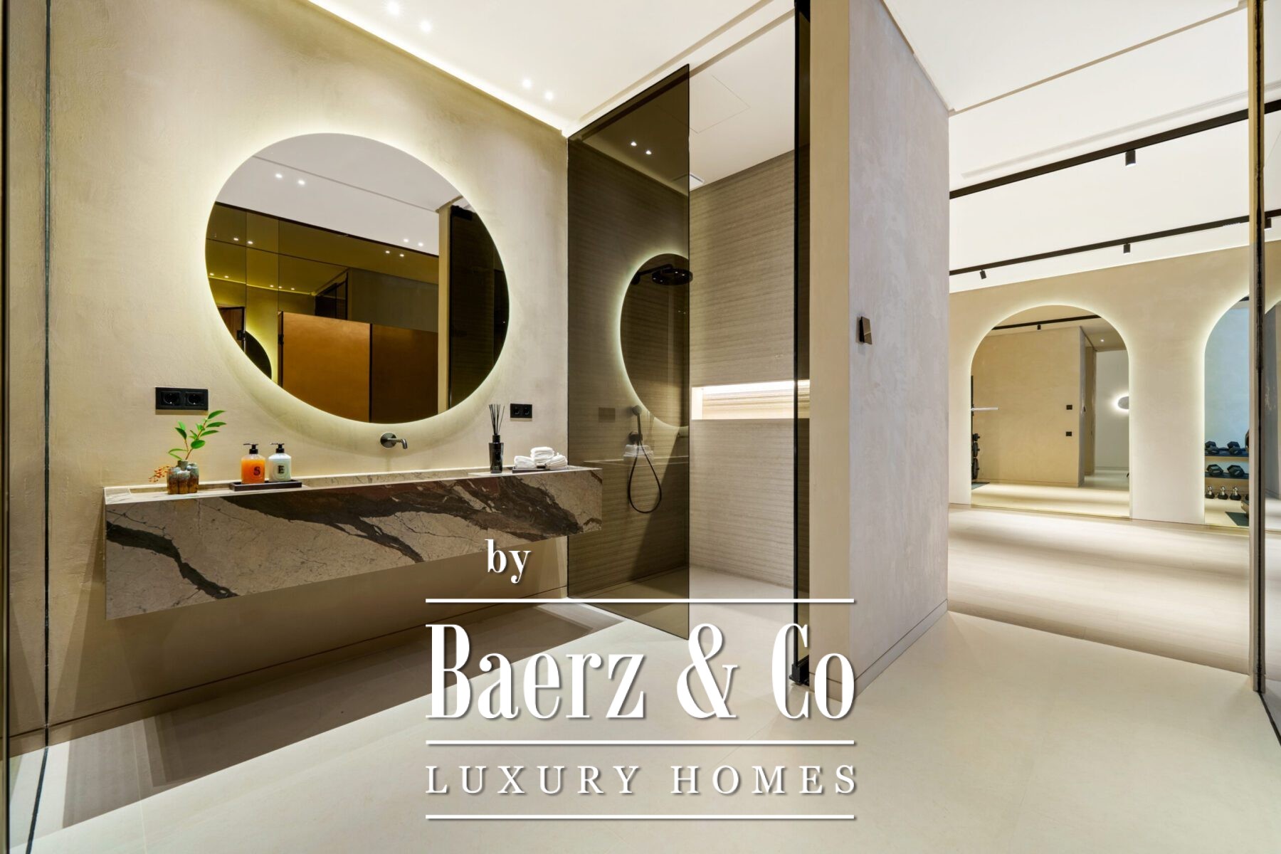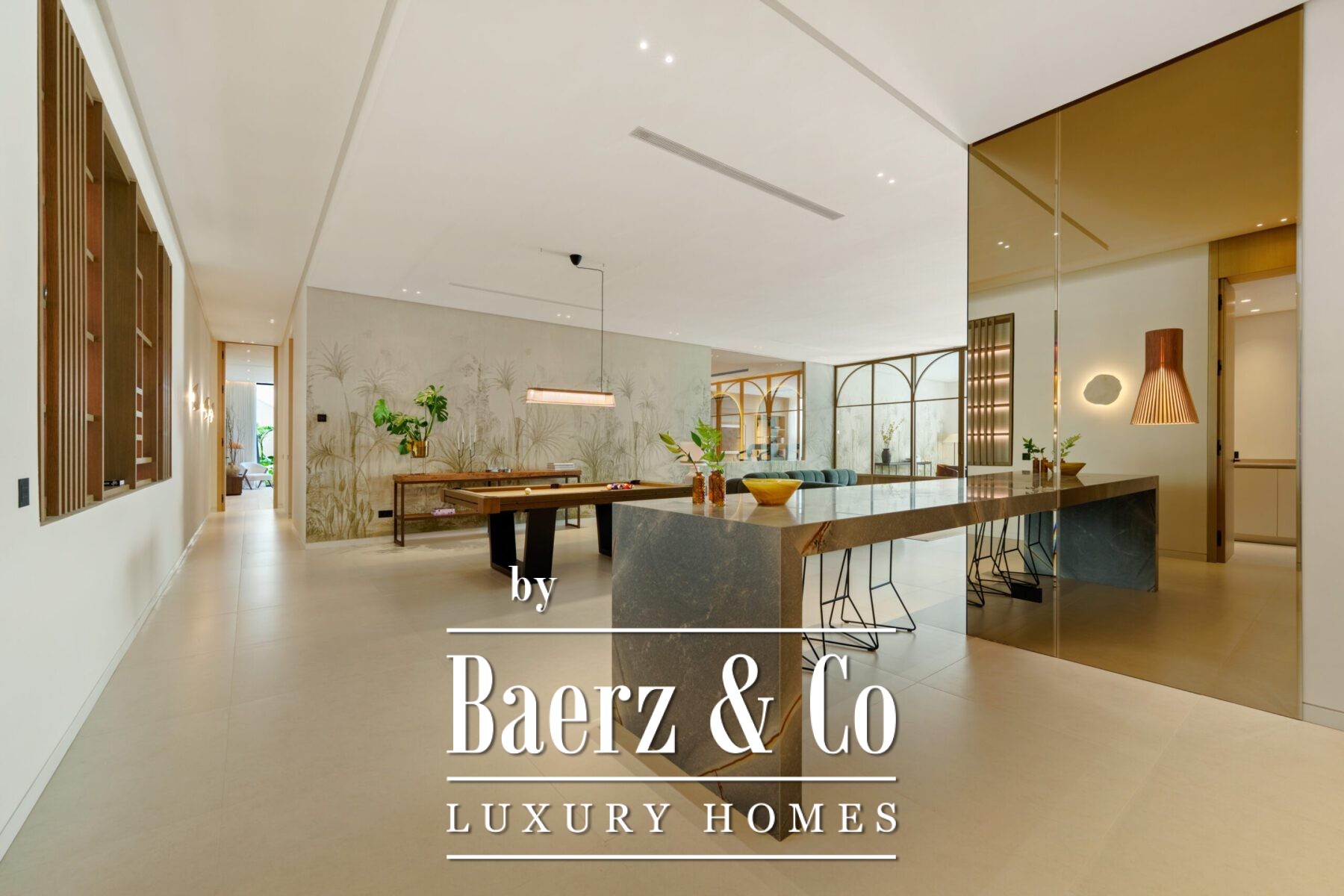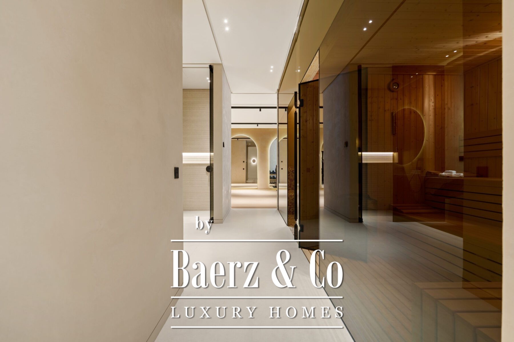 The lower level is dedicated to leisure and lifestyle. It boasts a playroom, TV lounge, bar, gym, and sauna, as well as two additional en-suite bedrooms and a home office.