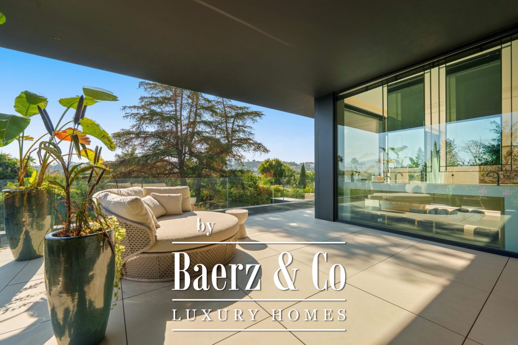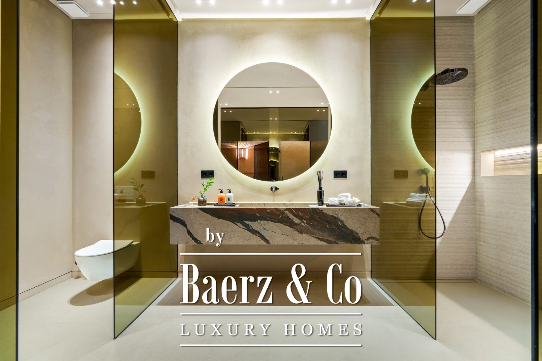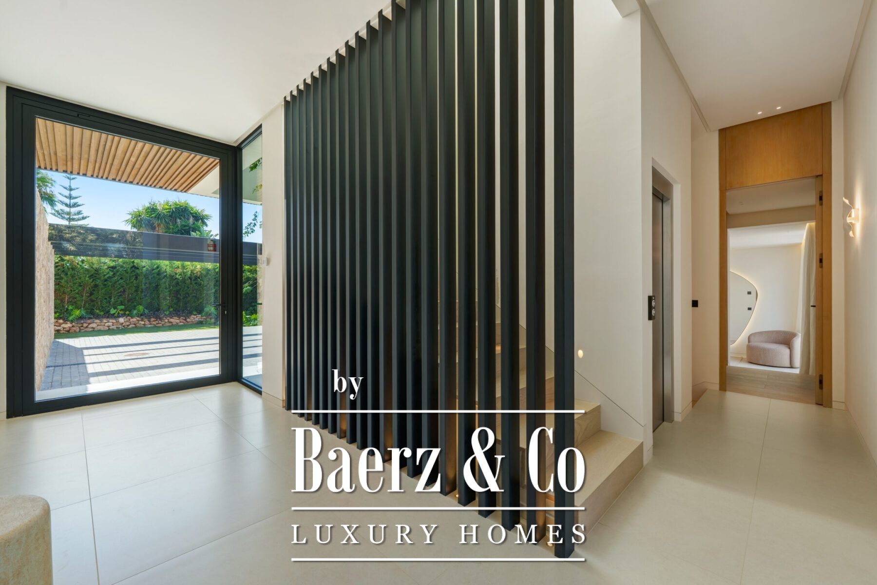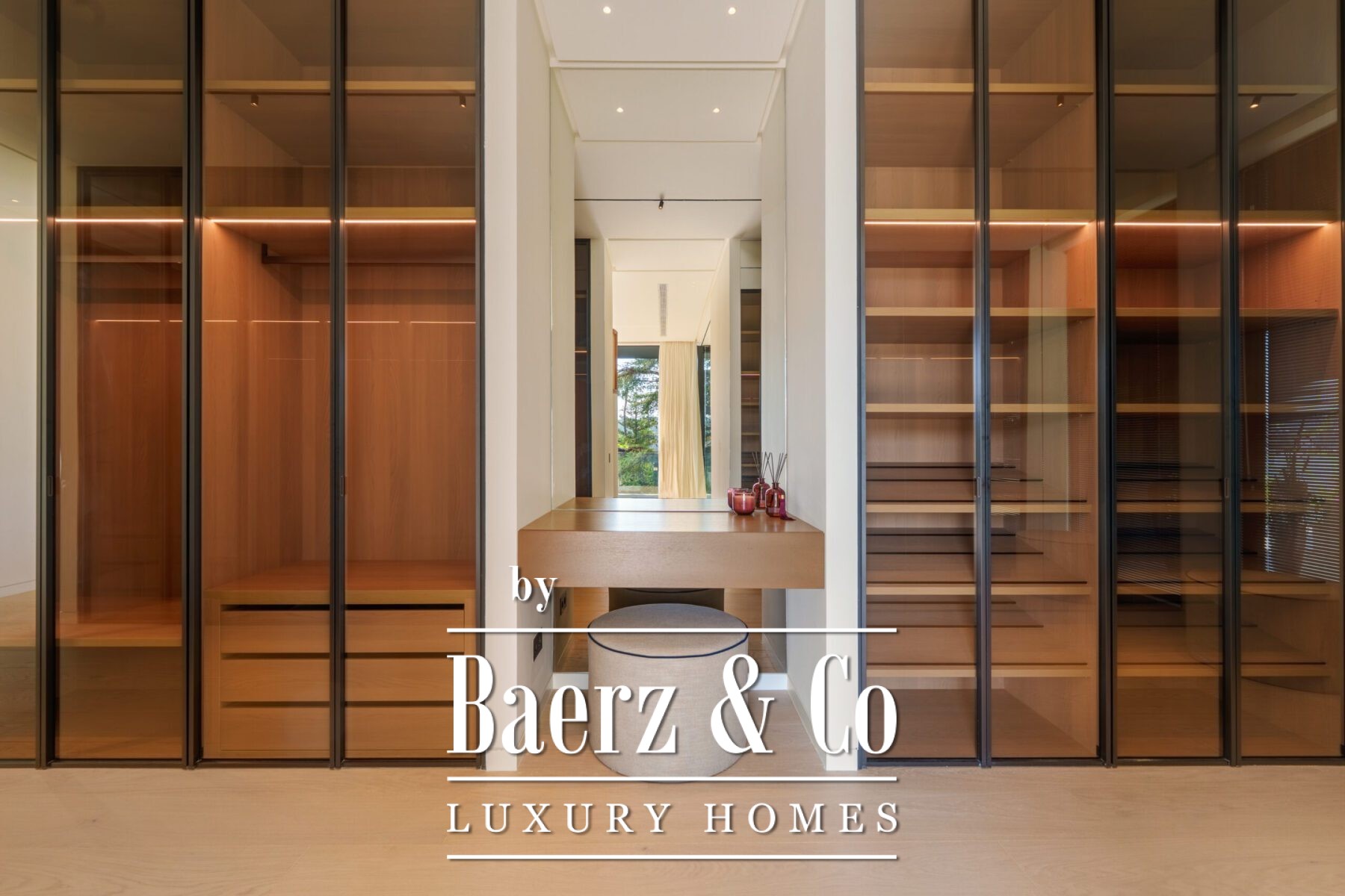 The lower level is dedicated to leisure and lifestyle. It boasts a playroom, TV lounge, bar, gym, and sauna, as well as two additional en-suite bedrooms and a home office.
