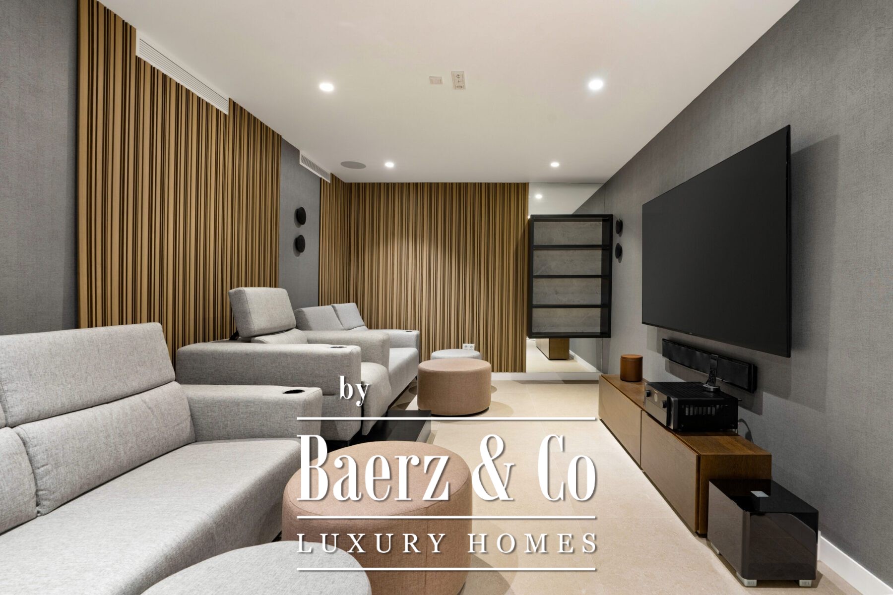 Outdoor living is central to the experience, with multiple terraces, a swimming pool, sunken firepit, jacuzzi, and a fully equipped outdoor kitchen with grill and waterproof TV. Two additional en-suite bedrooms on the lower level benefit from English patios. A soundproof cinema room, utility spaces, double garage with electric charging, and gated driveway heighten security and comfort.