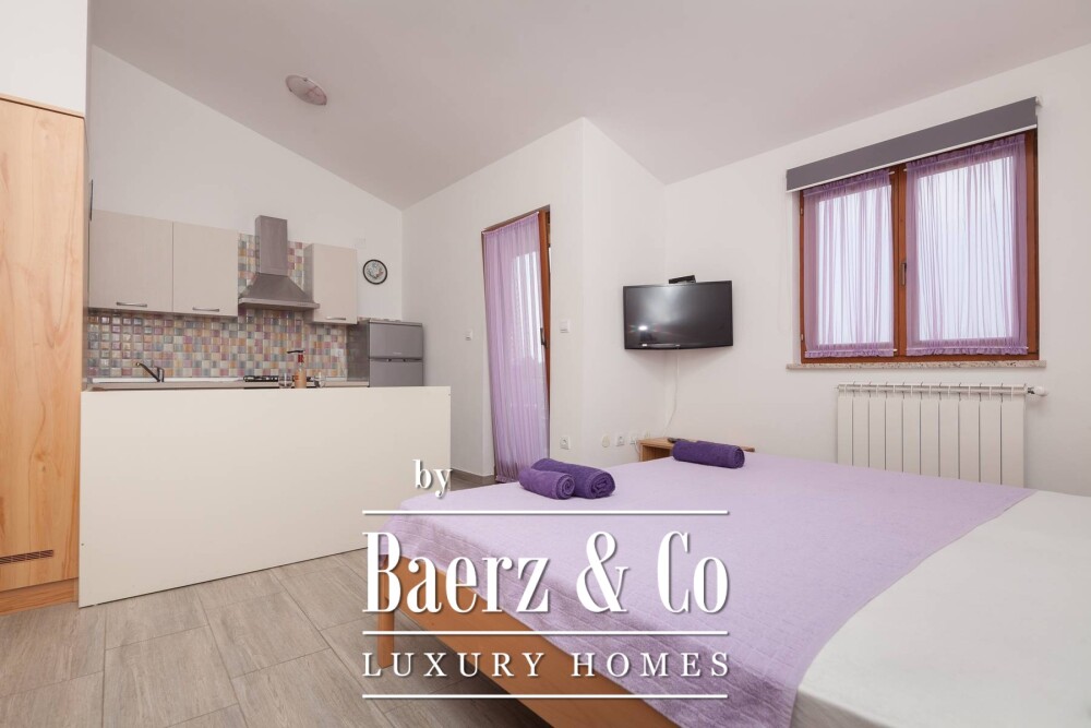 Amenities include a four-car garage, games room, central gas heating, nine air conditioners, and a fully furnished interior. The sea lies just 800 meters away, while essential shops, markets, and restaurants are within immediate reach. This property presents a compelling balance between serene living and robust rental potential in one of Croatia’s most accessible coastal settings.