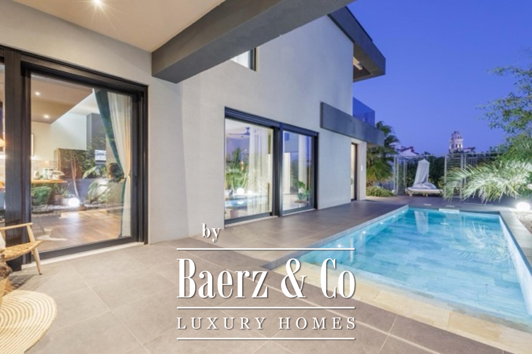 On the ground floor, an expansive living room anchors the home, featuring bespoke furnishings sourced from Germany, Italy, and the Czech Republic. The interplay of soft color palettes, a statement fireplace, and generous glazing blurs indoor and outdoor life, opening to the private pool and surrounding terrace. Adjoining rooms include a thoughtfully equipped kitchen, a guest bedroom, a toilet, additional service spaces, and direct garden access.