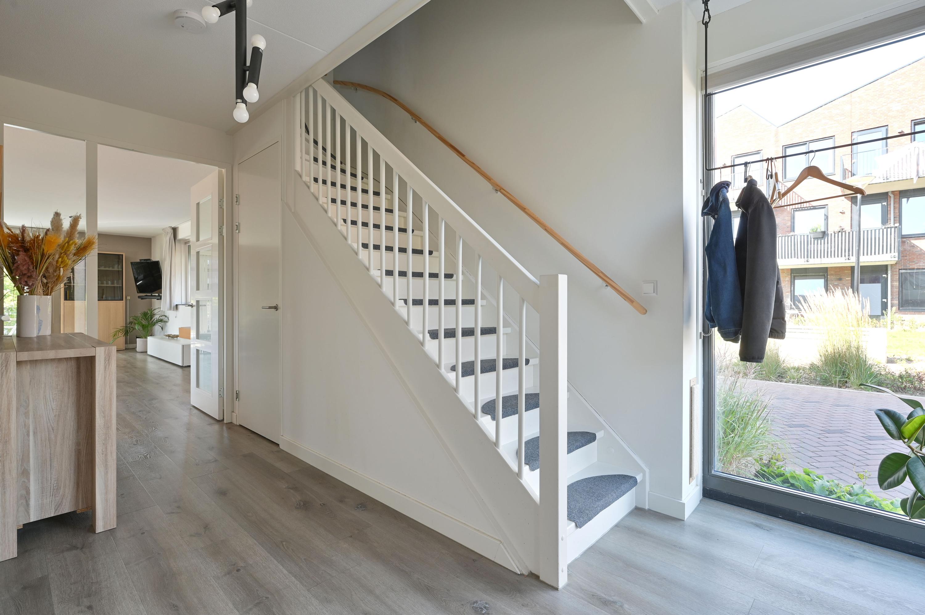 The spacious anthracite gravel driveway offers parking for two cars and includes a private charging station. From here you reach the stylish entrance of the villa. Inside, the generous hall with a large corner window immediately catches the eye, flooding the space with natural light. From the hall, you have access to various rooms and the staircase to the first floor.