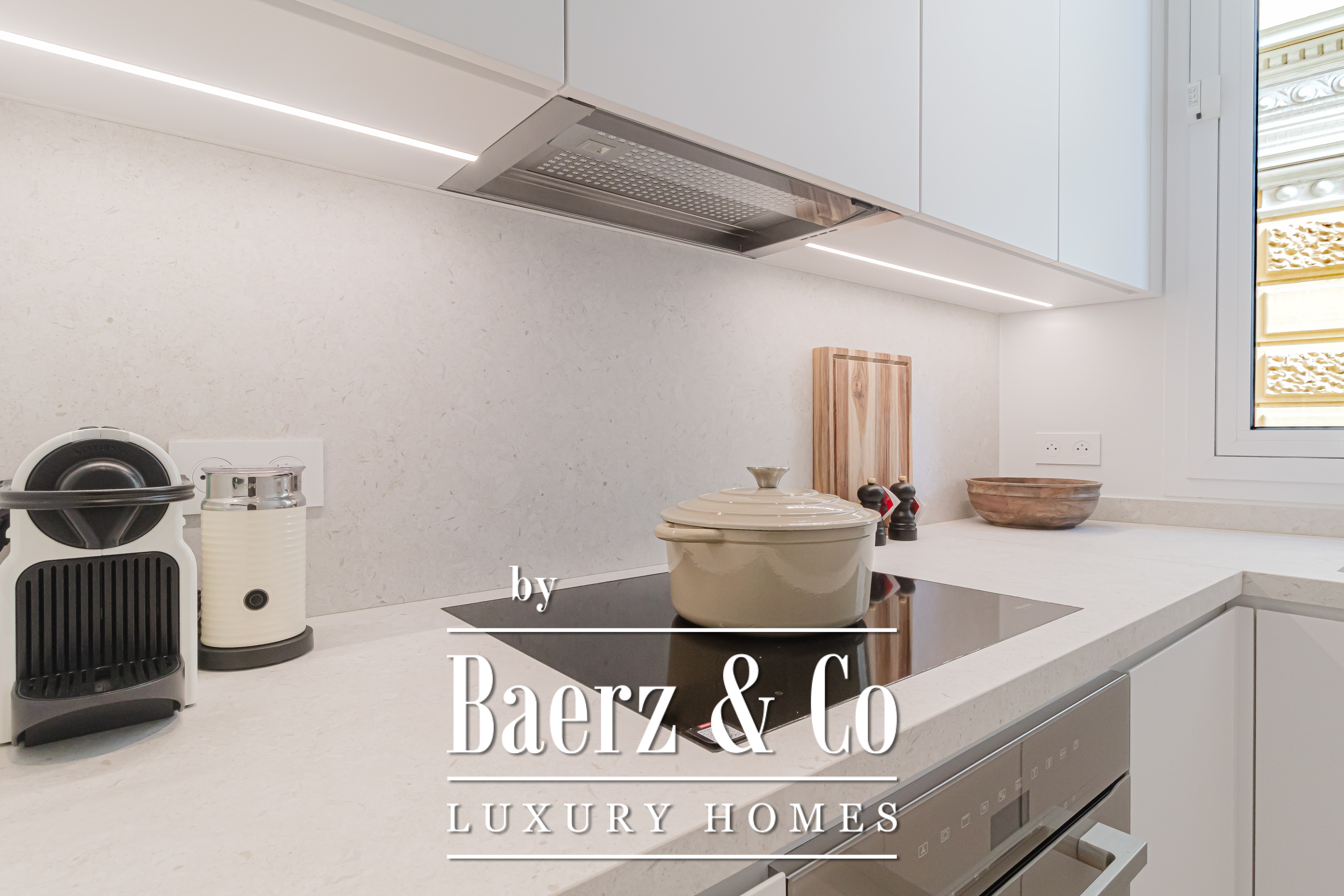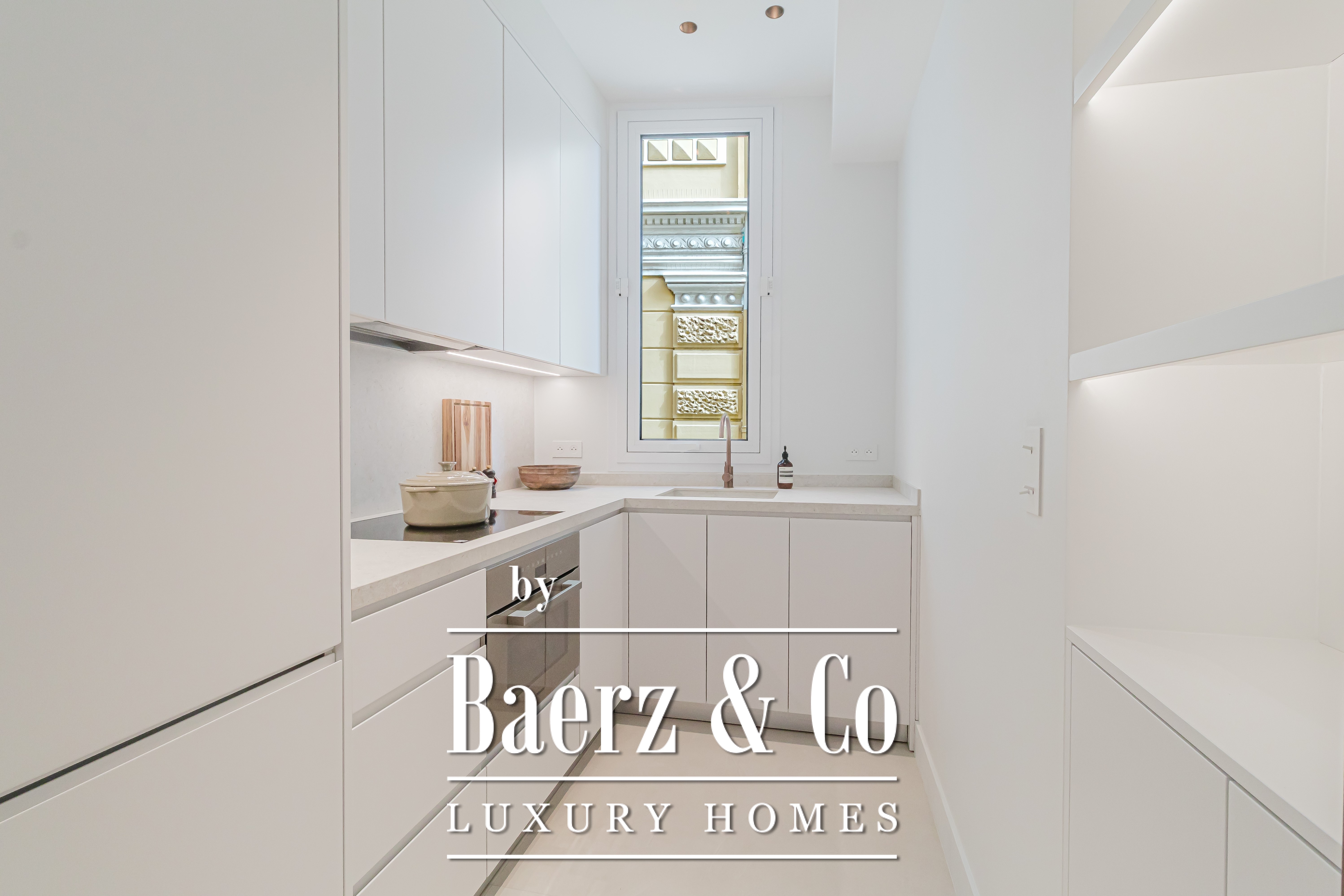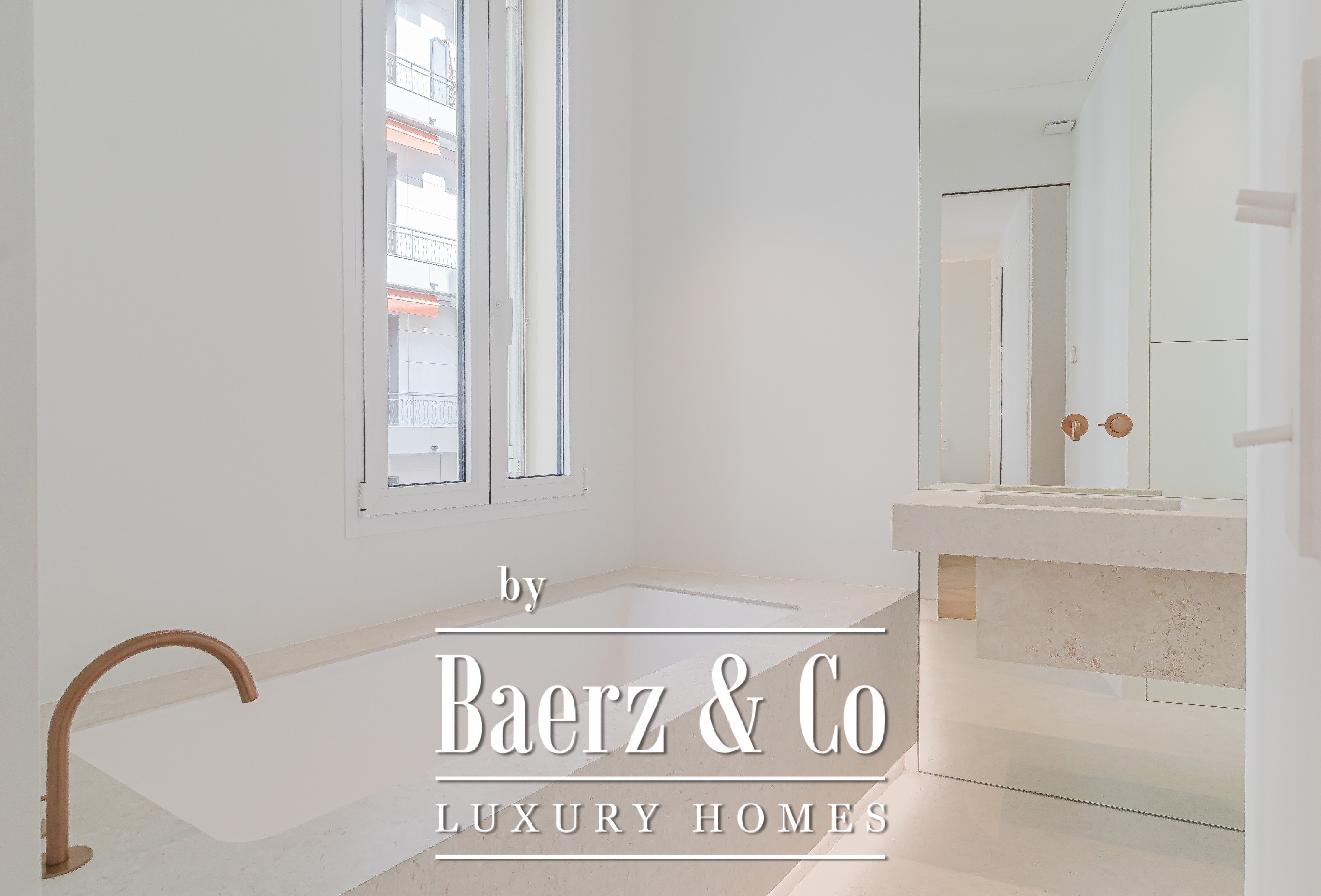 The property has been thoughtfully renovated and currently features two bedrooms and two bathrooms. The generous double living room opens to a private balcony, while a separate kitchen provides both privacy and functionality. Throughout the apartment, contemporary interiors are complemented by luxurious finishes such as a Corian bathtub, fitted wardrobes, new aluminium window frames, and dimmable LED lighting.