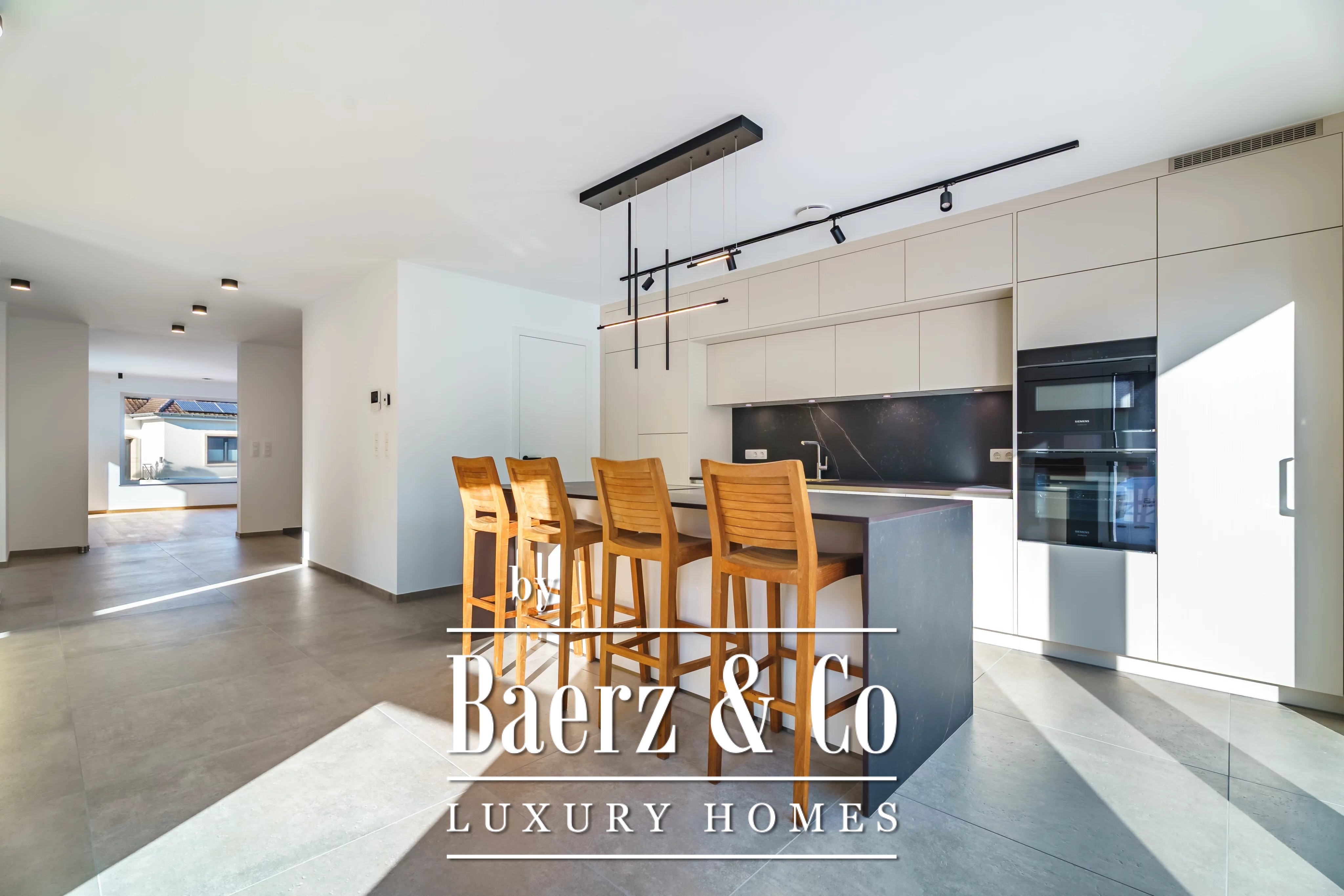 Triple glazing, sliding windows, electric awnings, and an advanced alarm system underscore a commitment to comfort and security throughout this A+ energy class home. The 40.45 m² double garage and videophone entry add further assurance. For those seeking a luxury single-family house for sale in Niederanven, this address articulates contemporary architecture with enduring discretion.