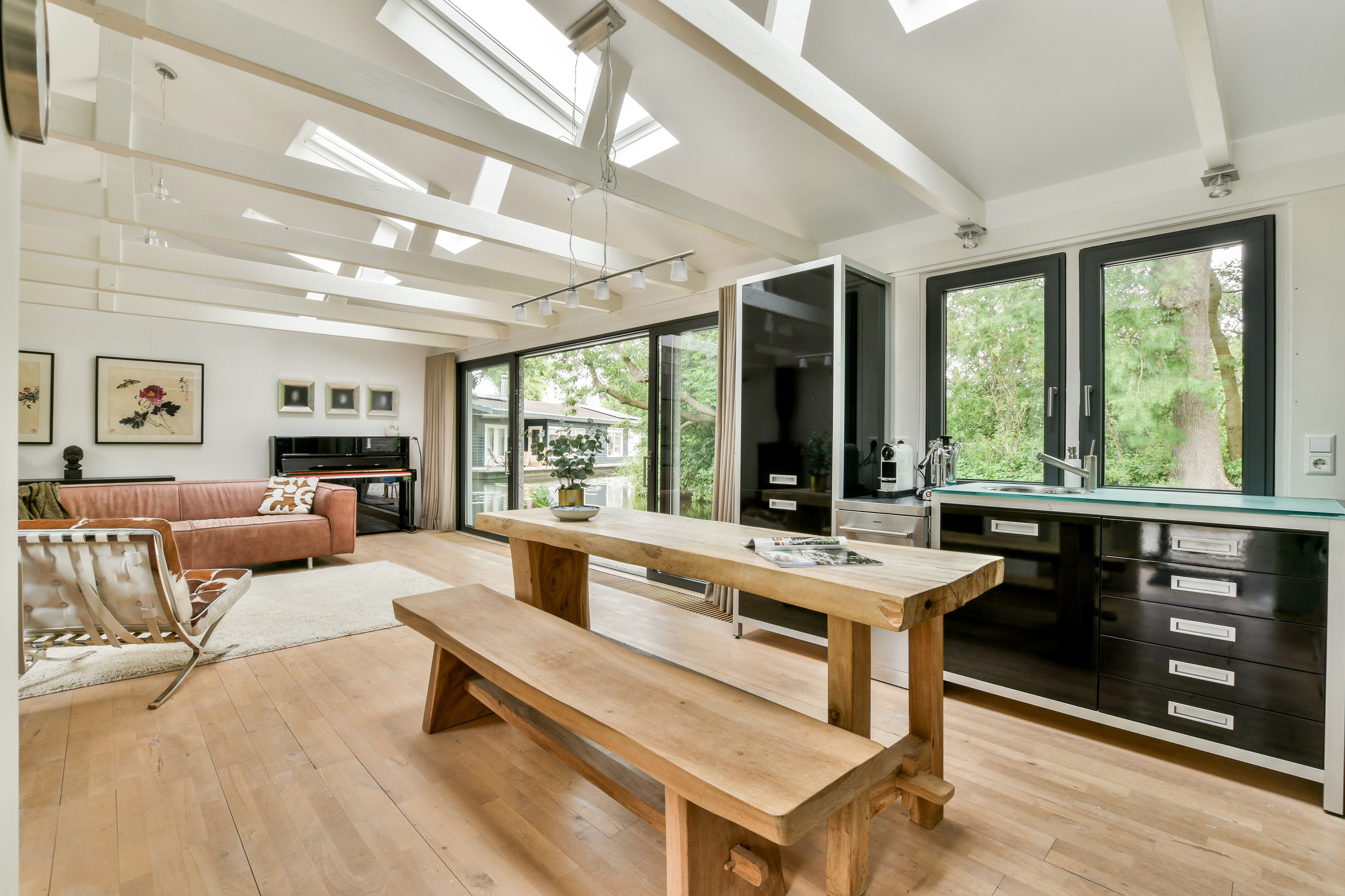 Through an electric entrance gate you enter the lush, private garden surrounding the houseboat. The boat has been fully renovated and stylishly finished, with large windows providing abundant natural light and continuous views of the surrounding landscape.