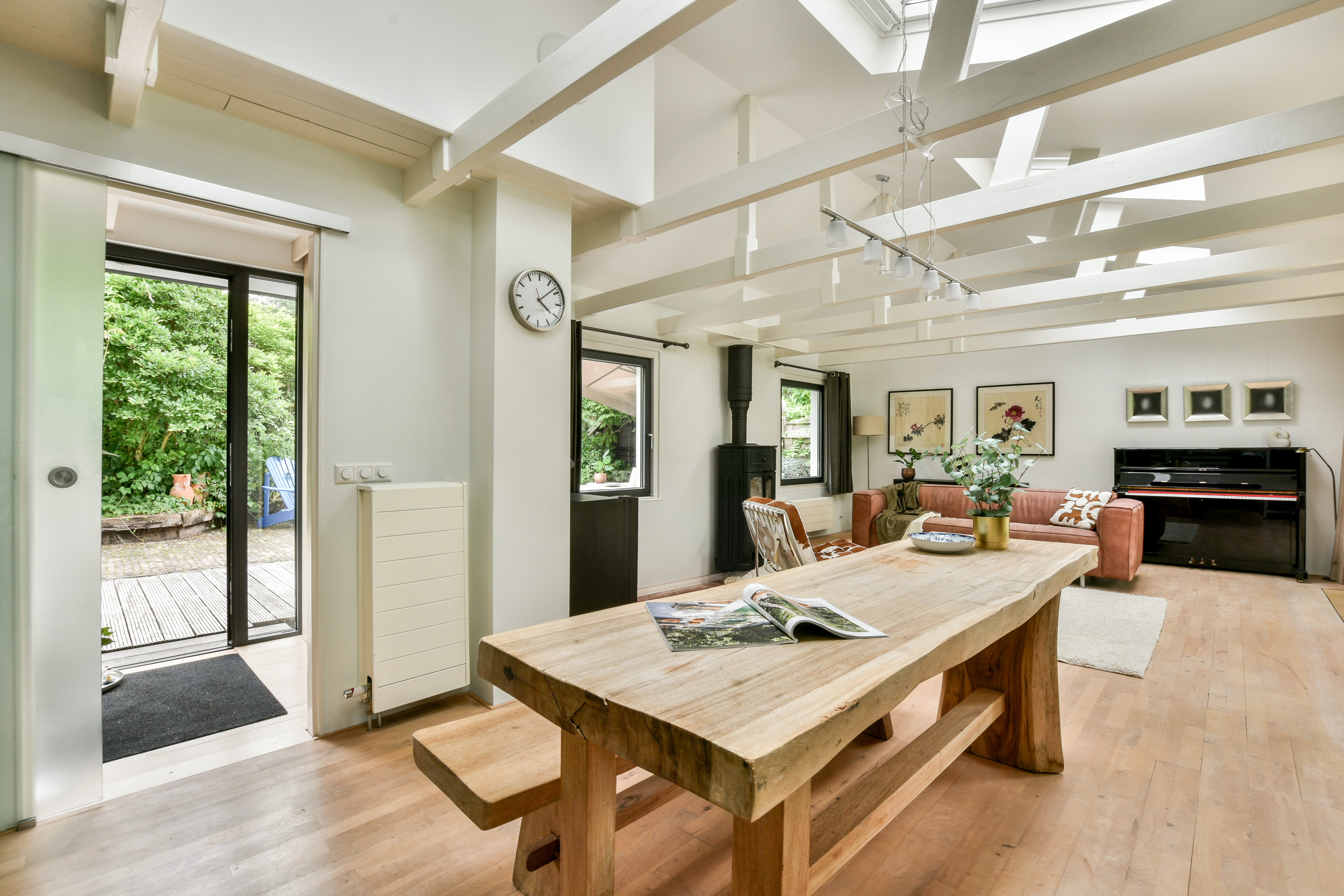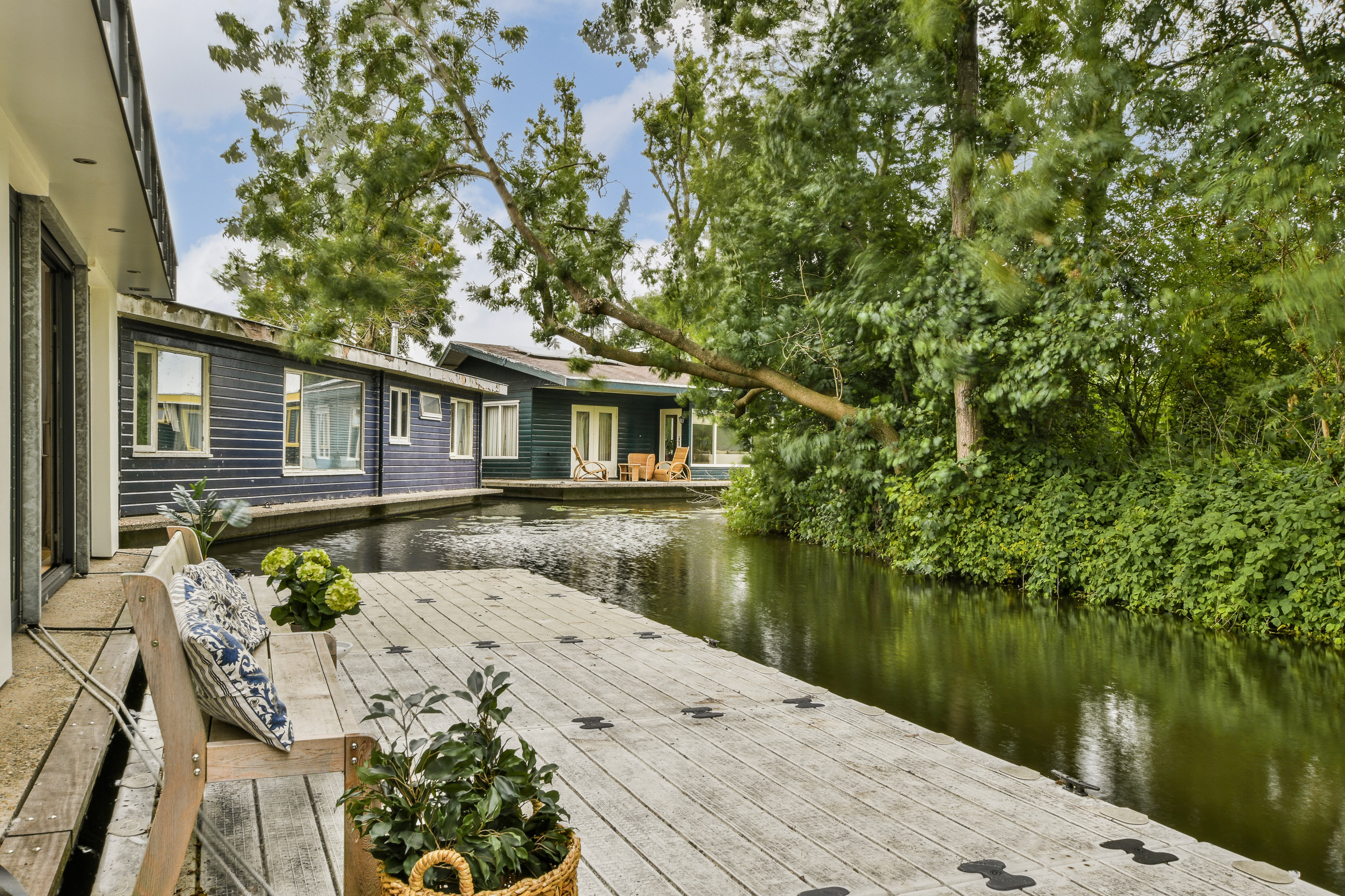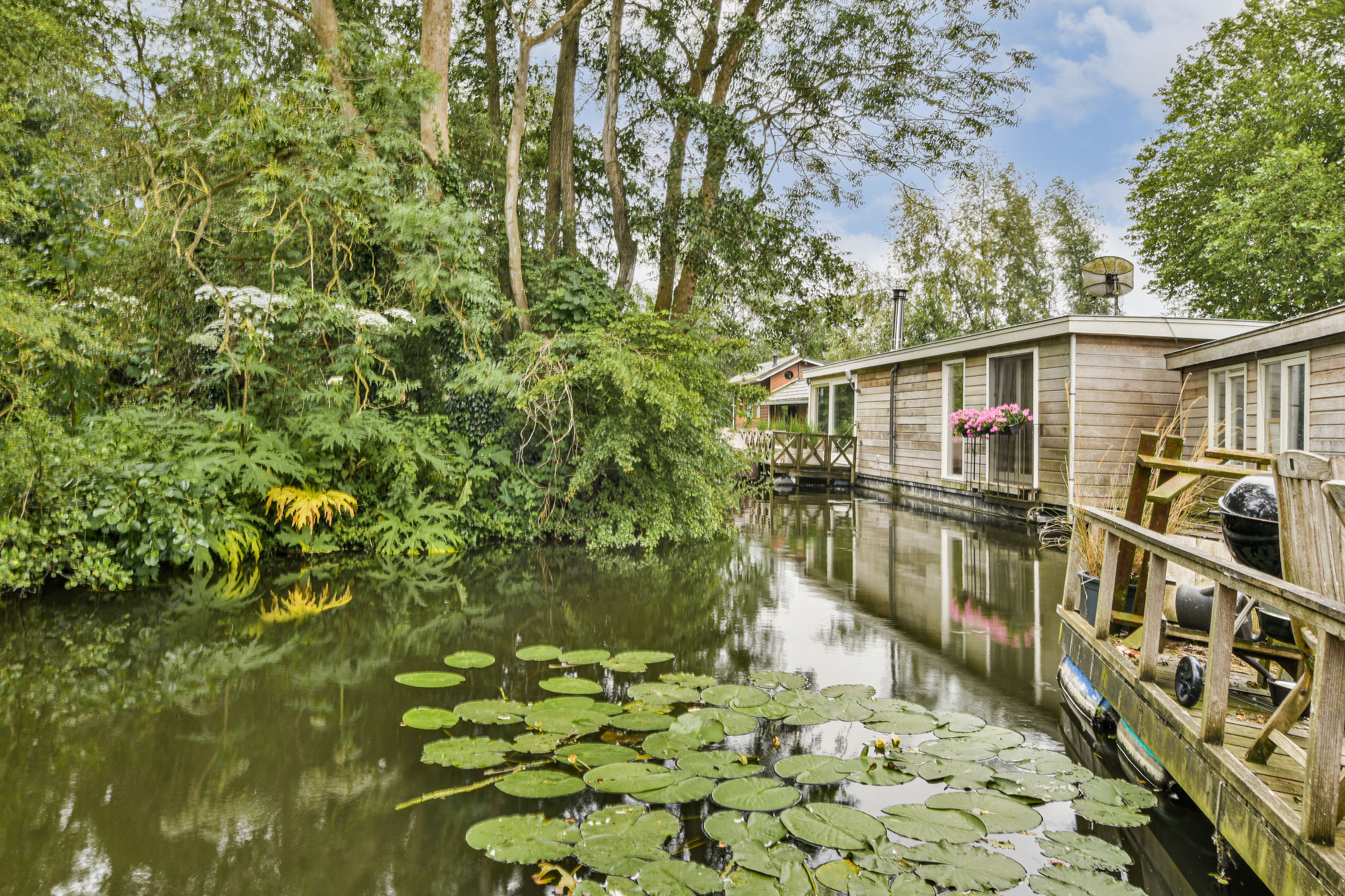 The garden surrounding the houseboat is well maintained and offers several places to sit, relax or dine outdoors. The spacious terrace directly adjoining the home forms a natural extension of the living space and is perfect for long summer evenings or peaceful mornings in the sun.