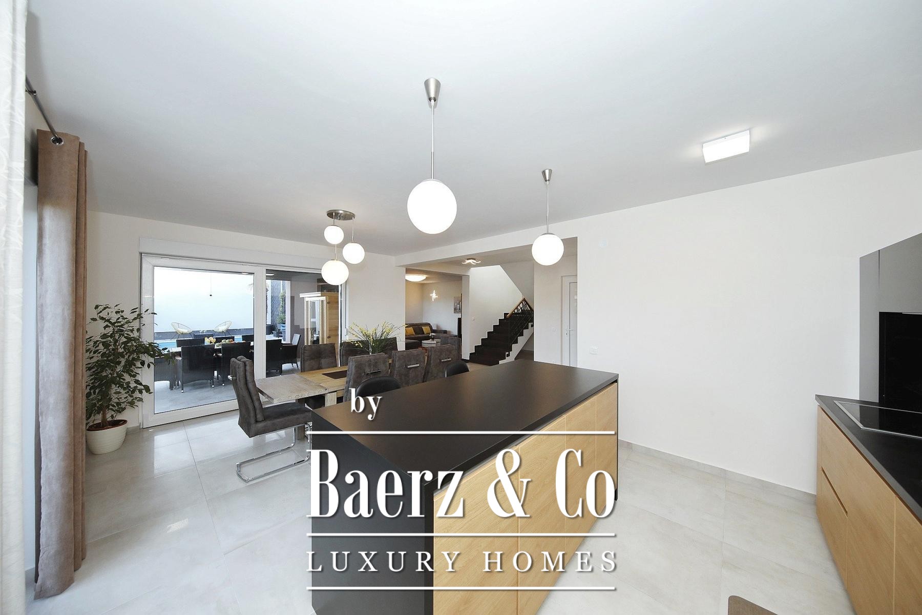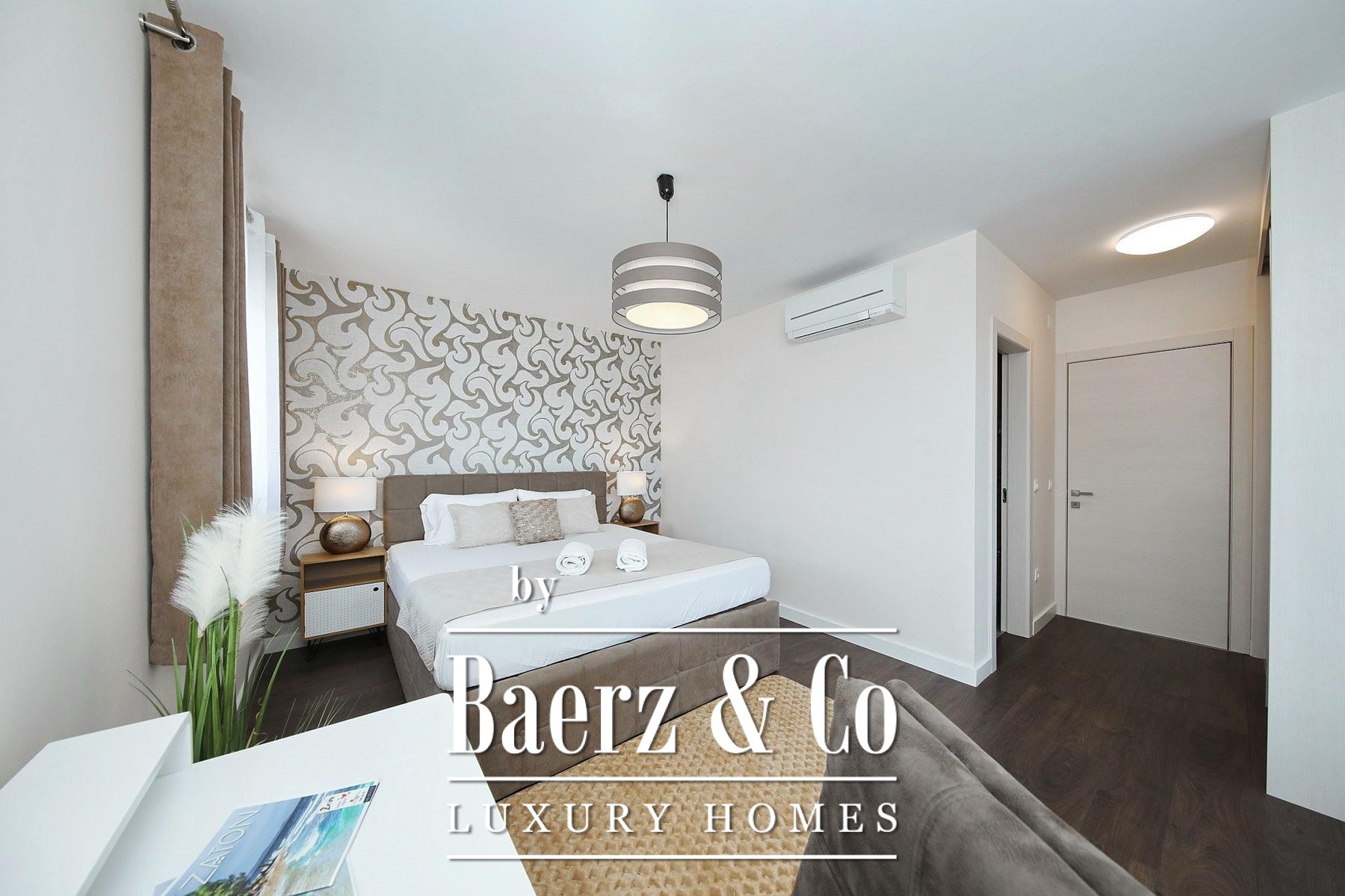Inside, an open layout prevails. The ground floor of each villa holds an expansive kitchen, dining, and living zone, measuring 50.15 m², leading to sheltered outdoor spaces. Carefully delineated bedrooms, ten in total, are arranged for privacy, each with an en suite bathroom. Upper rooms feature access to covered terraces, extending the living area into sunlight and coastal breezes. With thoughtful separation of living and private zones, and a setting rooted in the center of town, these modern villas offer a composed retreat in Nin for those seeking understated luxury with every element considered.