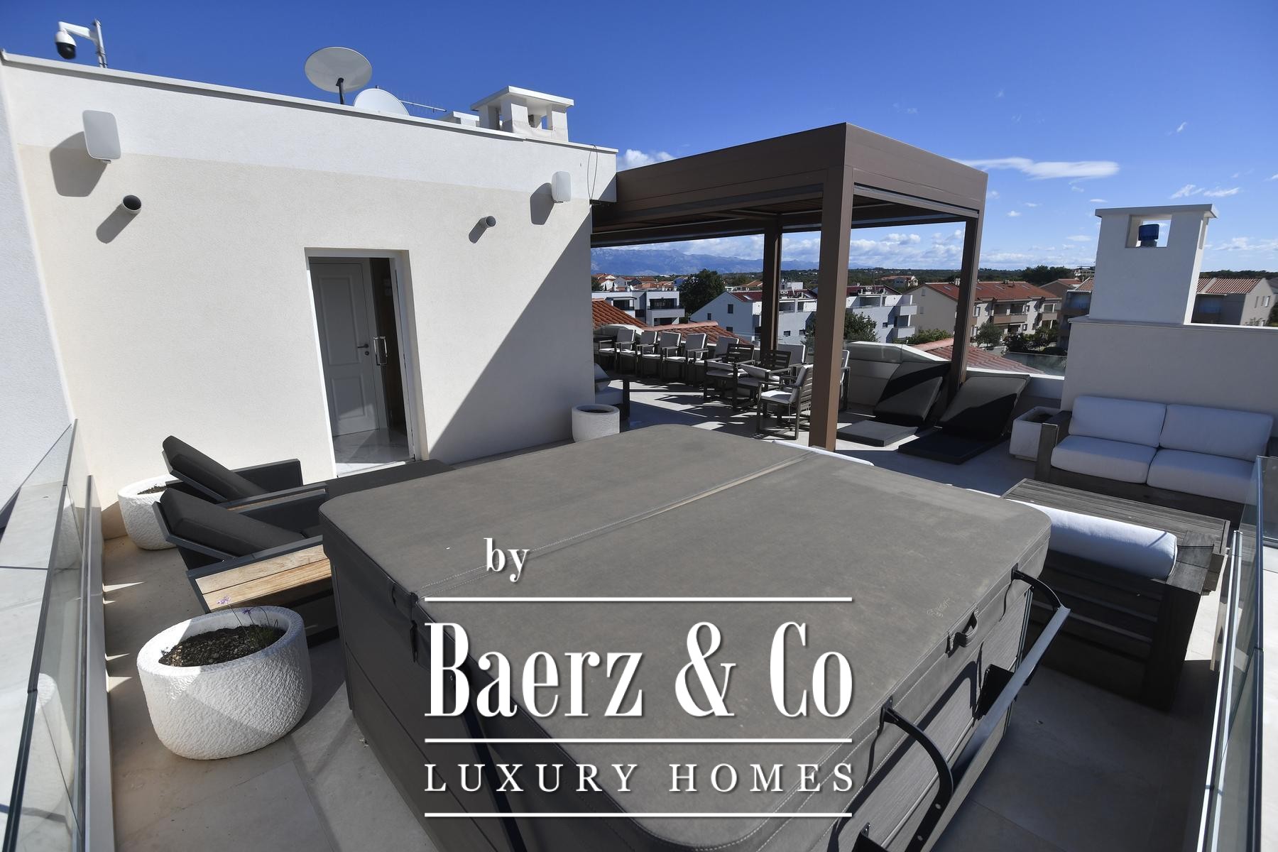The kitchen, fitted with Miele and Liebherr appliances and quartz worktops, embodies functionality and craft. Four bedrooms and four bathrooms occupy the upper level, each space unfolding in calming neutrals, natural stone and wood. The private roof terrace stands apart—generous, intimate, and appointed with a bioclimatic pergola and jacuzzi, offering panoramic views across Zaton and the Adriatic horizon.