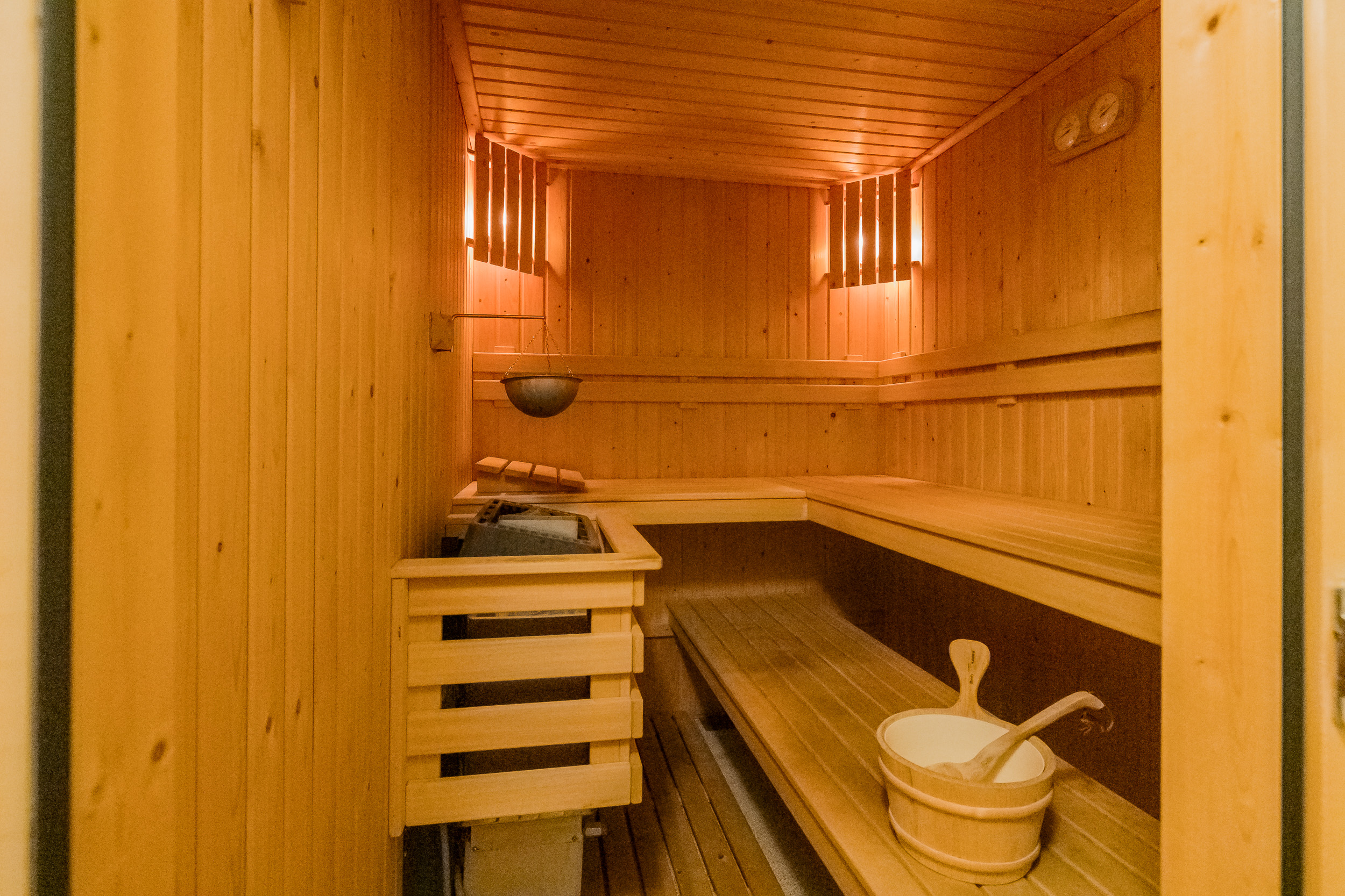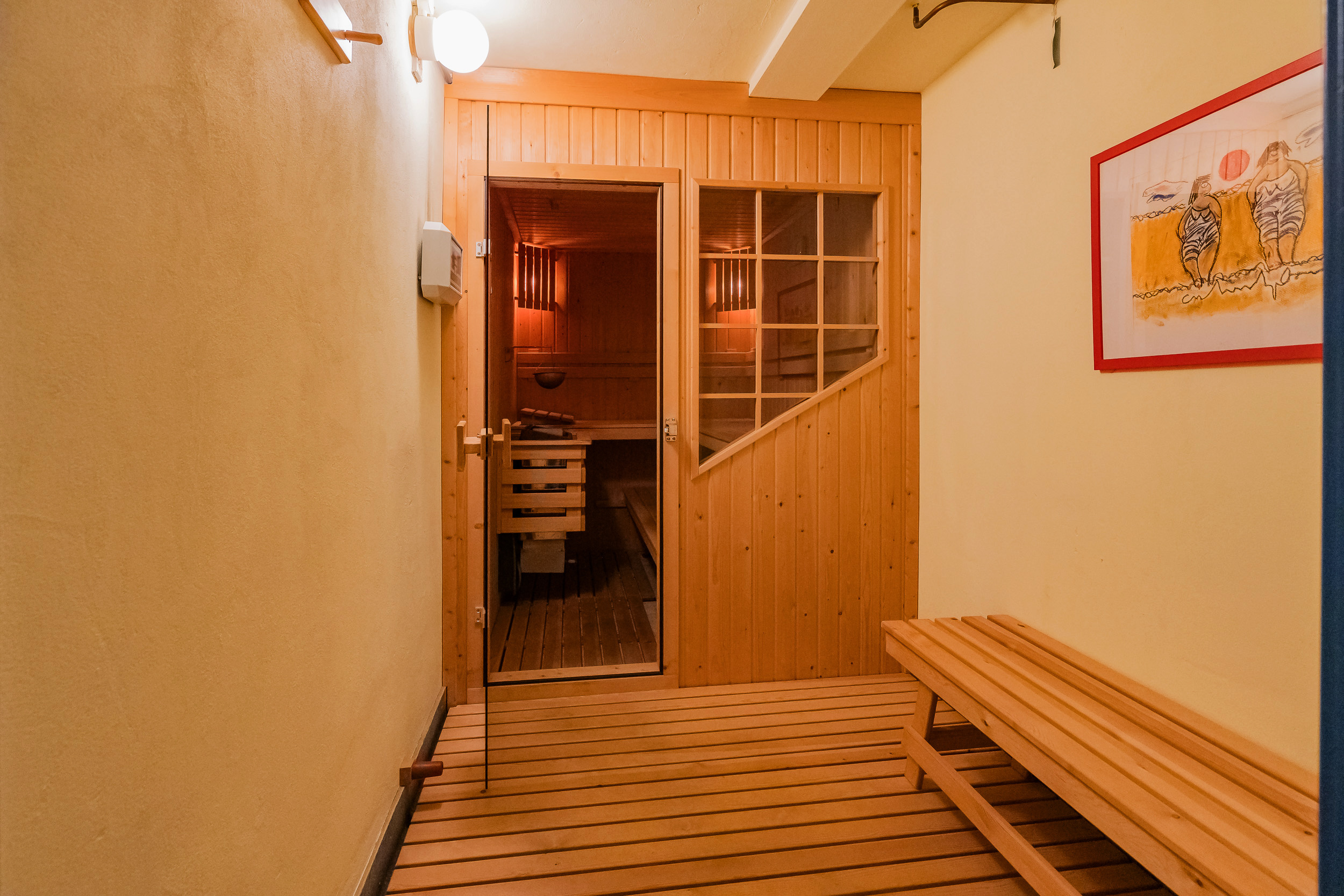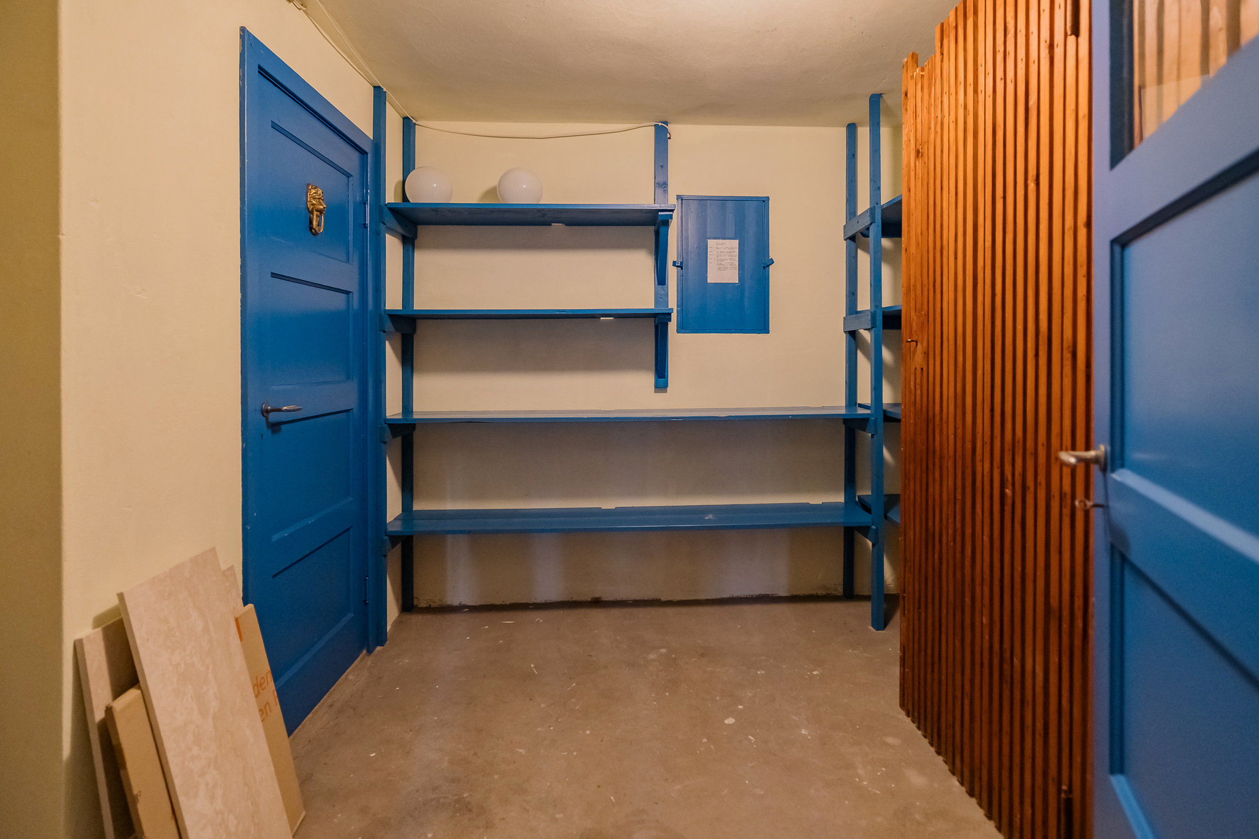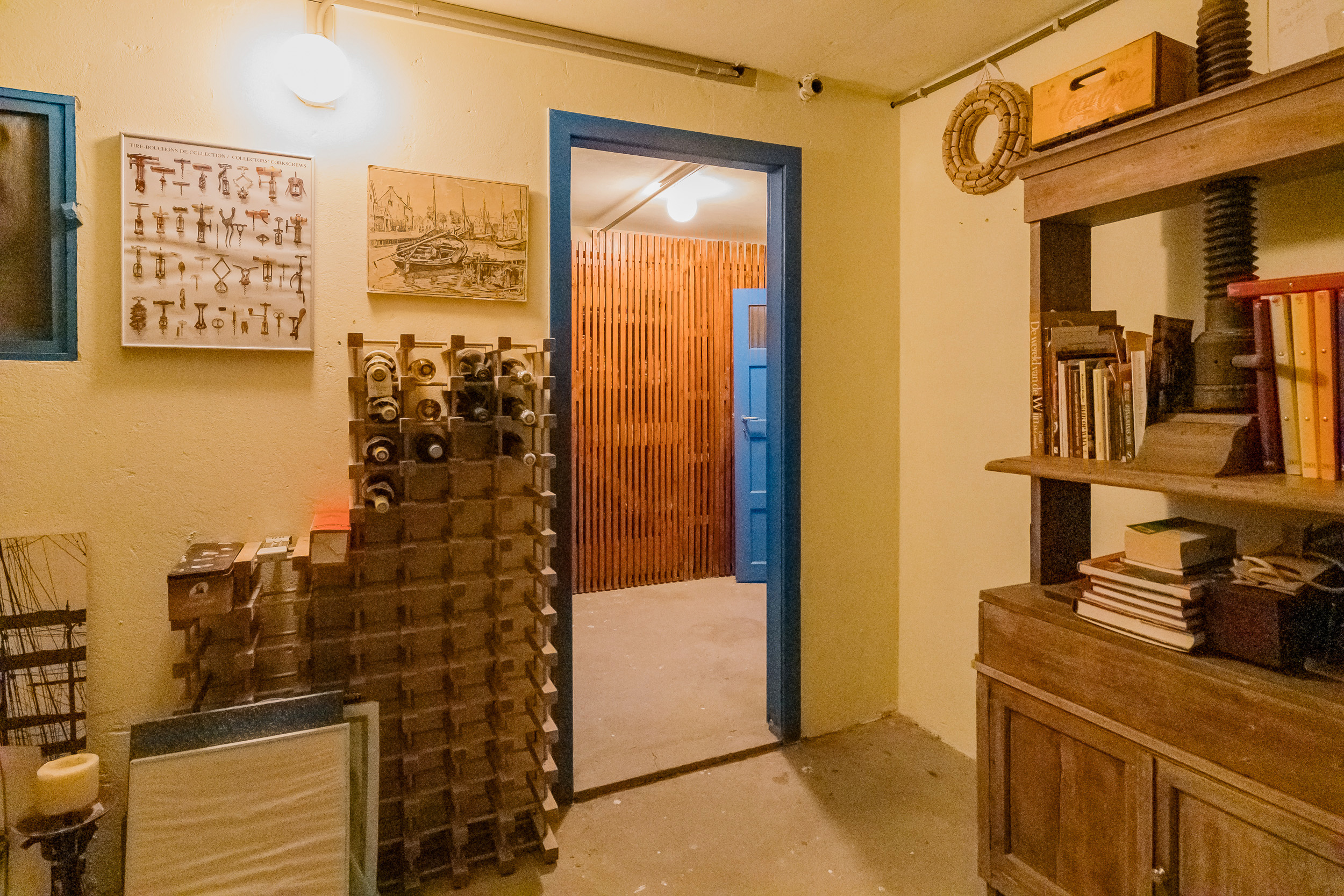 The home features a full basement. Here you will find the sauna with a steam room, the charming wine cellar built with lava stone, spacious storage areas, the garage with French doors, and a door leading directly to the garden.