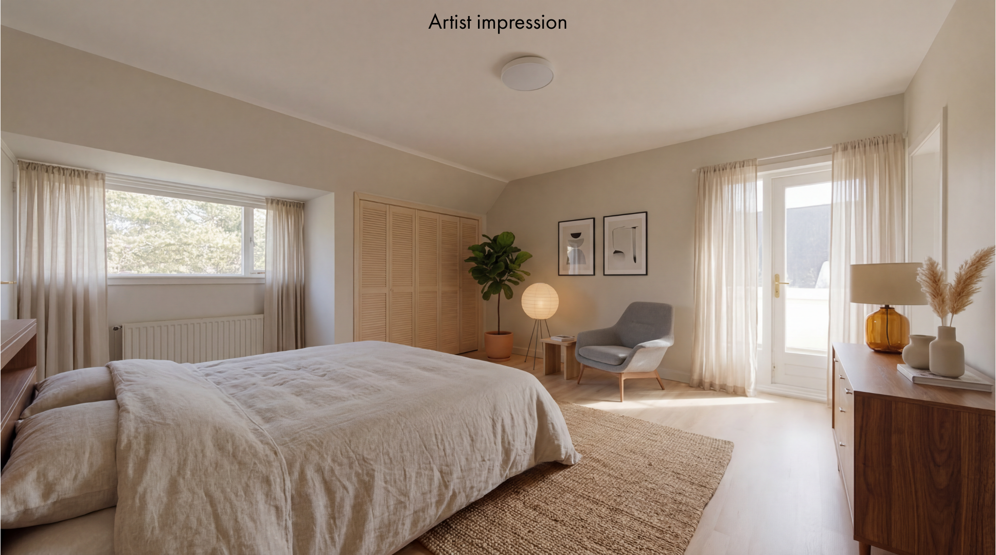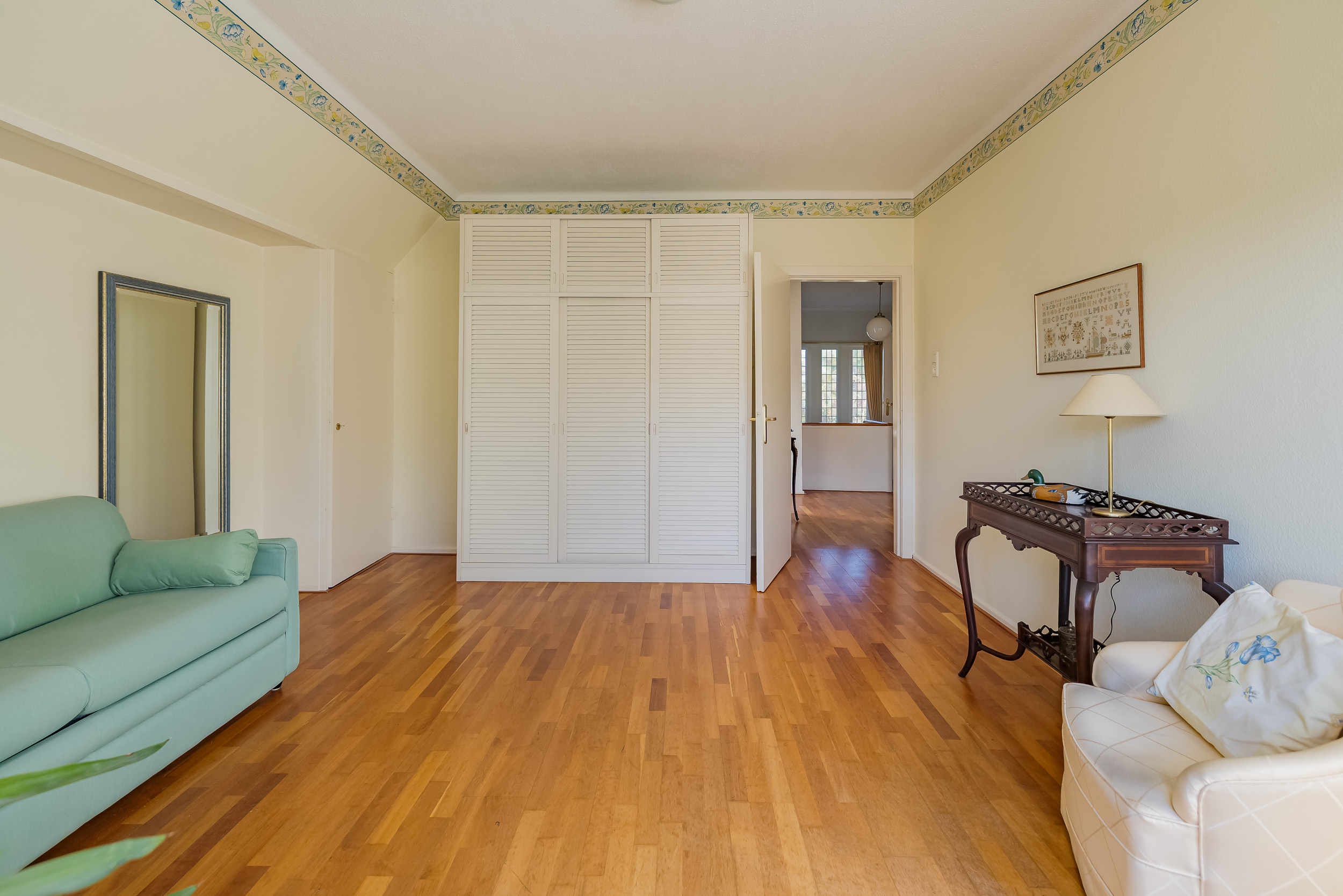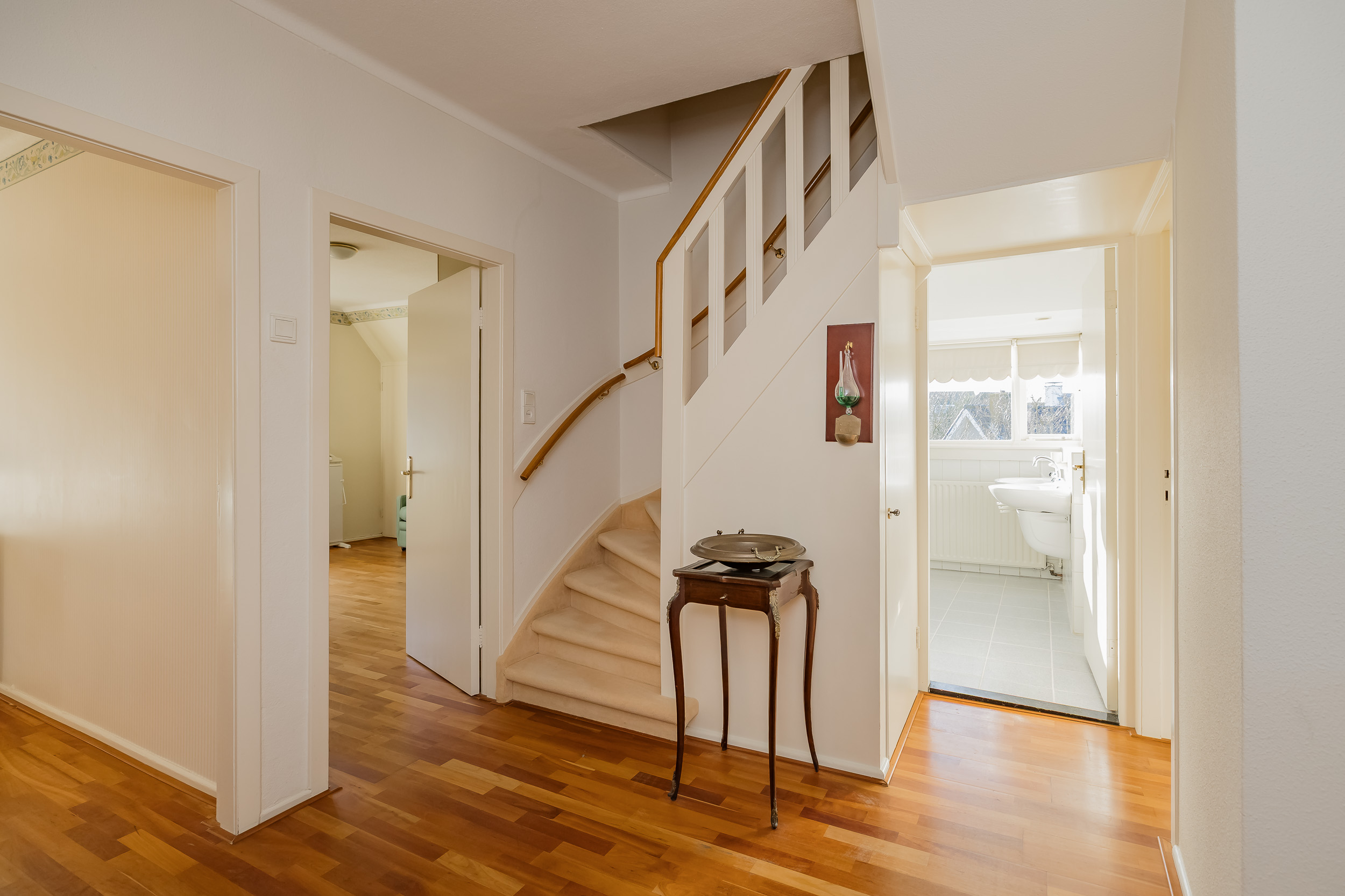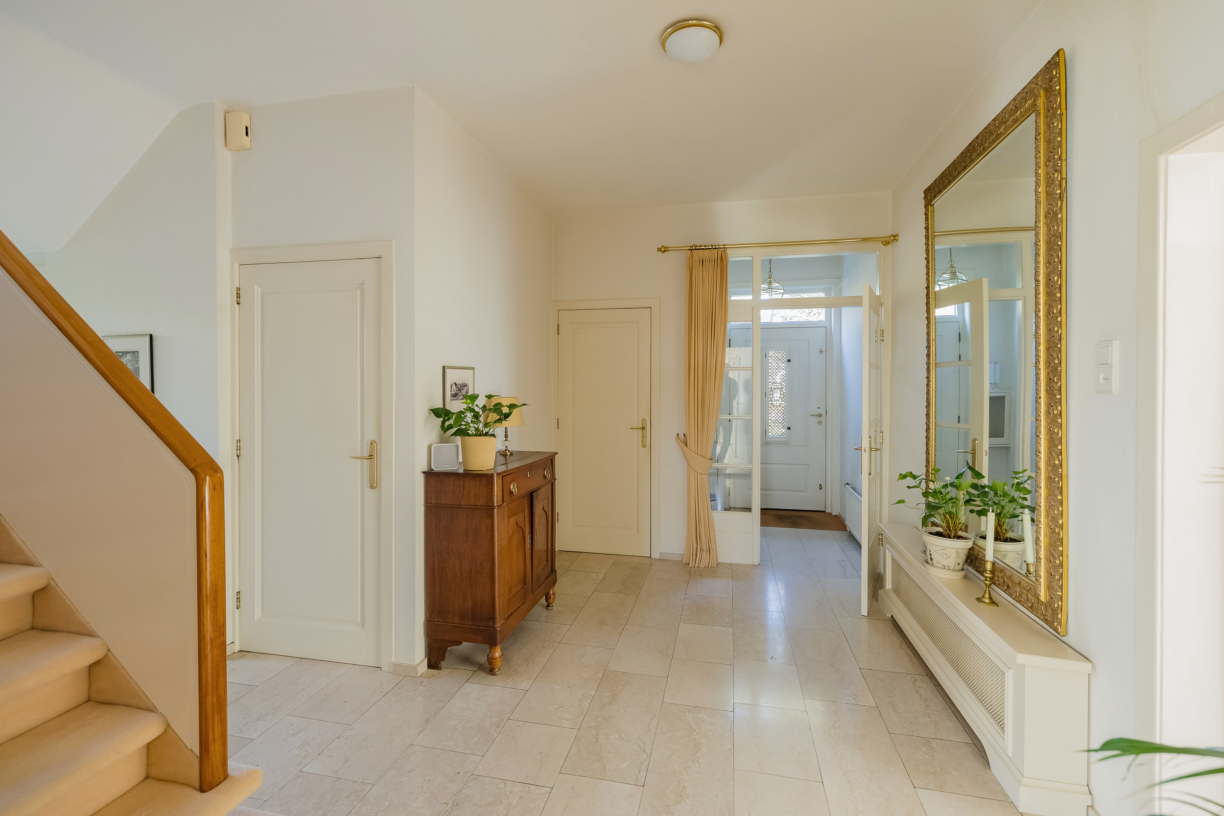 The spacious living room is a delightful living space with a warm, inviting atmosphere. The fireplace and elegant marble floor give the room character, while the doors from the living room provide direct access to the garden. The sun circles the house from morning to evening, creating a beautiful play of light.