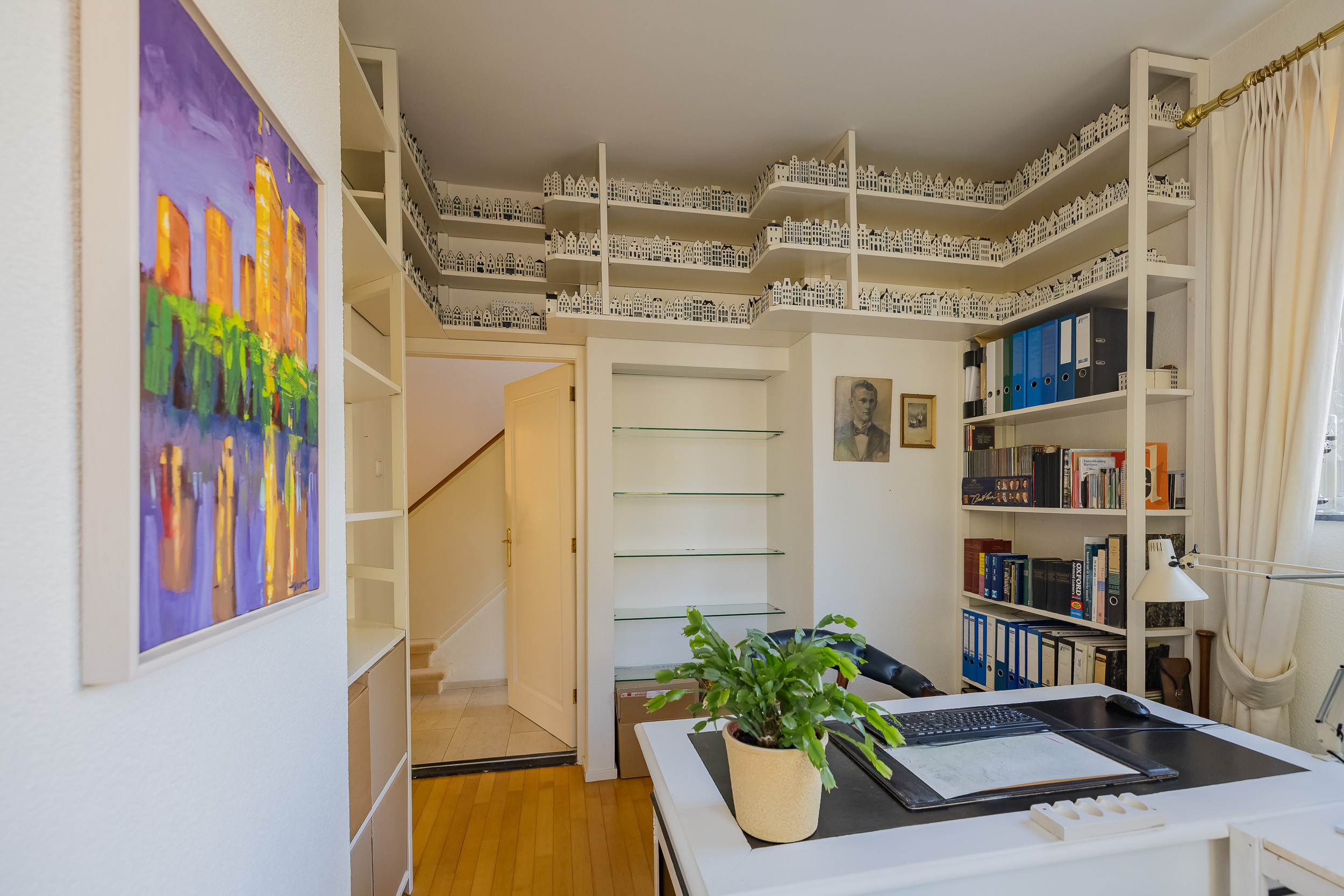 Also on this floor, you’ll find a well-equipped home office with custom cabinets and a utility room/storage area featuring a loft ladder leading to the spacious attic with headroom, which offers additional storage space above the entire utility room.