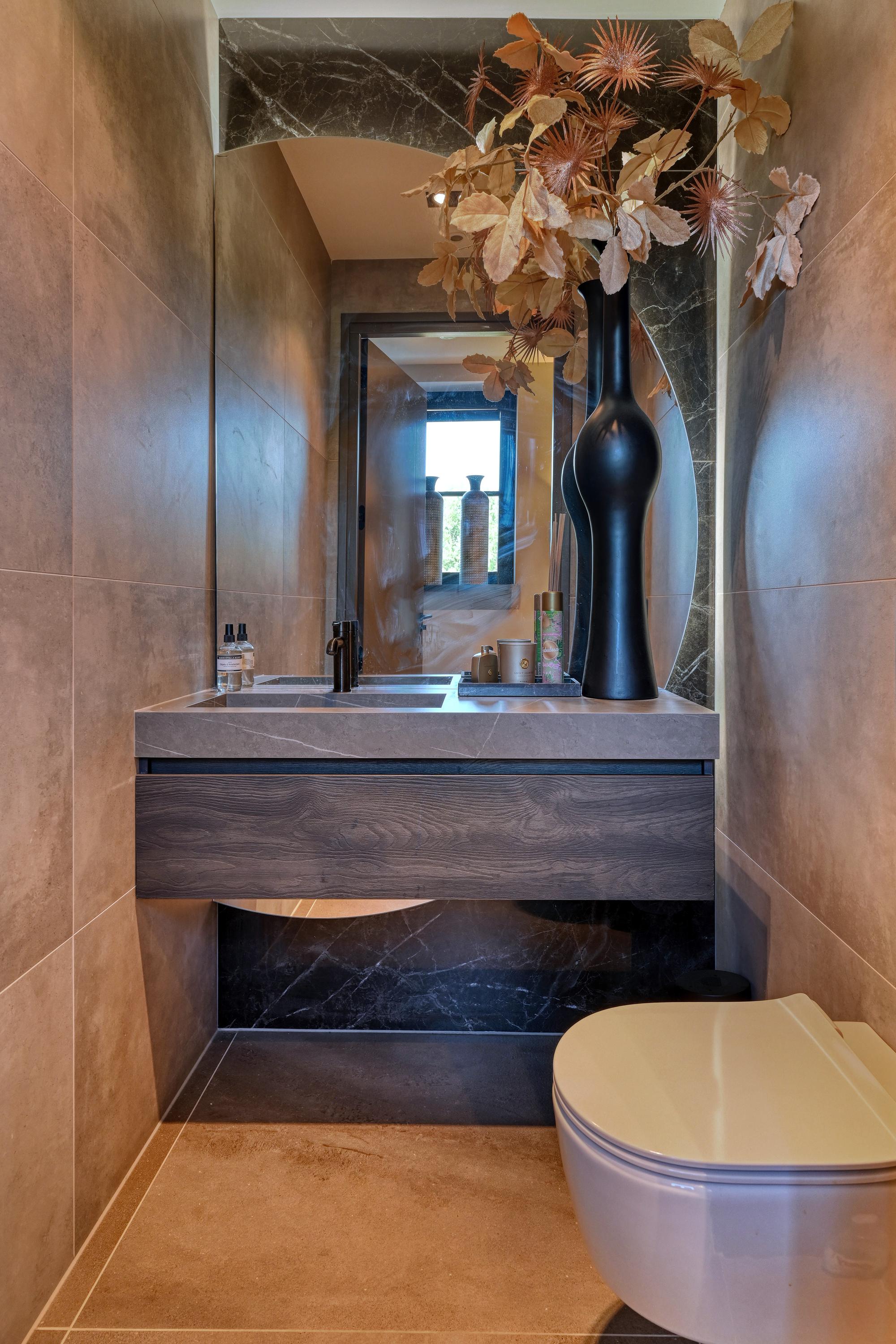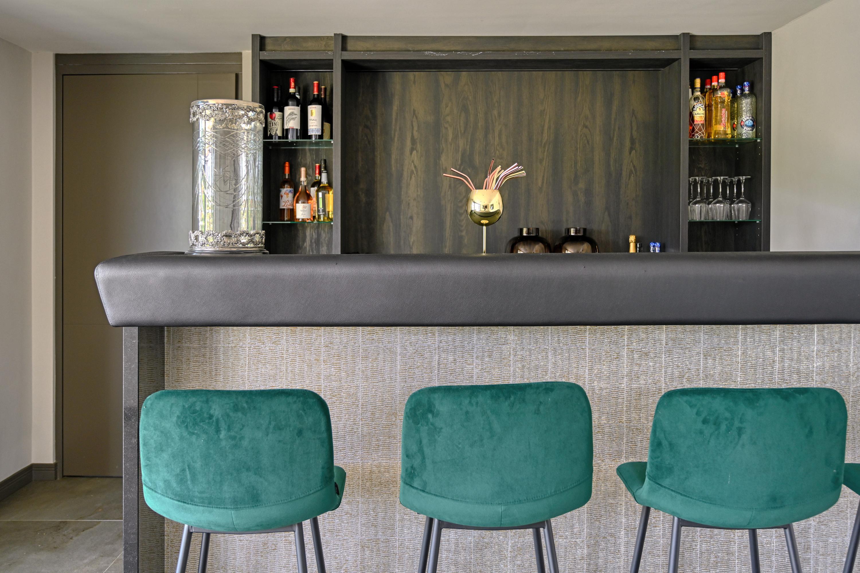 The garden features a beautiful outbuilding in the same style as the villa. It houses a spacious pool bar with a pantry, a private restroom, and a convenient storage room with an electric door, offering ample space for storing bicycles and gardening equipment.