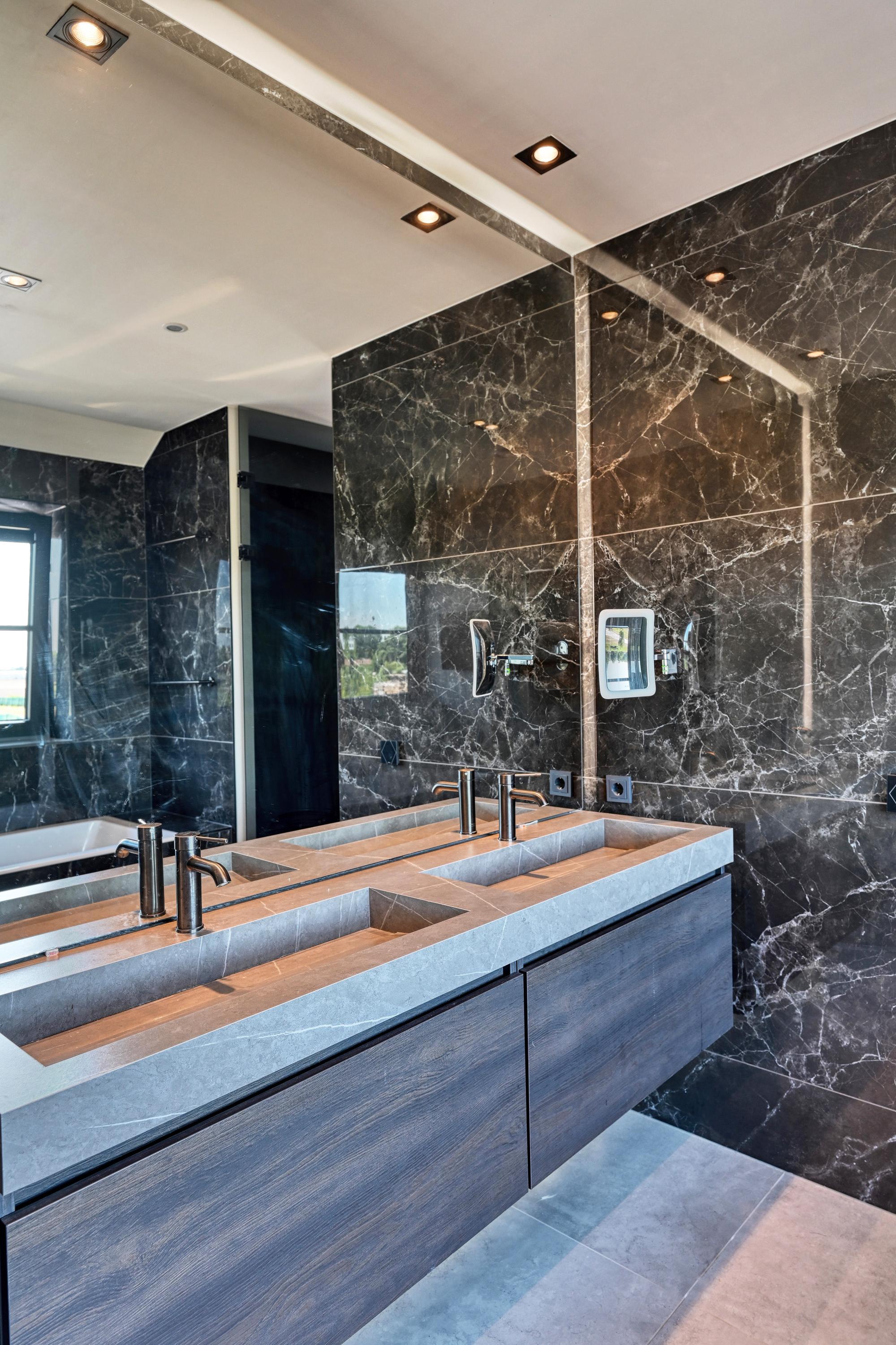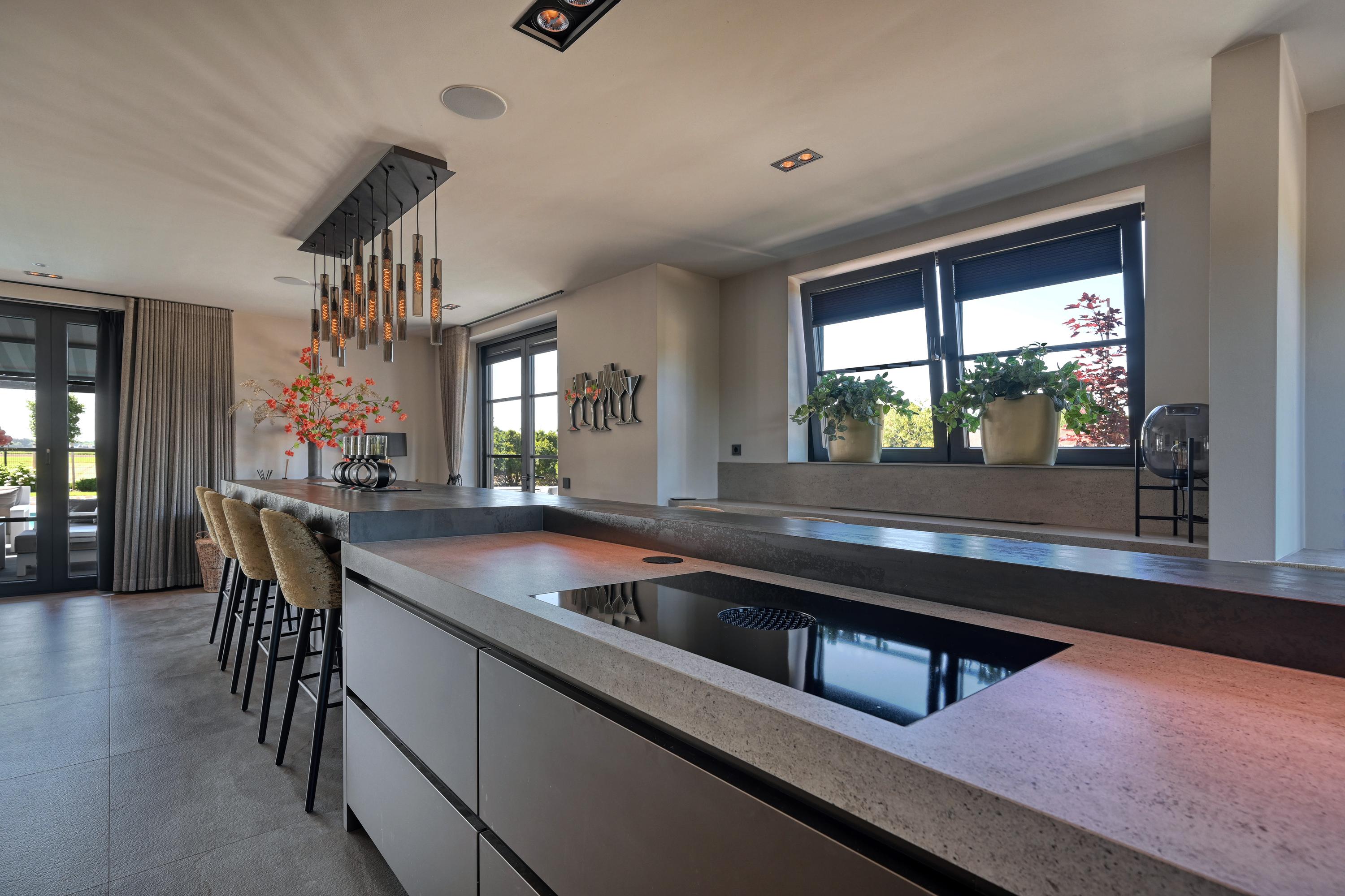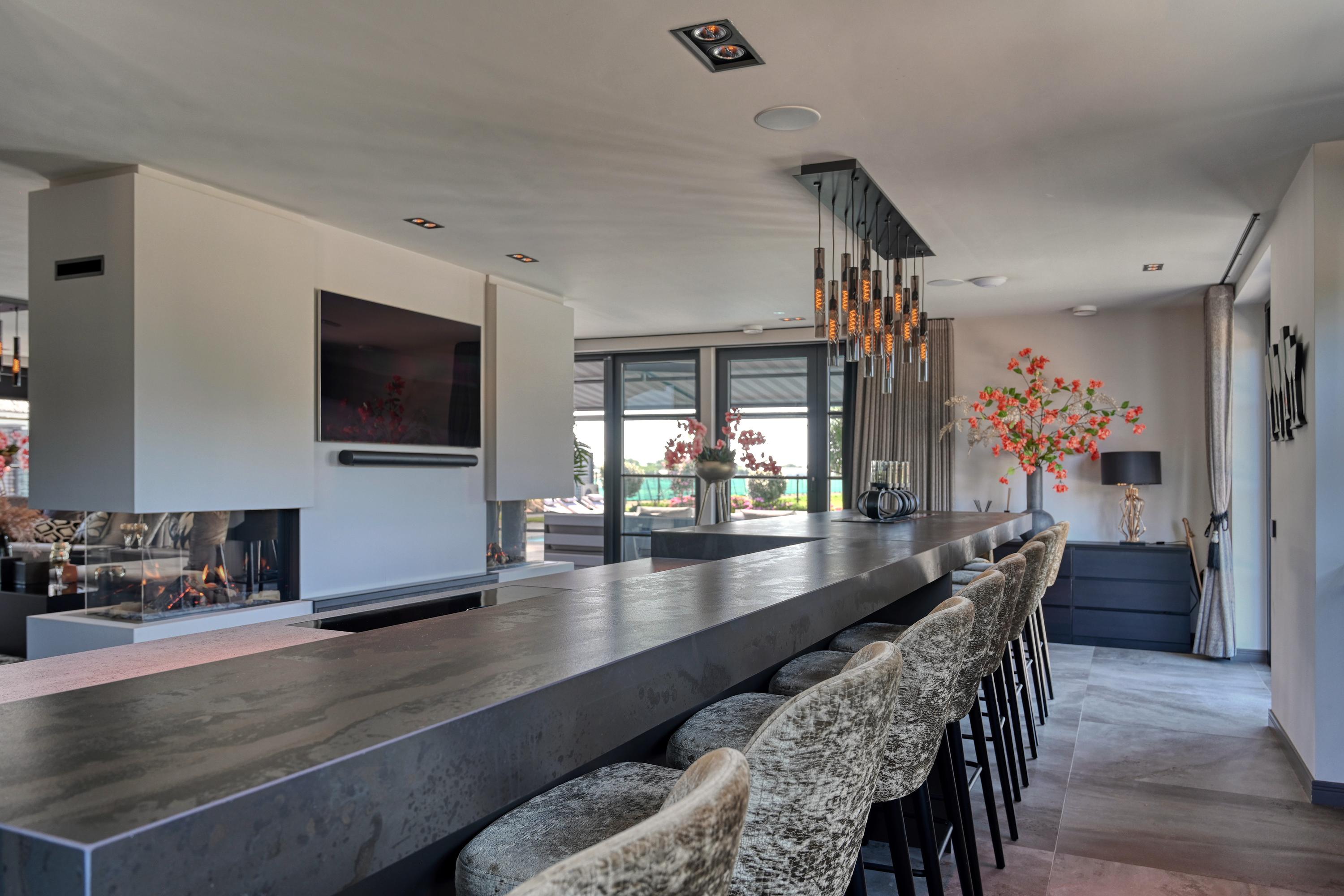 The adjacent kitchen is very generously laid out with a large cooking island and a long breakfast bar, creating a lovely spot for socializing. Equipped with professional appliances such as two refrigerators/freezers, two ovens, two combination microwave/ovens, a spacious induction cooktop with an integrated Bora exhaust system, two dishwashers, and a Quooker for boiling, purified, and sparkling water, this kitchen is truly equipped with every convenience.