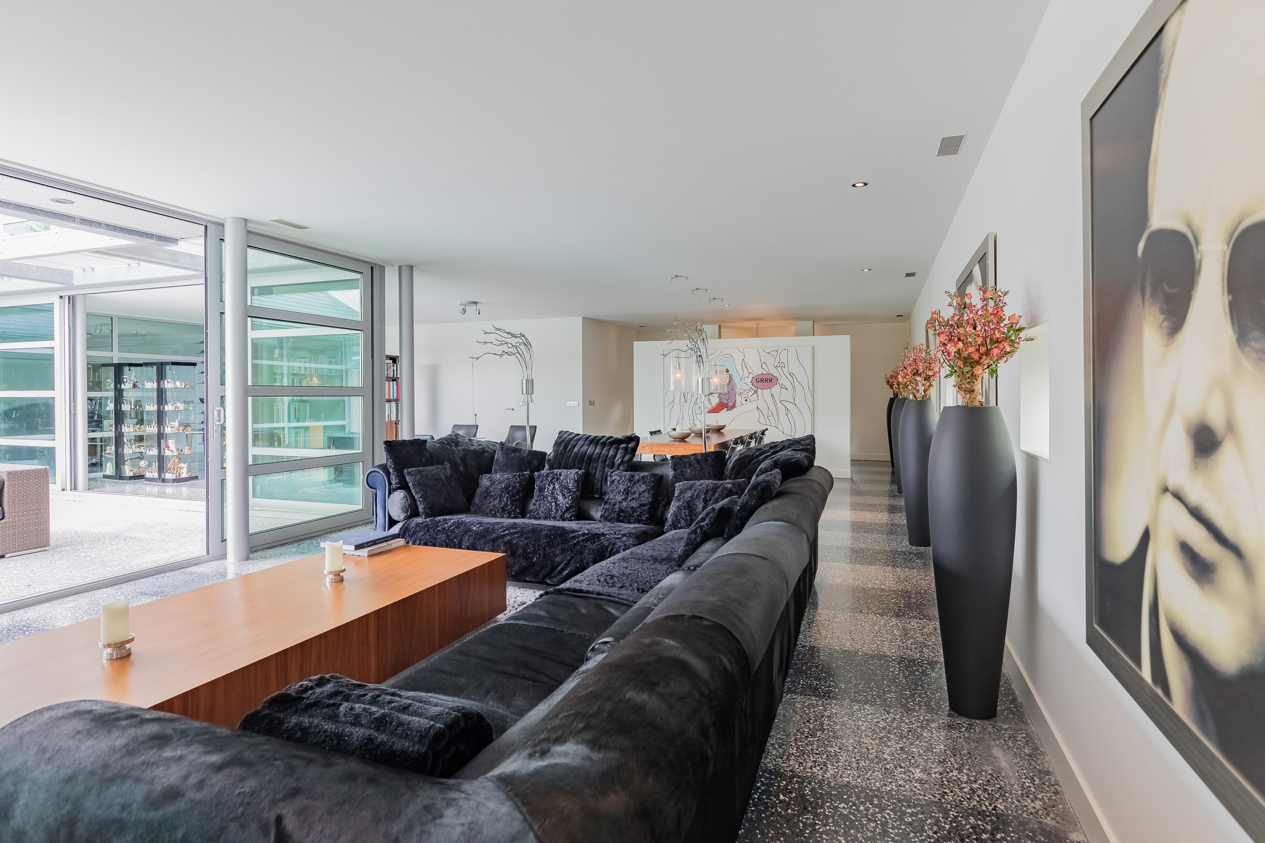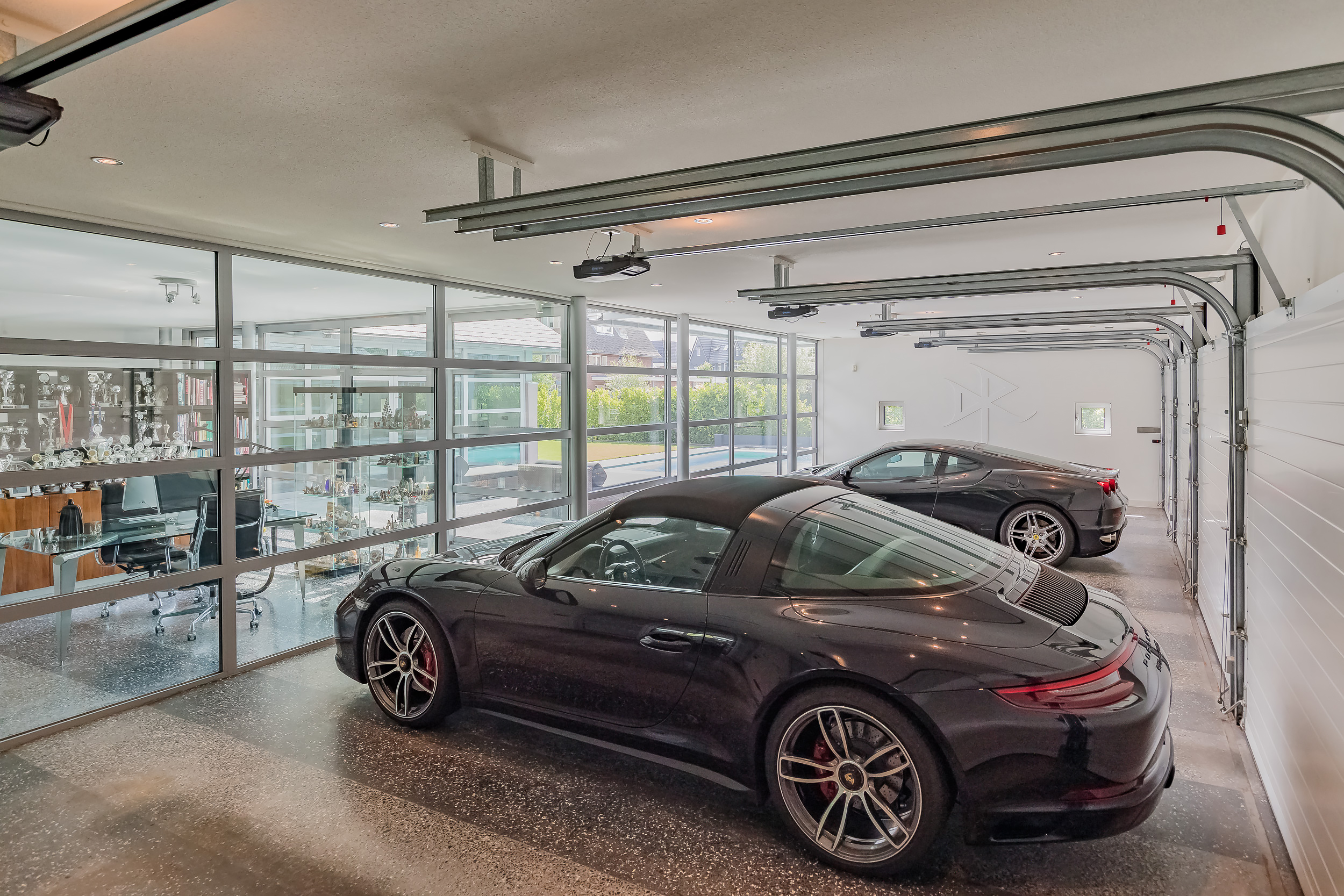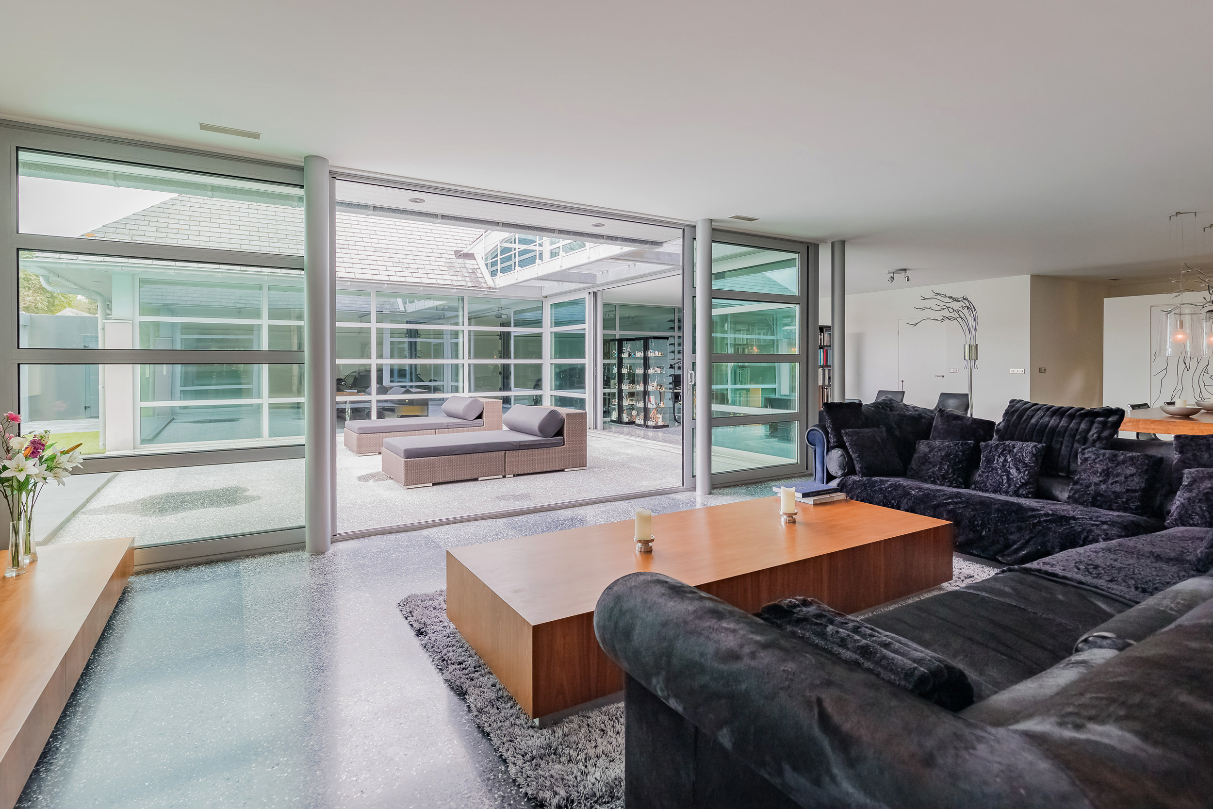The indoor garage of 76 m2 is fully insulated and also here the terrazzo floor has floor heating. The glass inner wall is easily removed so that the entire first floor becomes one space. The living area thus comes to 356m2 (€ 7.008,43 m2)