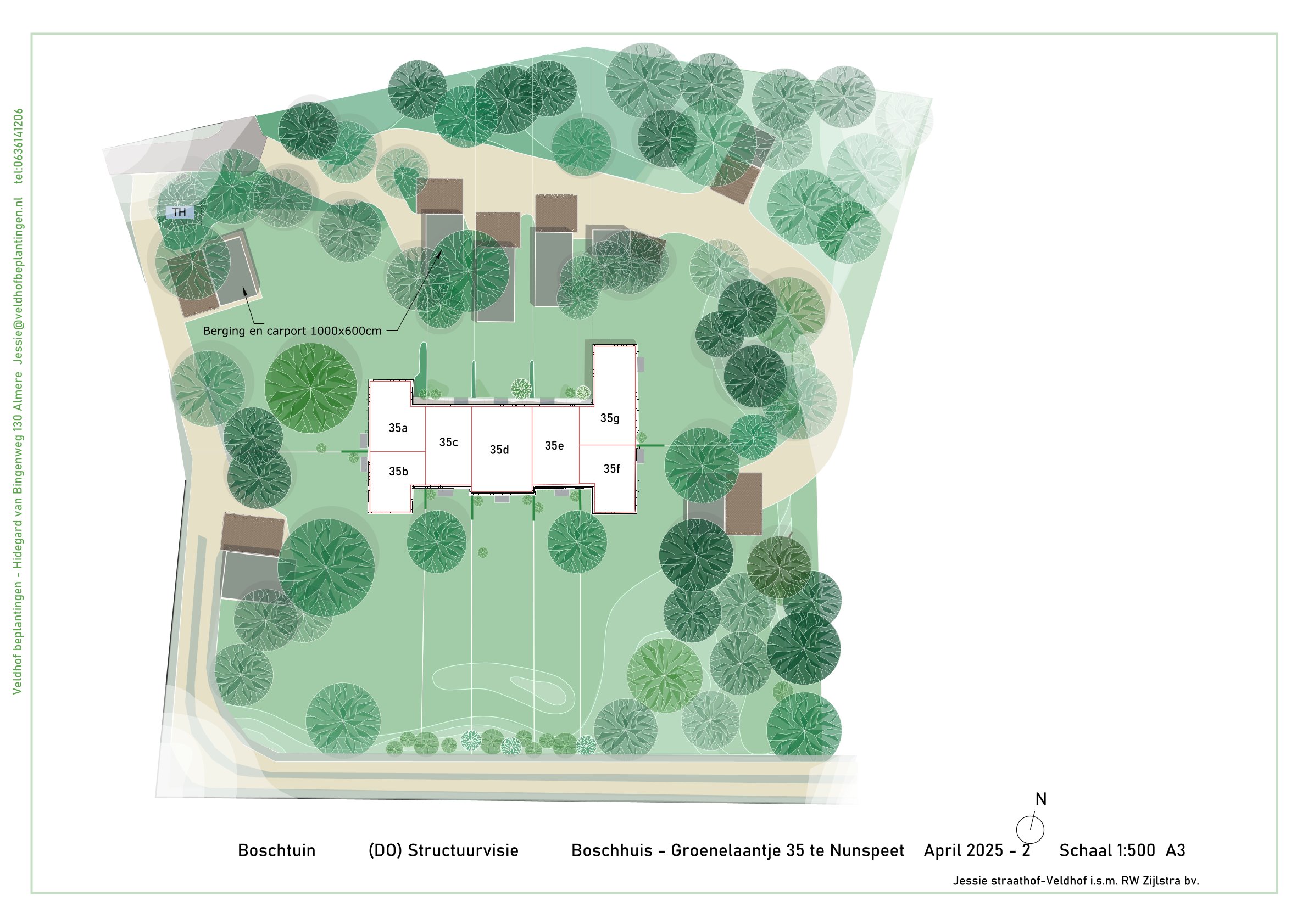 - Parkeergelegenheid: nieuwe houten garage (circa 24m²), dubbele carport (circa 35m²) en nog twee extra parkeerplaatsen.