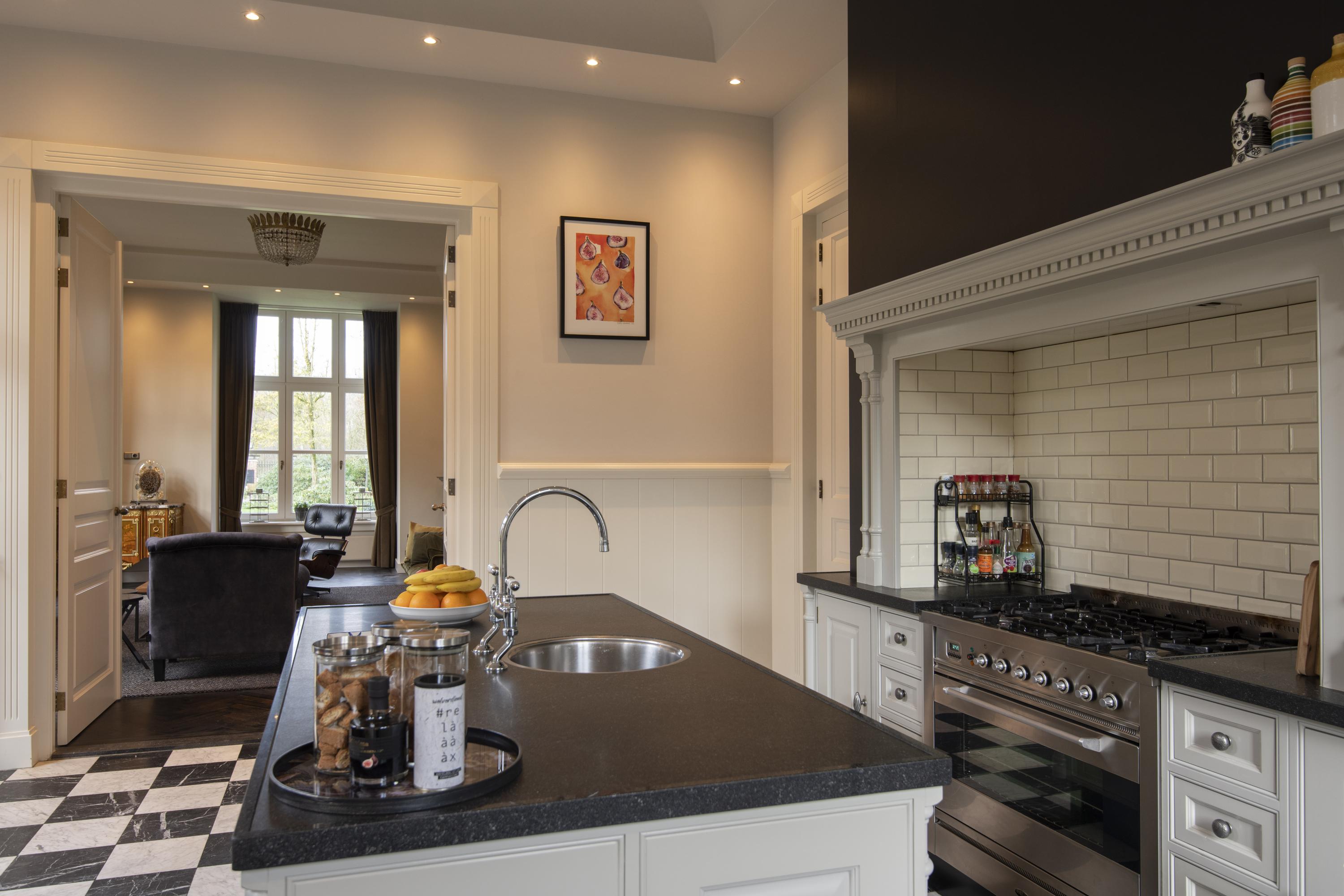 The completely nature-oriented living room consists of a sitting room and a dining room. There are two fireplaces and four pairs of French doors to the garden. The 3.60m high stucco ceilings combined with the amount of light through the high windows create a magnificent spatial experience. Double doors lead into the cozy eat-in kitchen. This fully equipped kitchen is furnished with a classic Tinello kitchen unit with a natural stone worktop, sink island and high-quality appliances. In the tower adjacent to the kitchen diner is a pantry. In the living kitchen are two pairs of double doors to the garden. The entire first floor has underfloor heating.