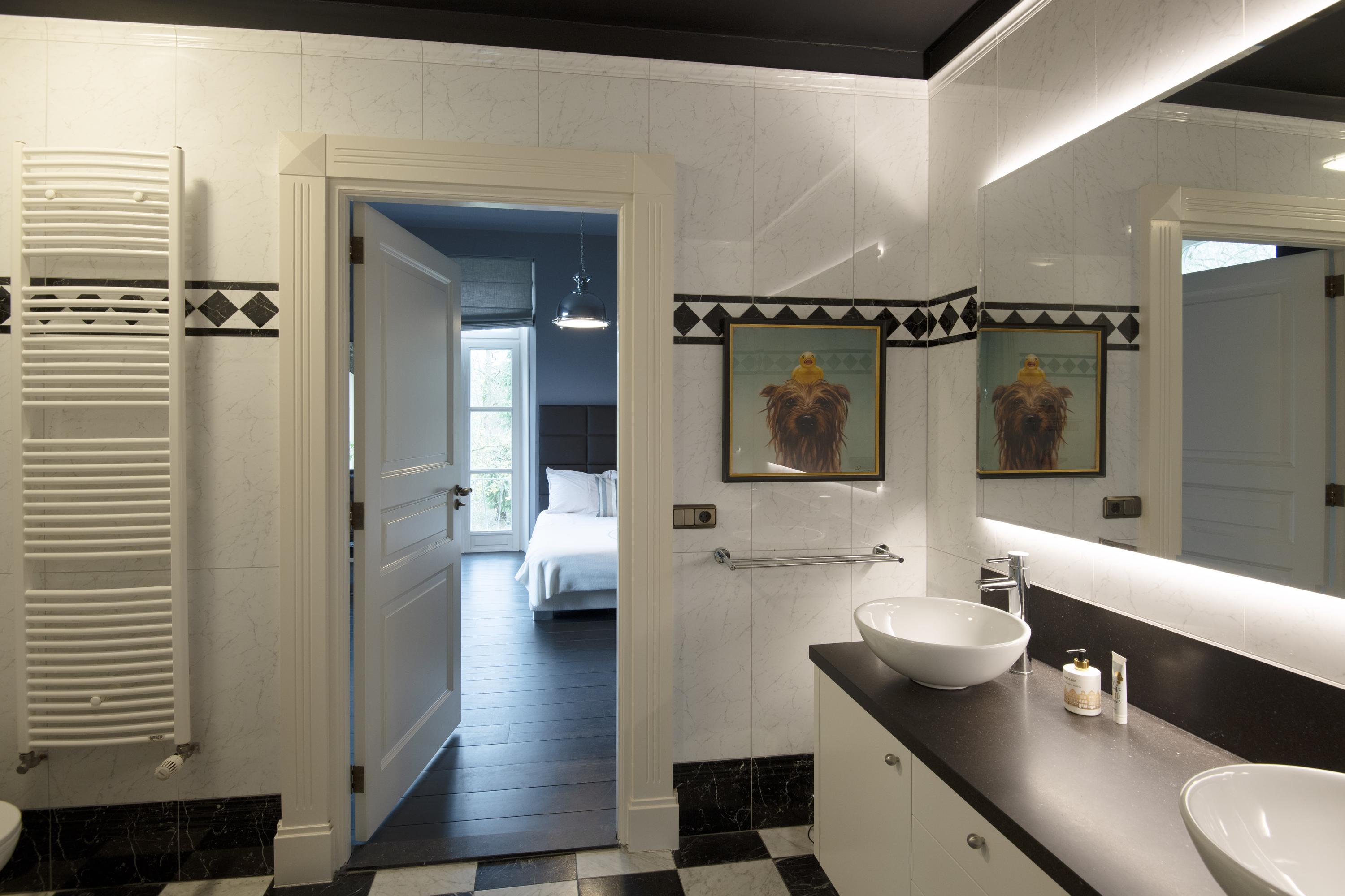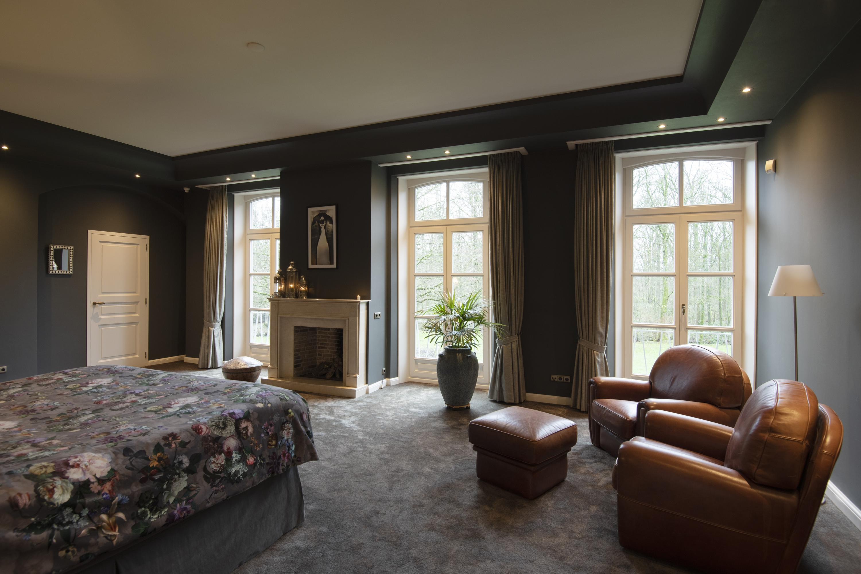 The imposing staircase leads to the second floor. The eye-catcher on this floor is the suite; a nature-oriented bedroom of 45 m2 with high stucco ceiling, three pairs of double doors to the French balconies, an adjoining dressing room and private bathroom. From this suite is also access to the tower where there is space for a shoe collection if desired. On this floor are two more bedrooms, also with French balconies. Between these bedrooms is the 2nd bathroom with double sink vanity, walk-in shower and toilet. On the landing is another separate 2nd toilet. The floor in the suite is covered with luxury carpet and the floors of the other two bedrooms are covered with parquet. This floor is also fully equipped with underfloor heating.
