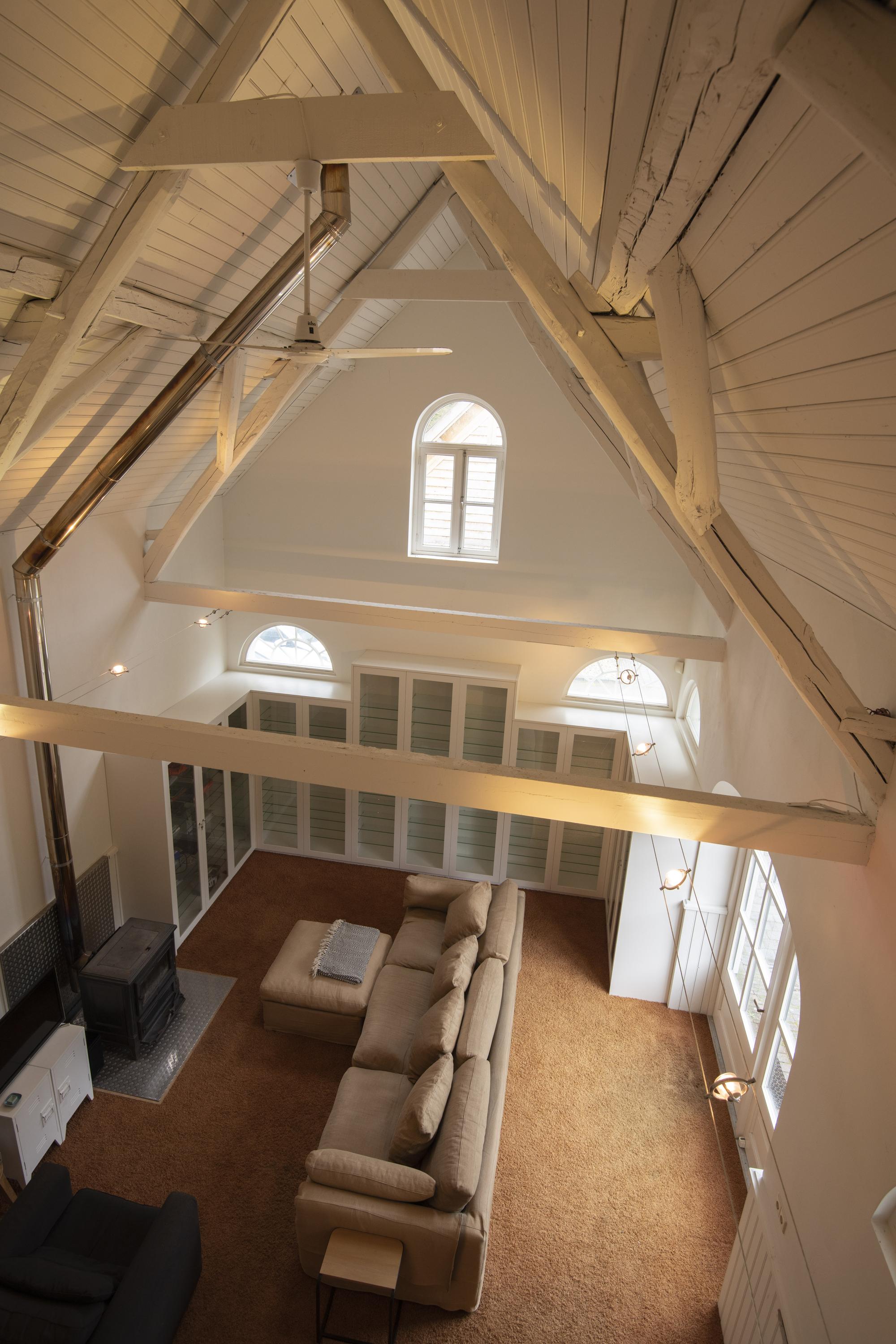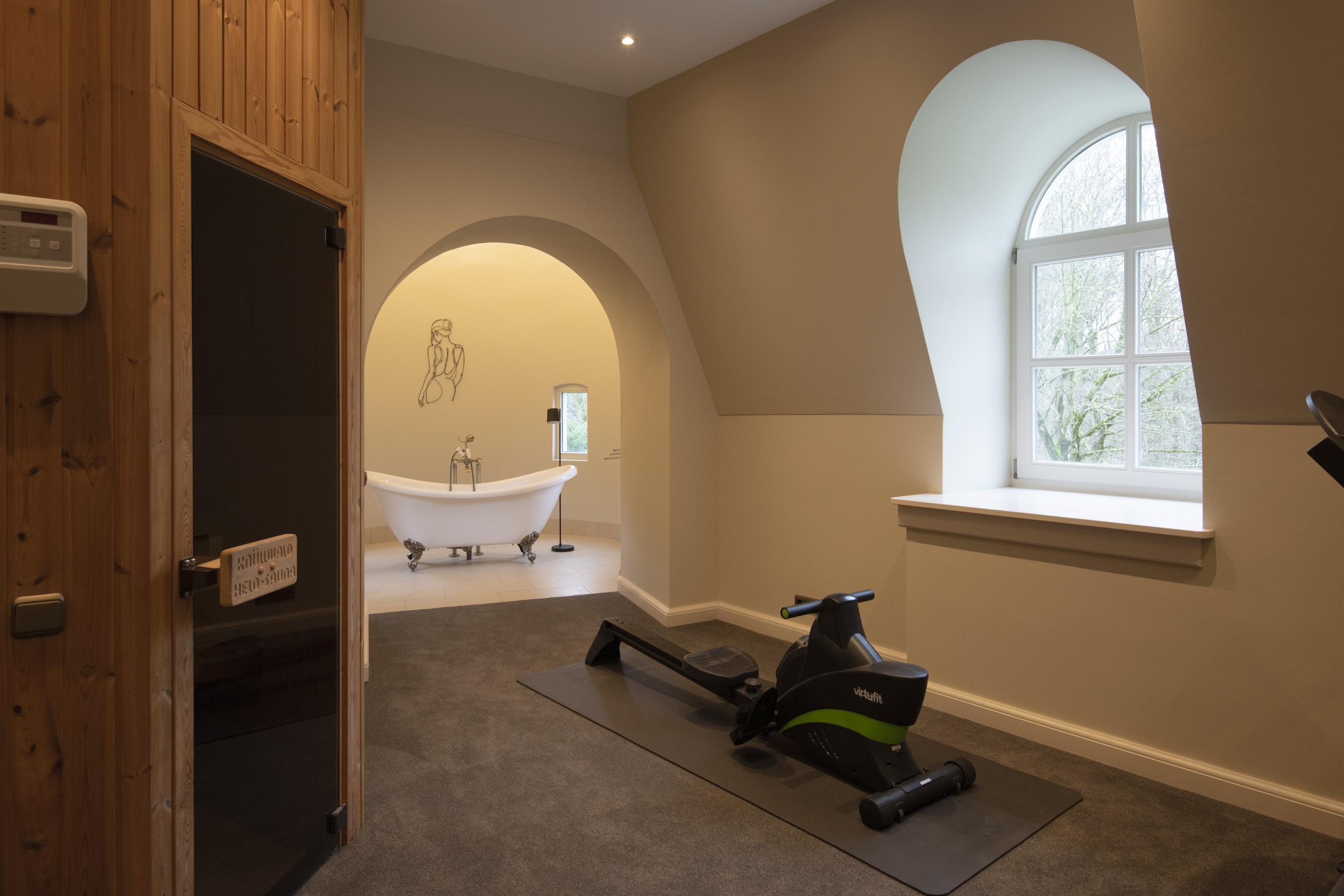 Landing with toilet, guest bedroom cum relaxation room with adjacent spa with walk-in shower, sauna and bathtub under the excellently insulated high roof on the second floor.