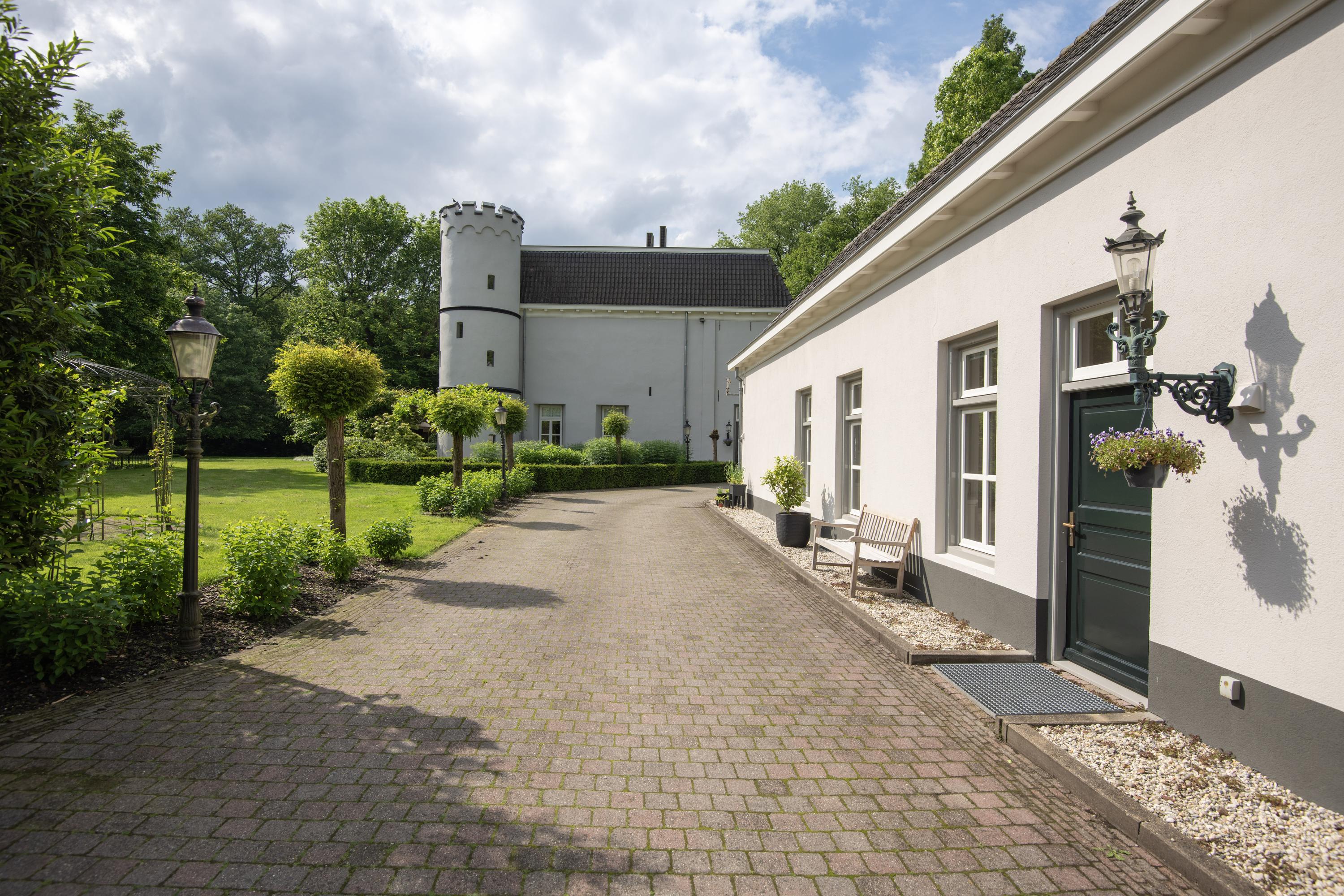 The manor house is characterised by white rendered façades, hipped roofs, corner turrets and one round corner tower with battlements. Although the original year of construction cannot be determined precisely, its history dates back to approximately 1864. In 1998, the manor house was largely destroyed by fire and subsequently rebuilt with great craftsmanship, care and attention, and fully renovated, modernised and made more sustainable. Among other features, the presence of 40 solar panels and two heat pumps has resulted in an exceptional A+ energy label.
