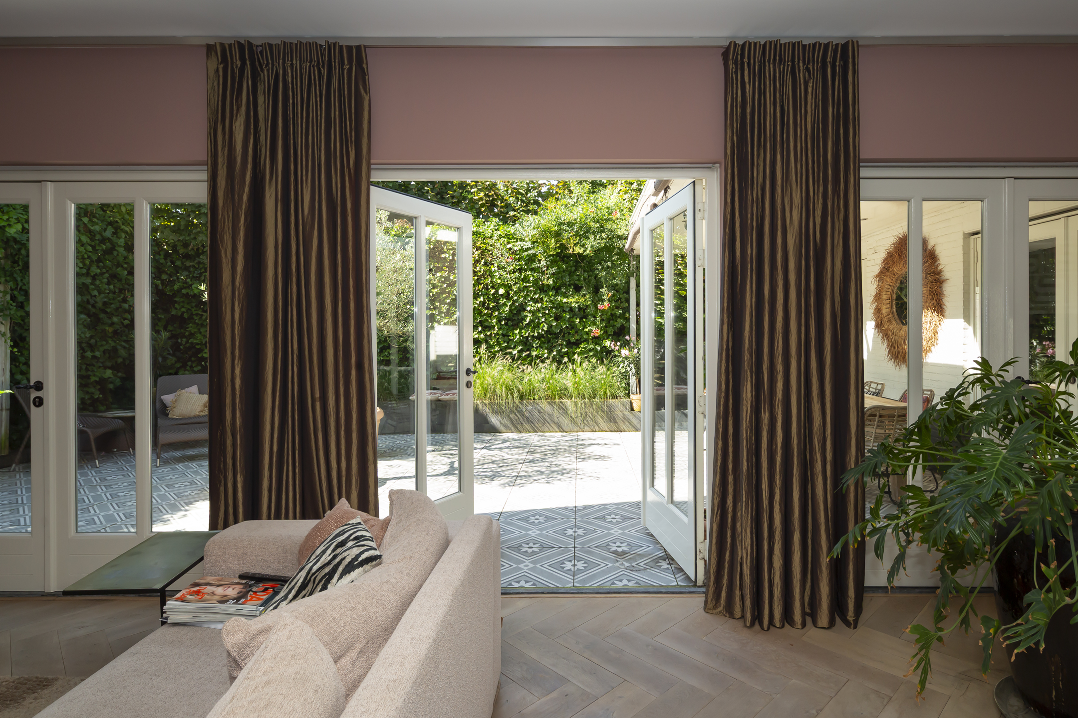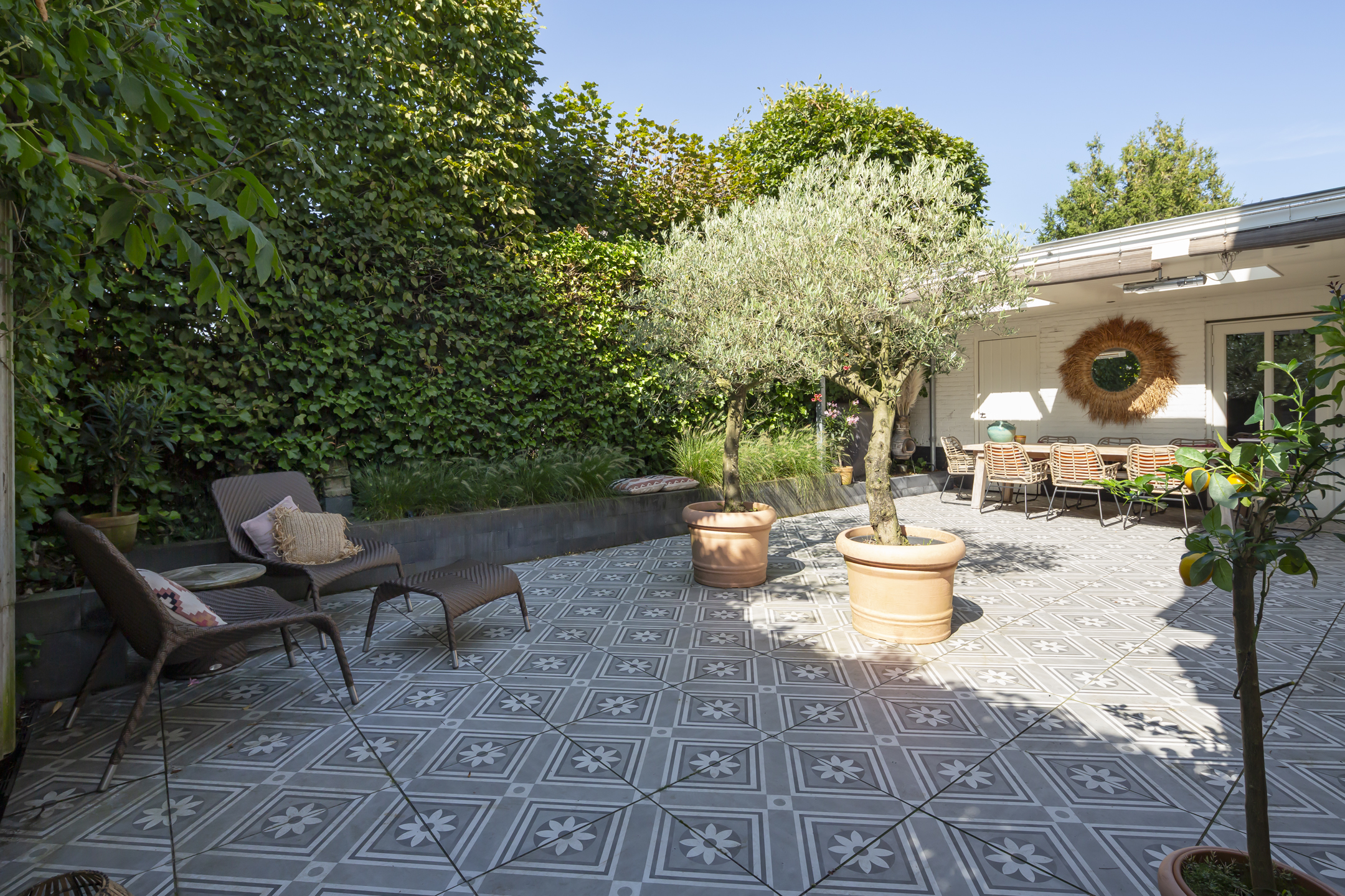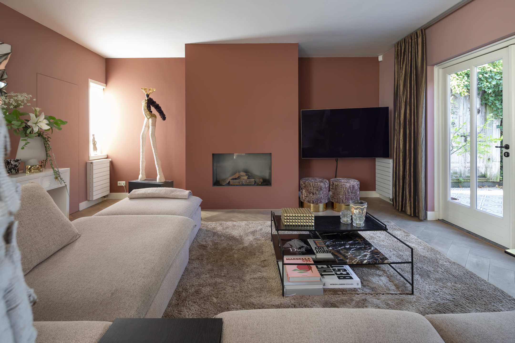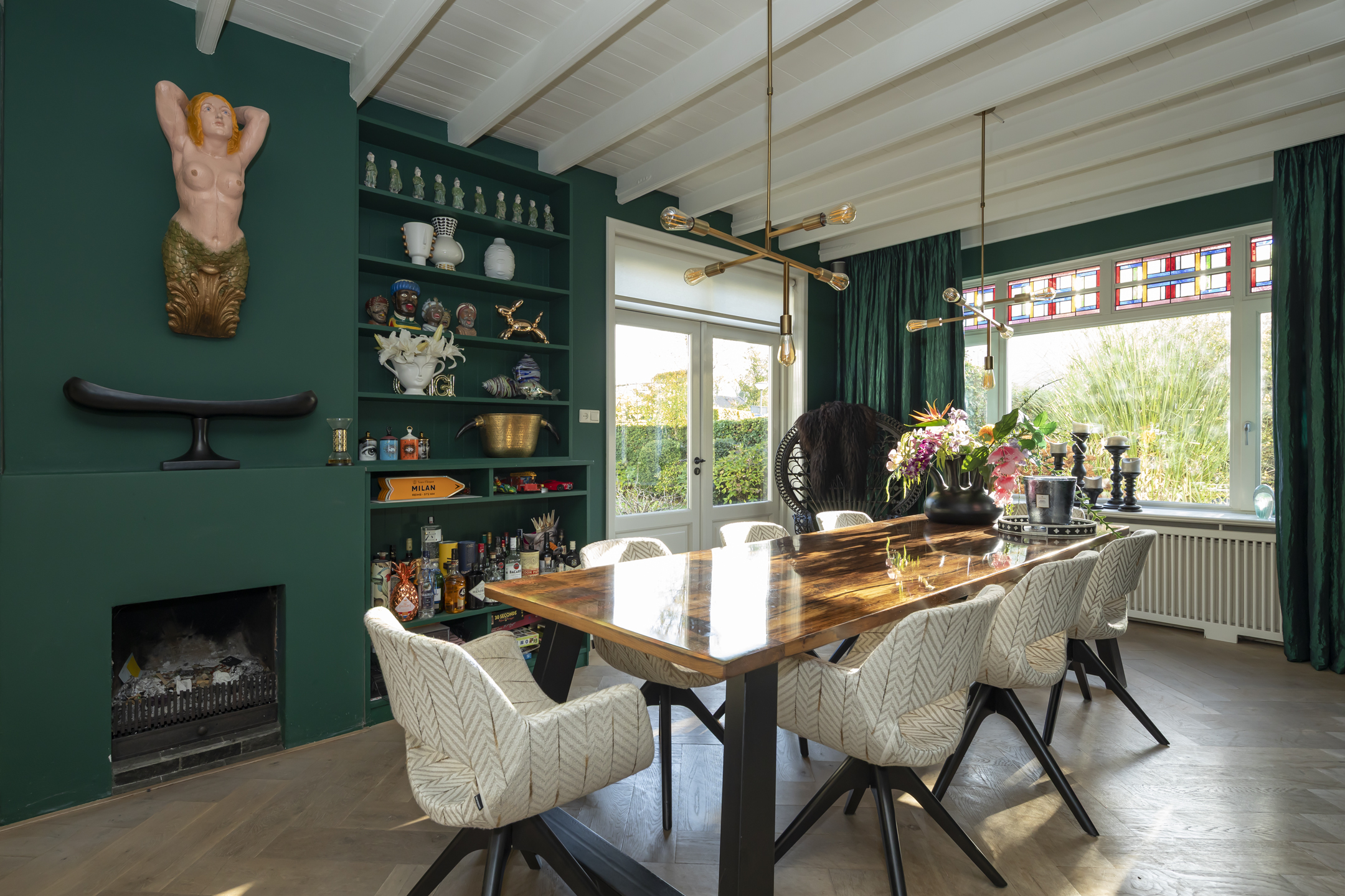 The residence showcases a refined entrance hall with high ceilings, authentic details, and a vibrant floor, setting a tone of understated luxury. The living room is defined by a rich ambiance and a classic fireplace, seamlessly connecting via French doors to a sheltered patio garden. Light flows through beautiful stained-glass en suite doors into the elegant dining room, while an additional multifunctional room offers flexibility for work or play, each with garden access. The contemporary kitchen is equipped with premium appliances, creating a space ideal for both culinary pursuits and informal gathering.