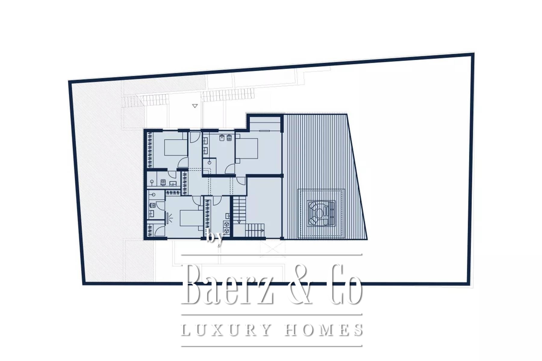 Each of the five bedrooms and five bathrooms is finished with top-tier materials: large-format ceramic tiles, parquet, triple-glazed windows, and refined sanitary ware. The living room welcomes natural light, flowing seamlessly into a fully equipped kitchen. An elevator connects all floors, ensuring effortless movement throughout the villa.