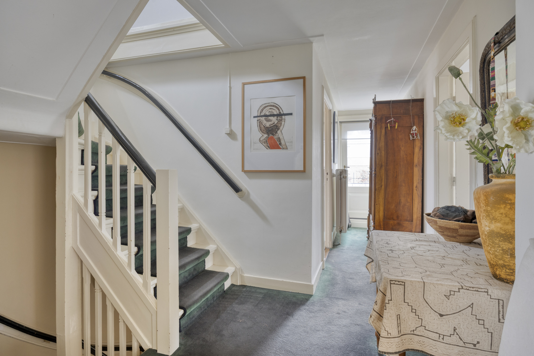 Eerste verdieping: het mooie trappenhuis geeft toegang tot een ruime overloop waaraan de eerste drie slaapkamers liggen, allen voorzien van wastafels en vaste kasten. Vanuit de master-bedroom kom je tevens op een ruim balkon waar je prachtig uitkijkt over het buitengebied van Oldenzaal. Grenzend aan de overloop vind je de eerste ruime badkamer welke is voorzien van een wastafel met wastafelmeubel, toilet, ligbad en doucheruimte. De kleinste kamer op de eerste etage is ingericht als kastenkamer en heeft een verbinding met de voorste slaapkamer.