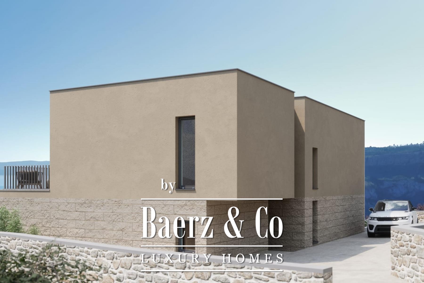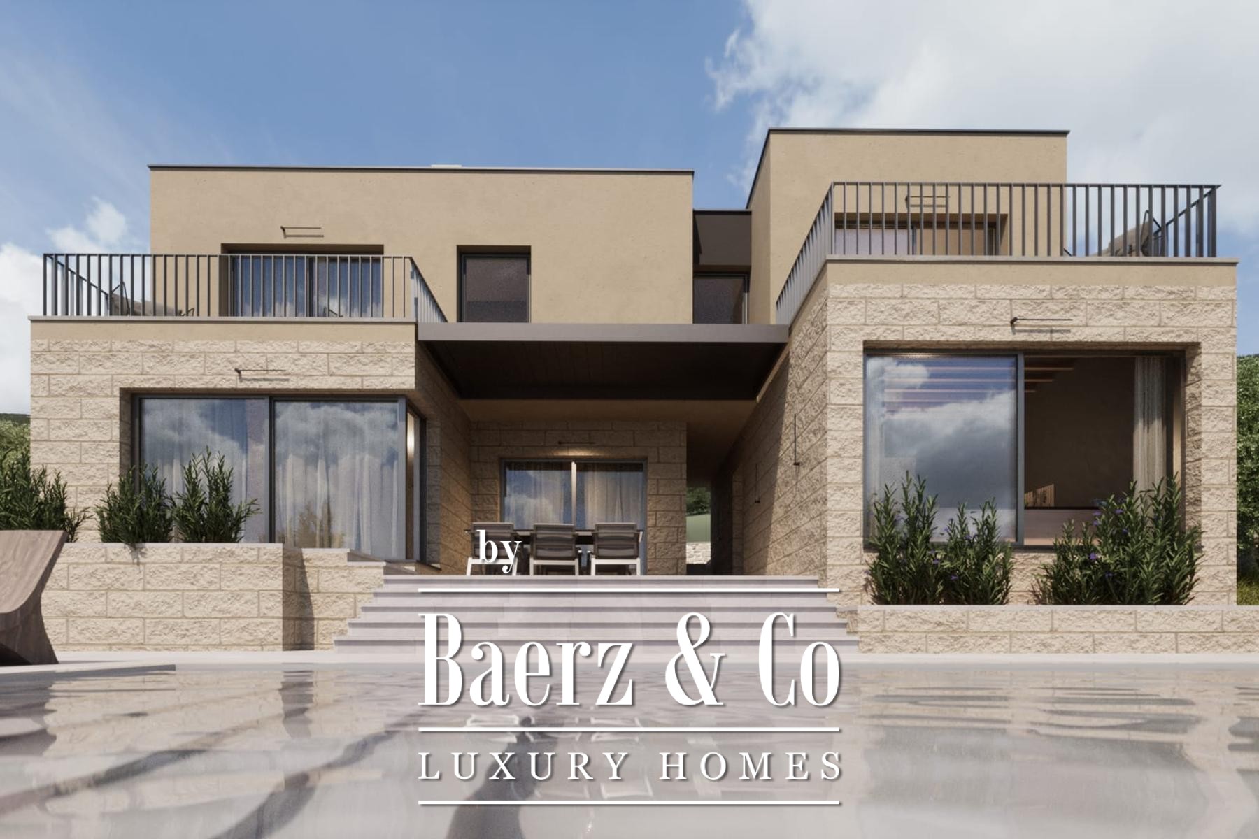 The exterior blends contemporary lines with materials native to the setting, including Brač stone and expansive glass walls. Outdoors, a sundeck, a terrace with dining and barbecue areas, a 32 m² swimming pool, and four parking spaces enhance the sense of escape and possibility.
