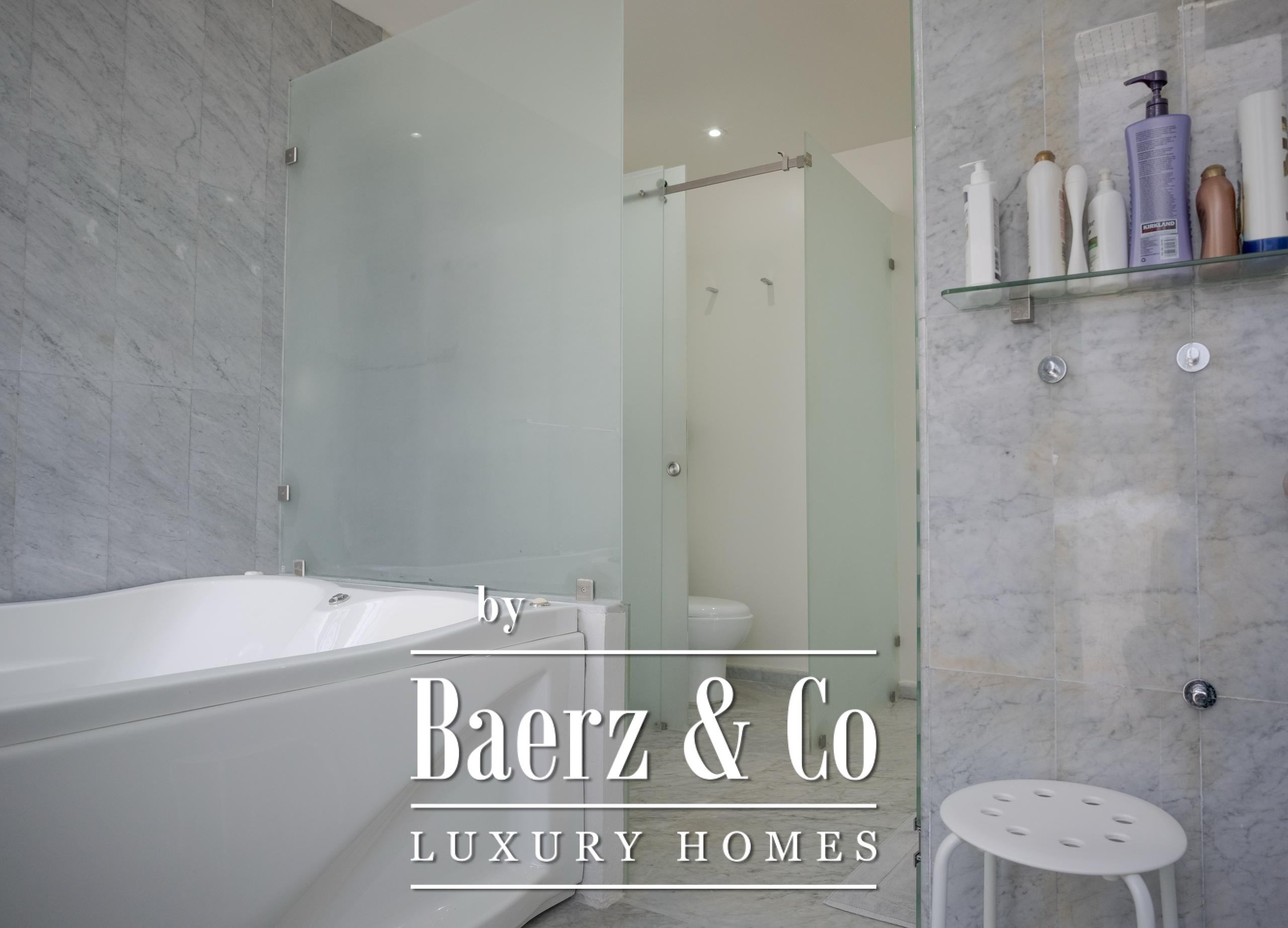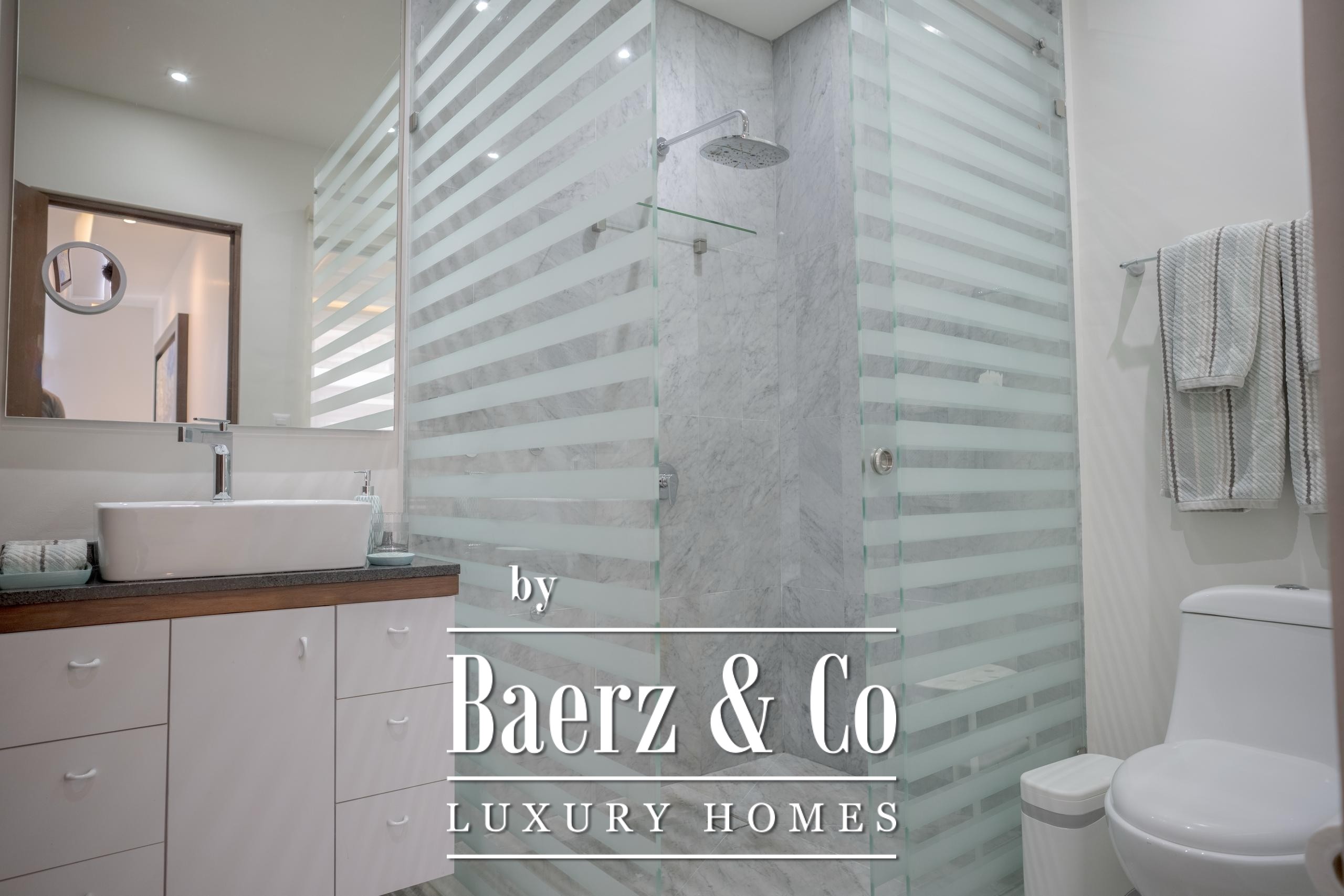 The primary bedroom is a true oasis, featuring a large walk-in closet, bathroom with double vanity, shower, and an elegant jacuzzi for two. You’ll also find two additional bedrooms, each with a private bathroom, closets, and large windows that fill the spaces with natural light.