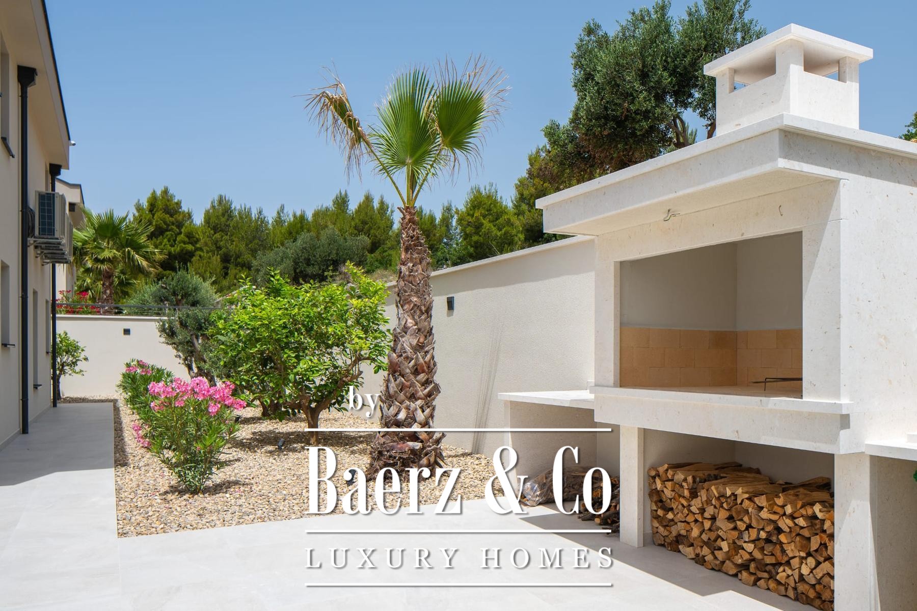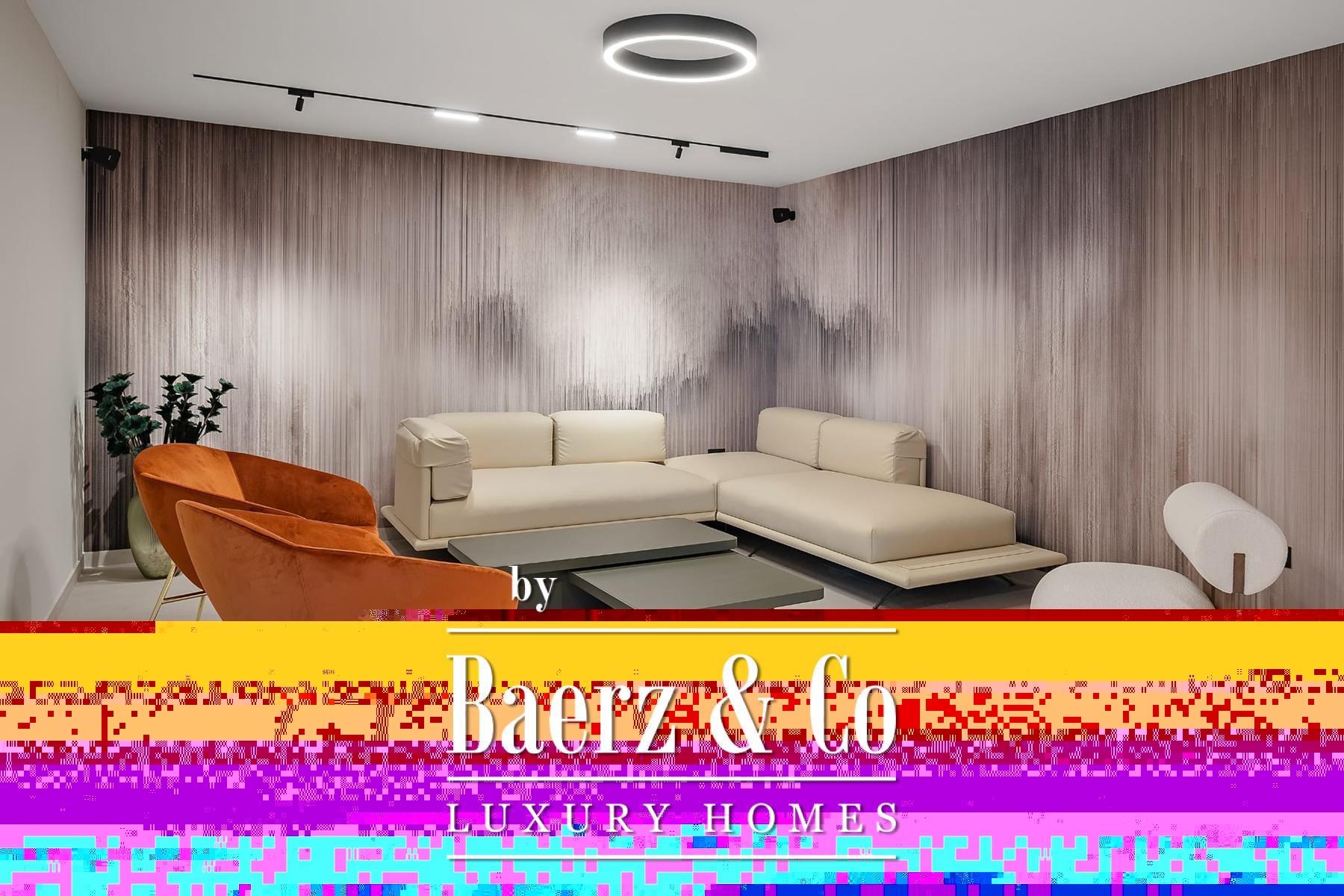 The ground floor flows seamlessly from its open-plan living, dining, and kitchen space onto two partially covered terraces, one of which hosts an outdoor summer kitchen, while a large sundeck introduces the 36 m² infinity pool with massage waterfall. On the lower level, a fun room, sauna, and mini kitchen create a setting for both relaxation and entertaining, complemented by technical rooms and a double garage. The residence reflects high energy efficiency, with solar hot water, integrated LED stone staircase, and advanced filtration systems.