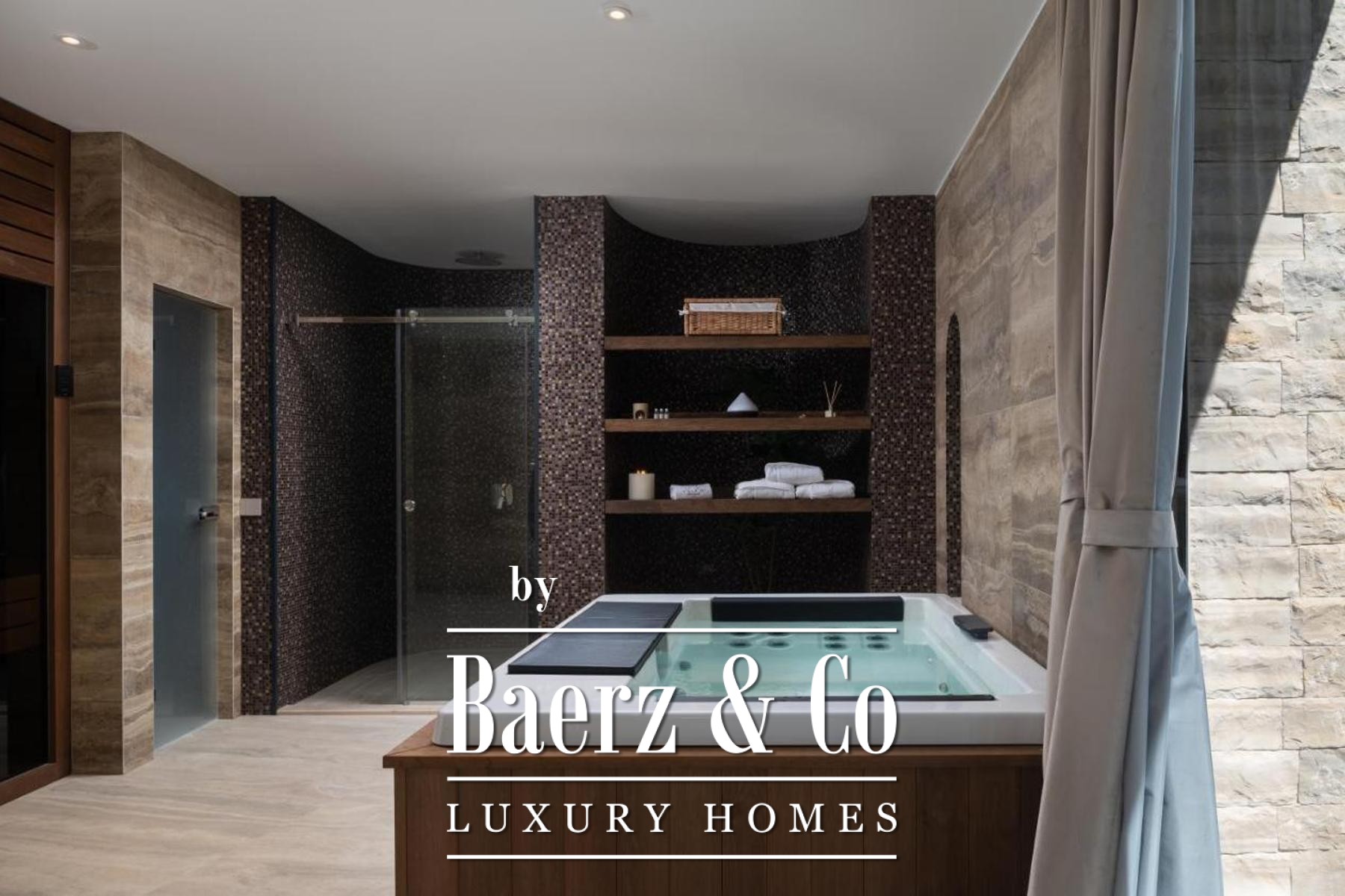 Entry is marked by an elegant staircase on the southwest side, welcoming you into a spatially fluid entrance hall. The ground floor prioritizes open-plan living, merging a designer kitchen with central island, a dining area for convivial gatherings, and a restful lounge. Sliding doors extend this living canvas onto a sunlit terrace and pool, blending interior calm with the outdoors. Amenities enrich daily life: a guest toilet, complete laundry room, rustic wine cellar, wellness area with Jacuzzi and sauna, and a modern fitness studio.