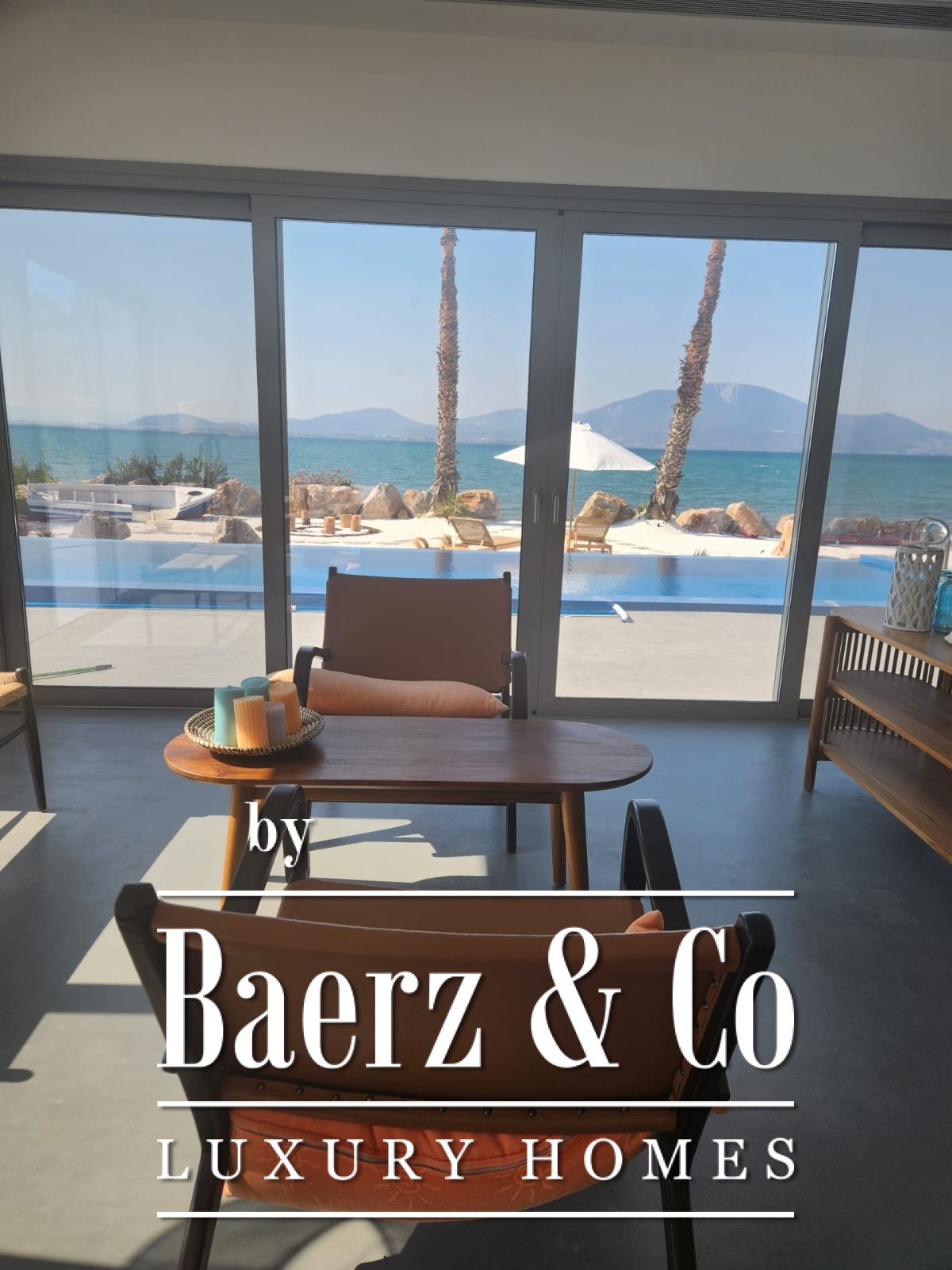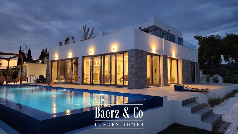 This beachfront villa Politika Beach stands directly on the shoreline, offering absolute privacy and uninterrupted sea views that frame the North Euboean Gulf. With no roads or barriers, the transition from home to beach is fluid, reinforcing a rare sense of tranquility and exclusivity. The property occupies a 1,000 m² private plot and provides 170 m² of living space focused on seamless indoor-outdoor living, panoramic vistas, and natural light.