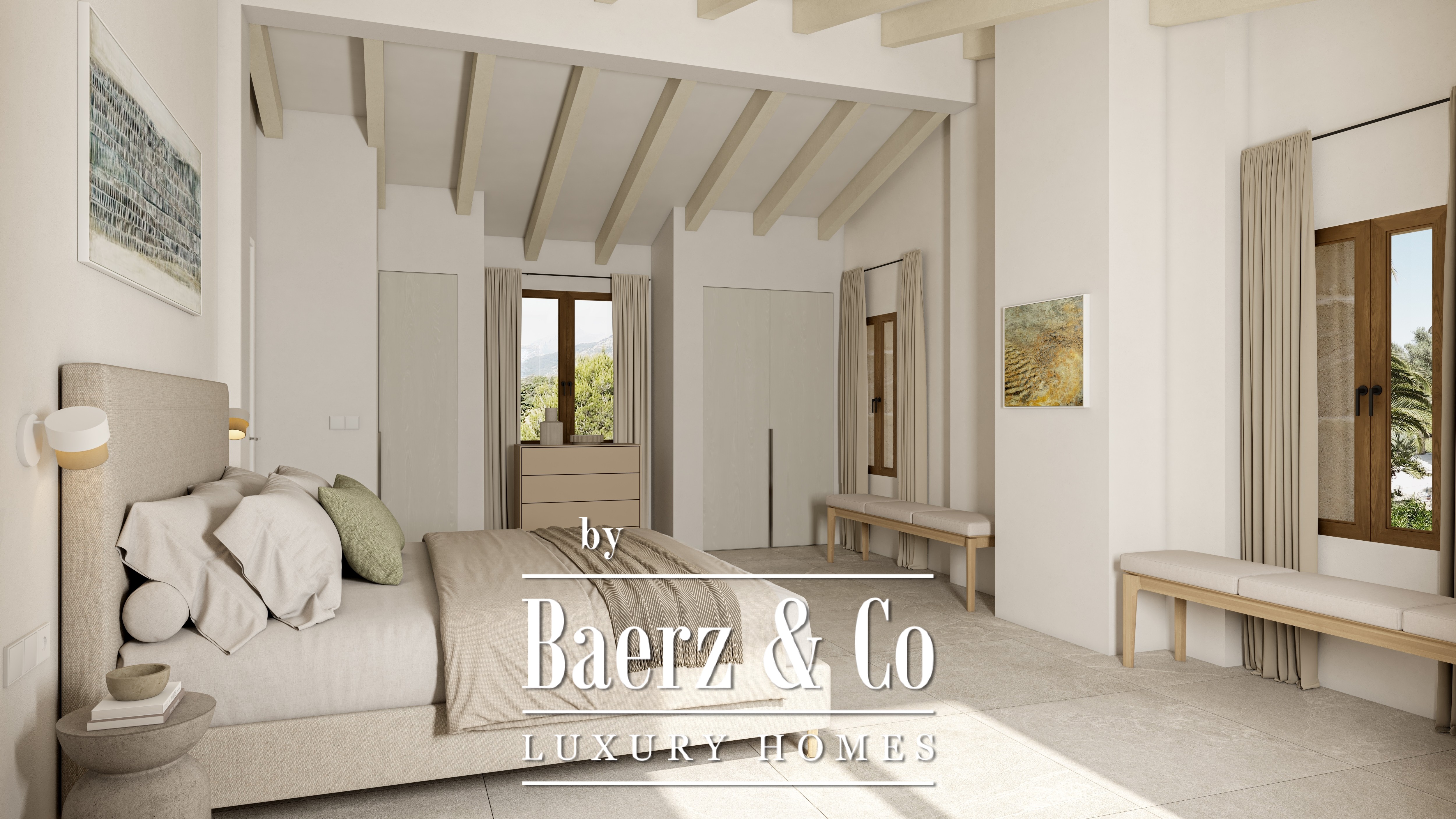 Villa Pollenca presents 411 m² of refined living space on a 16,423 m² estate where traditional Mallorcan stone architecture has been fully renewed in 2025 to exacting standards. Five double bedrooms and four bathrooms, three en suite, flow around a central salon with fireplace, a generous kitchen and dining area, a laundry, a wine cellar and guest conveniences. Natural stone floors with underfloor heating, full air conditioning, advanced domotics and double glazing ensure seamless comfort. Wide covered terraces extend to landscaped gardens, creating layered spaces for dining and repose. A private 70 m² pool anchors the outdoor rhythm, framed by mountain views and soft Mediterranean light. The property is self-sufficient with its own well, solar park with battery packs and a back up generator, while connected to the grid. Located on the quiet border between Pollenca and Alcudia, mornings are marked by the stillness of olive groves, afternoons by walks along historic lanes, evenings by the glow of village cafés and the nearness of marinas and beaches. Villa Pollenca is offered fully furnished, a ready sanctuary for year round living or an elegant holiday residence, where every element of privacy, craftsmanship and natural beauty is composed with enduring grace.