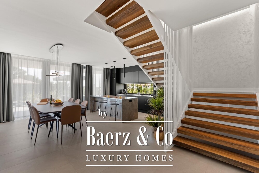 Every detail emphasizes lasting quality, from Duravit and Grohe bathroom fittings, large-format Italian ceramics, and Eglo lighting to a Vaillant heat pump system with underfloor heating, Samsung Multi Split climate control, and full smart-home connectivity. Integrated Ajax alarm systems, video surveillance, and a Wallbox electric car charger underscore a discreet yet highly protected lifestyle.