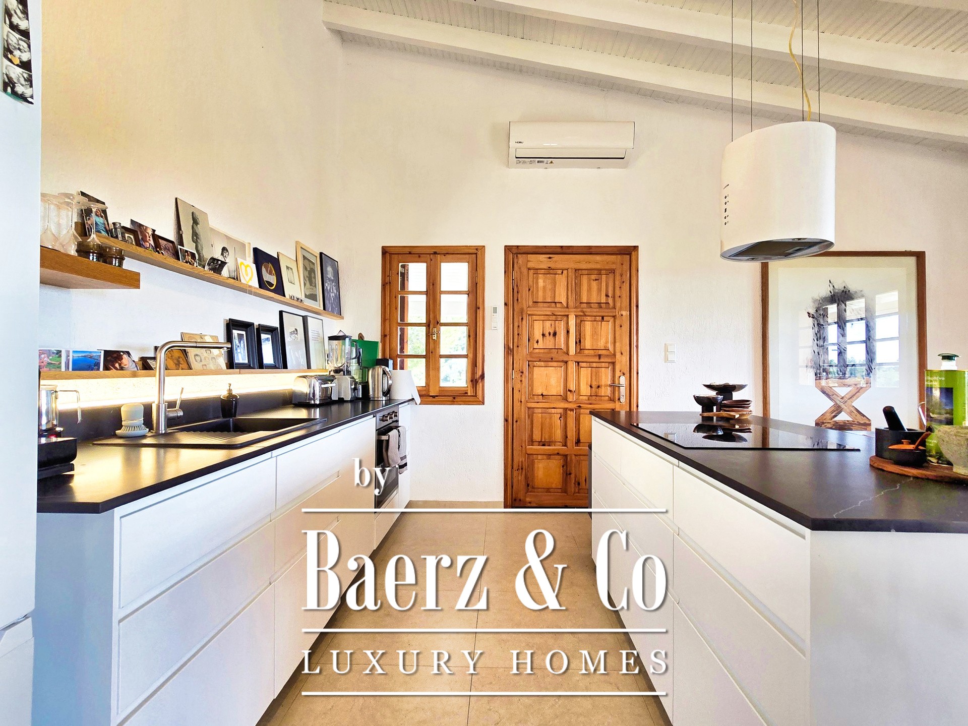 Detached house Portocheli presents a rare opportunity to experience refined living amidst natural beauty. This independent residence, with a total living area of 126 m², is set within a 2,100 m² fenced and partially landscaped plot. The house stands elevated on a quiet hillside, surrounded by elegant country homes and enriched by panoramic views of the natural landscape and the sea.