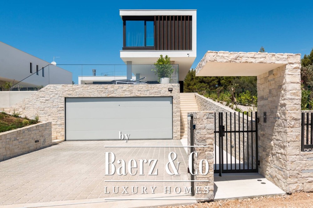 Beyond its interiors, the house includes a covered outdoor terrace, barbecue zone, and a heated overflow pool that embraces the slow rhythm of coastal life. A private garage for two vehicles and additional outdoor parking balance practicality with privacy. With its understated location, this contemporary townhouse in Primošten invites a refined Adriatic lifestyle, defined by light, calm, and sea air.