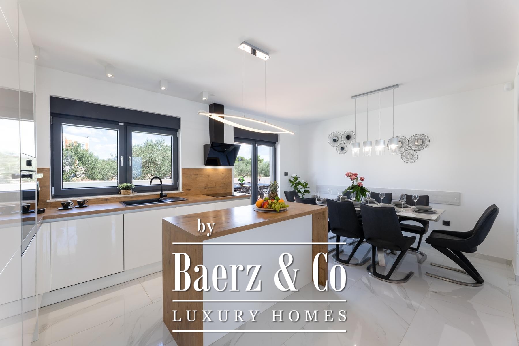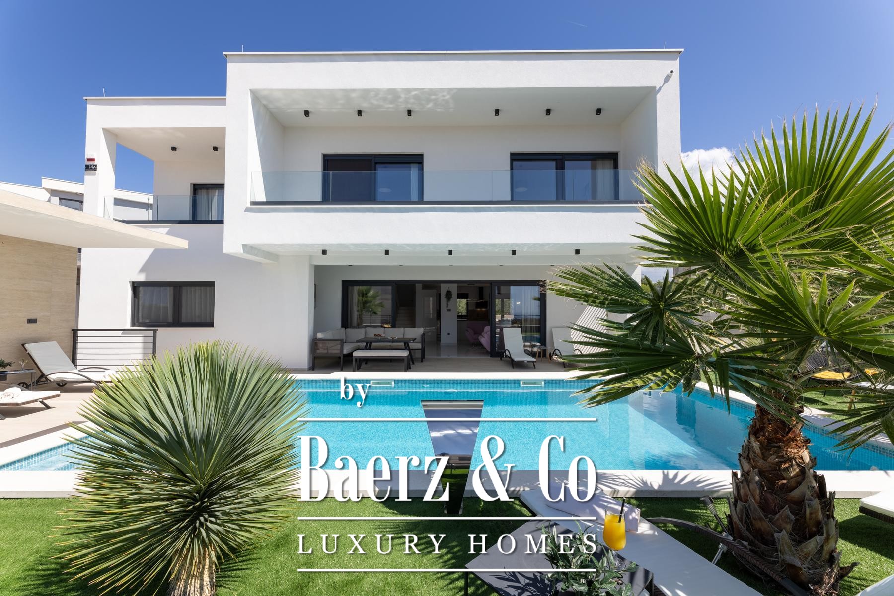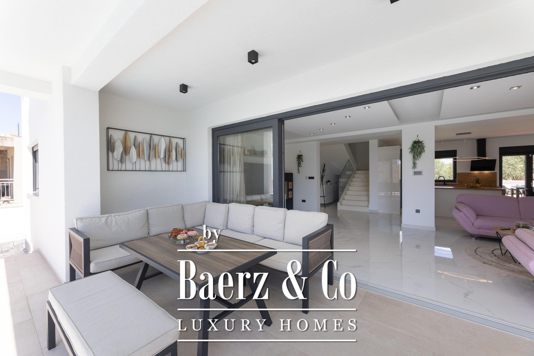 Villa Primošten with sea view presents a modern Croatian retreat defined by its 311.56 m² of refined living space and compelling Adriatic outlook. Completed in 2024 on a 515 m² plot, this residence articulates contemporary architecture across three thoughtfully arranged floors. The main level flows from a light-filled living room into a kitchen and dining area, accompanied by a bedroom suite and a separate wellness room with a sauna. Expansive glass doors open onto a sheltered terrace beside the pool, where a counter-current swimming system invites leisure and fitness alike.