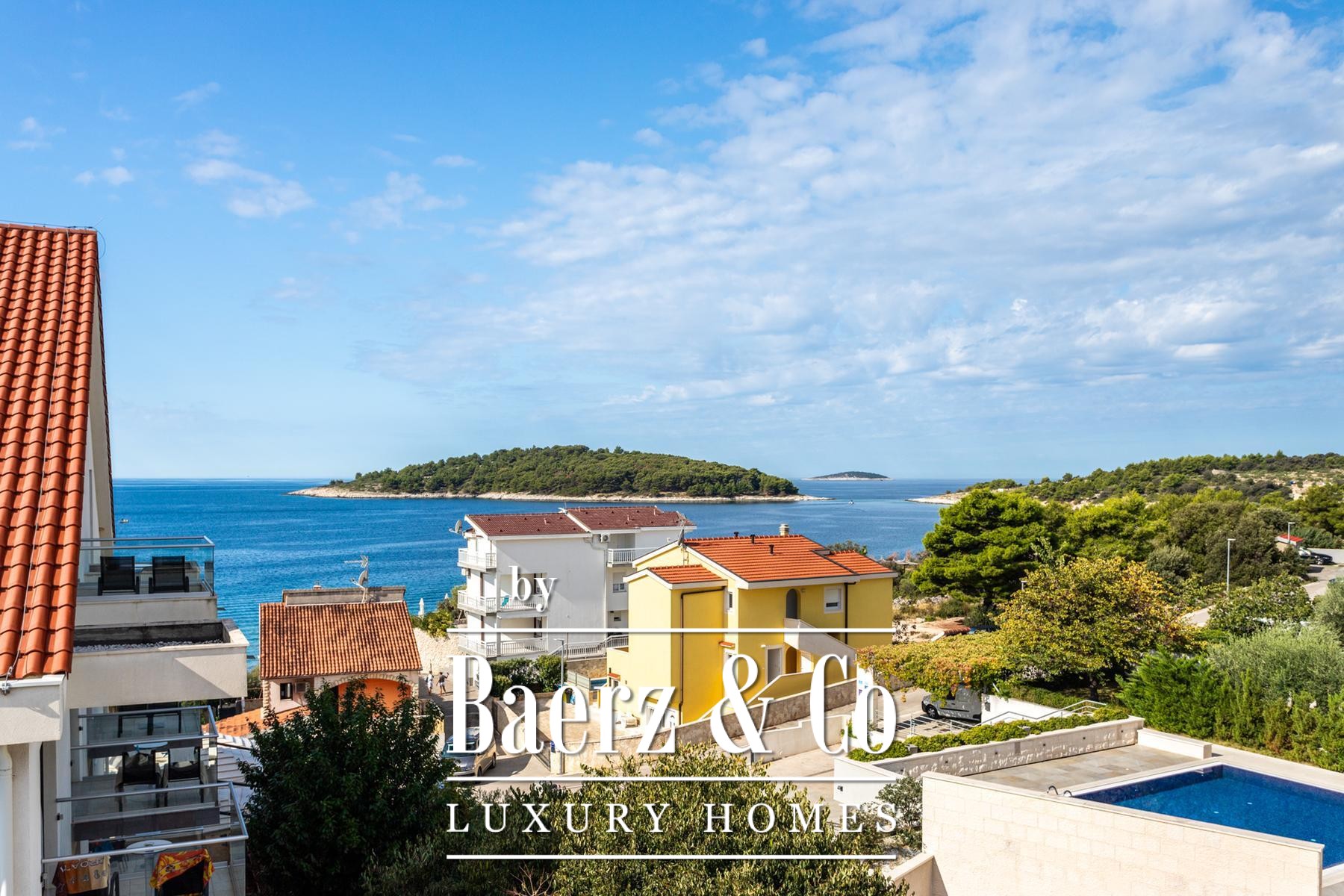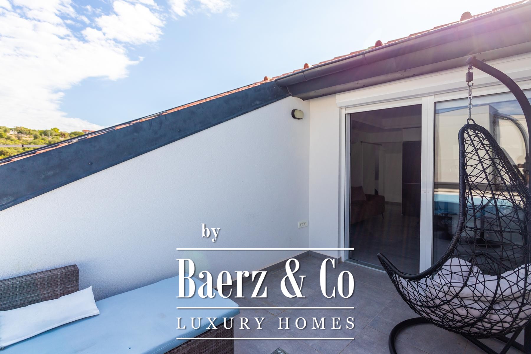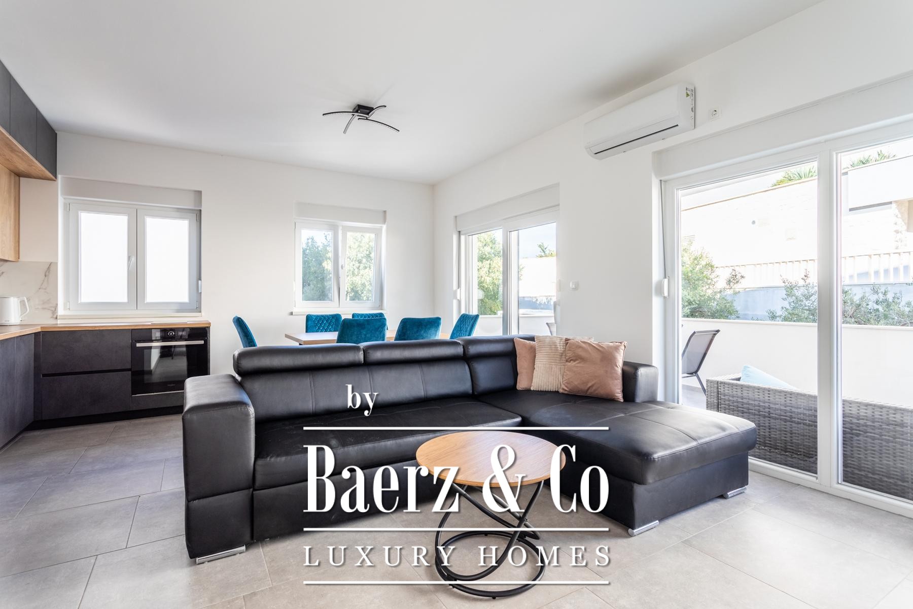 House Rogoznica stands just 90 meters from the Adriatic shore, offering 366.81 m² of considered design across four furnished apartments. This property invites both privacy and versatility, featuring eight bedrooms and eight bathrooms, all arranged to accommodate refined daily living or discreet vacation stays. \n\nThe spatial rhythm flows from a basement with a tailored apartment and four storage rooms, ascending by internal stairs to luminous upper levels. Each apartment consists of a living space with kitchen and dining area, two bedrooms, and a bathroom. Expansive terraces open southward, unveiling sea views that speak to Mediterranean serenity. \n\nBuilt on a compact 207 m² plot in Zečevo, the house is finished to demanding standards and includes three private parking spaces. The setting is quiet, removed from haste, yet the coastline and beaches remain a brief walk away. For those seeking a coastal property with architectural clarity and utility, this house in Rogoznica offers a poised retreat on the Croatian coast.