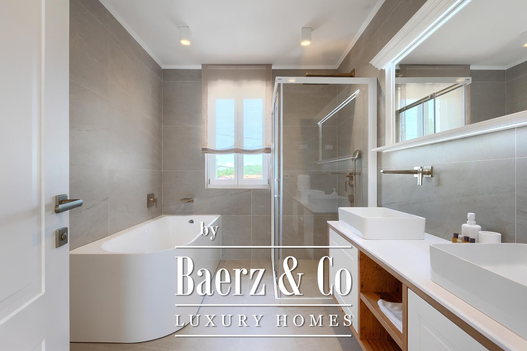 On the upper floor, three bedrooms each have dedicated bathrooms, while the master suite opens onto a balcony. Craft and materiality define every detail, from Slavonian oak carpentry with triple-glazed windows to custom-made furnishings and advanced climate control with underfloor heating and Daikin air conditioning.