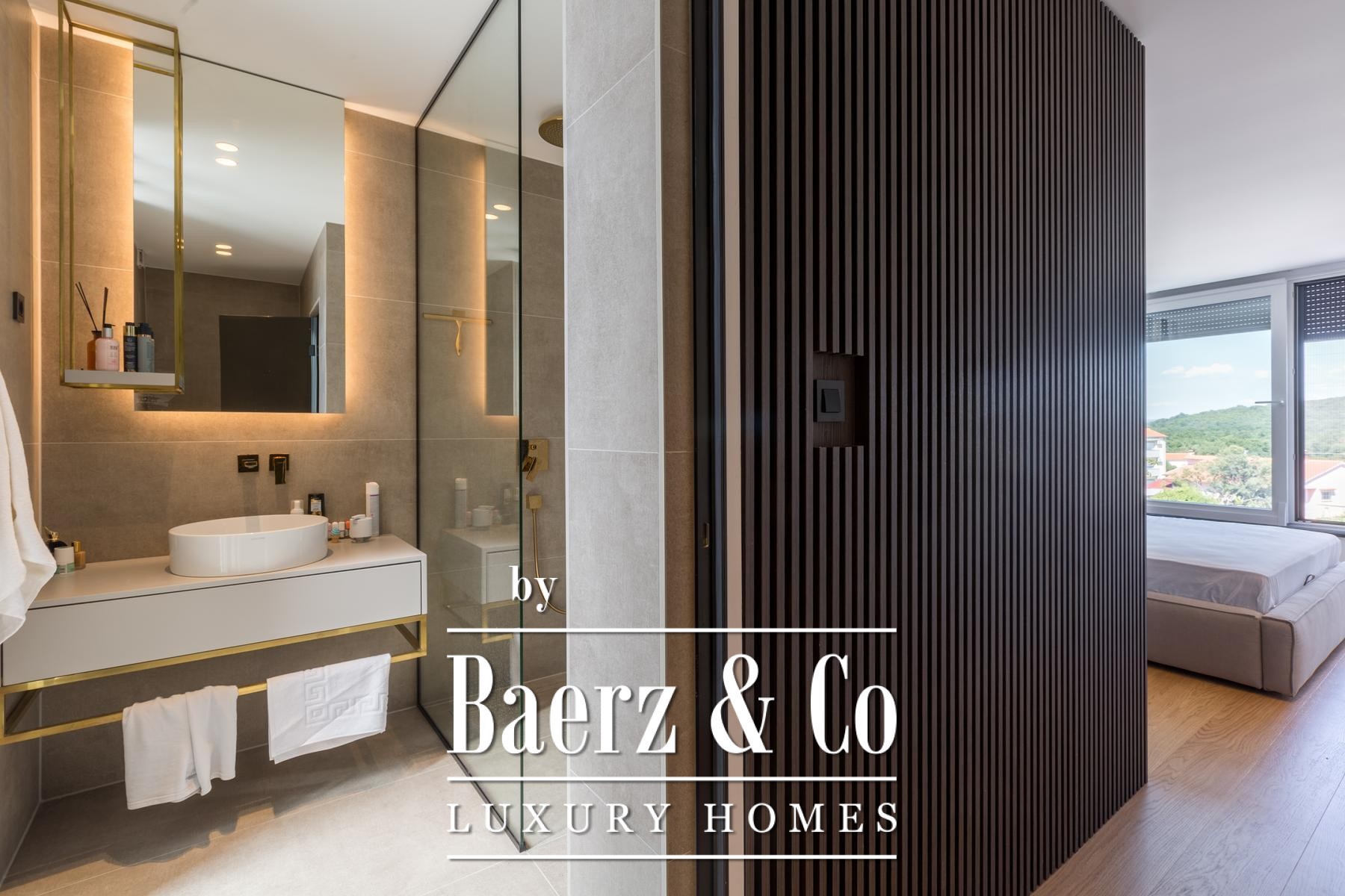 A floating staircase with illuminated wooden steps, bronze glass railings, and stainless-steel details connects the levels, continuing the dialogue between form and function. Outdoors, a 10 by 3 meter pool offers a private respite. Three parking spaces add practical convenience to this residence in Rovinj. The result is a property that merges international design sensibilities with the calm of Istrian village life.