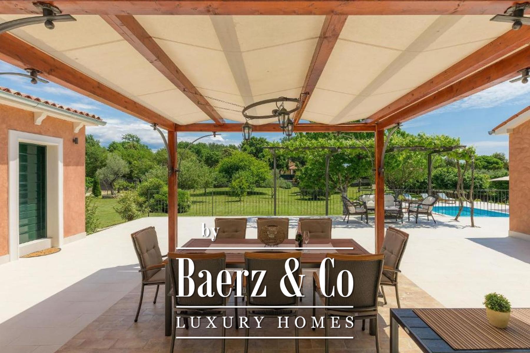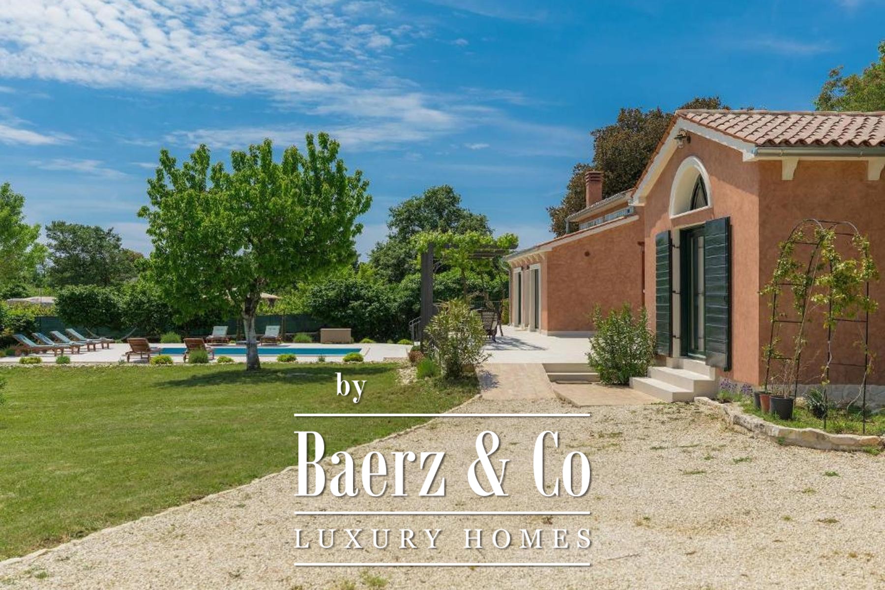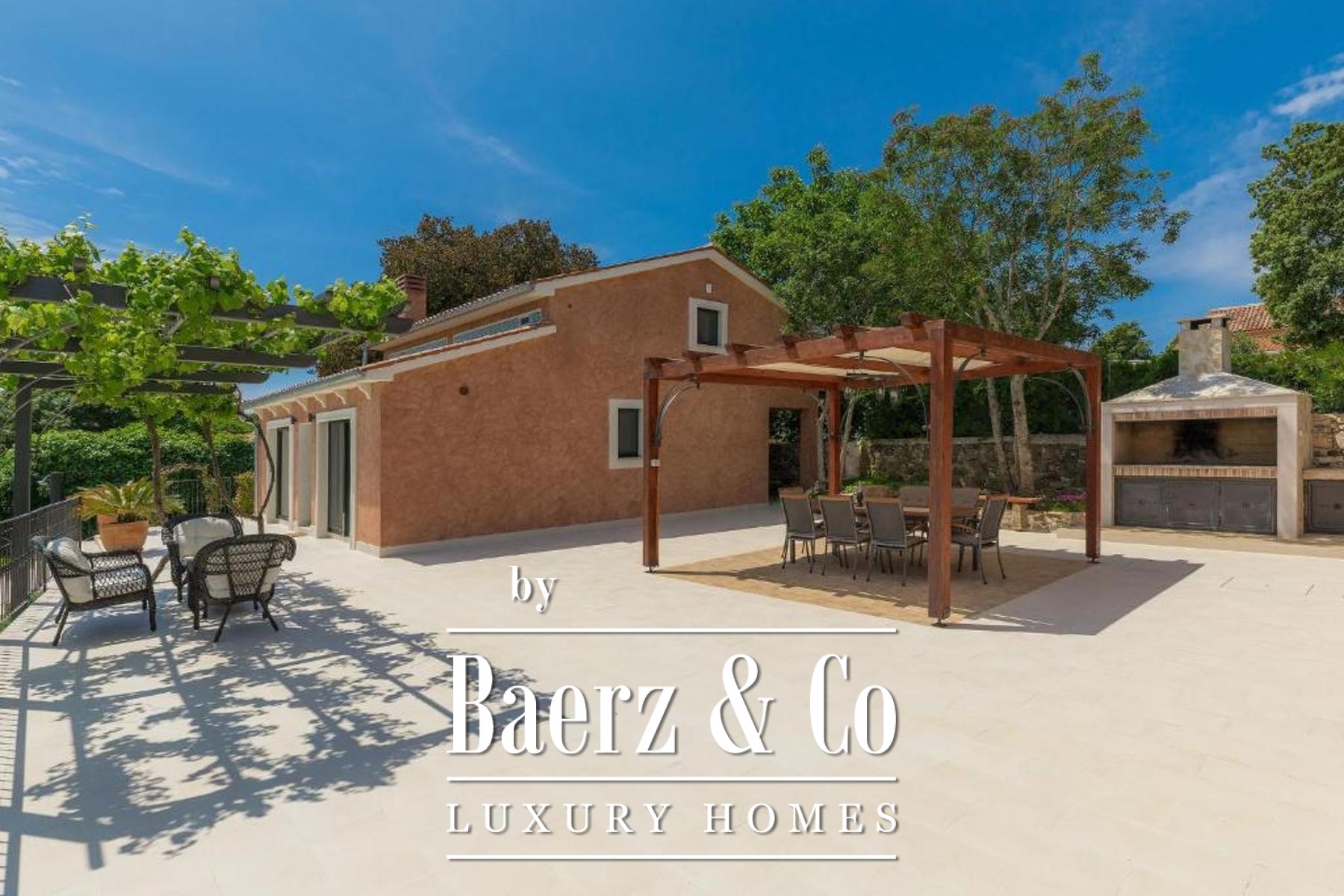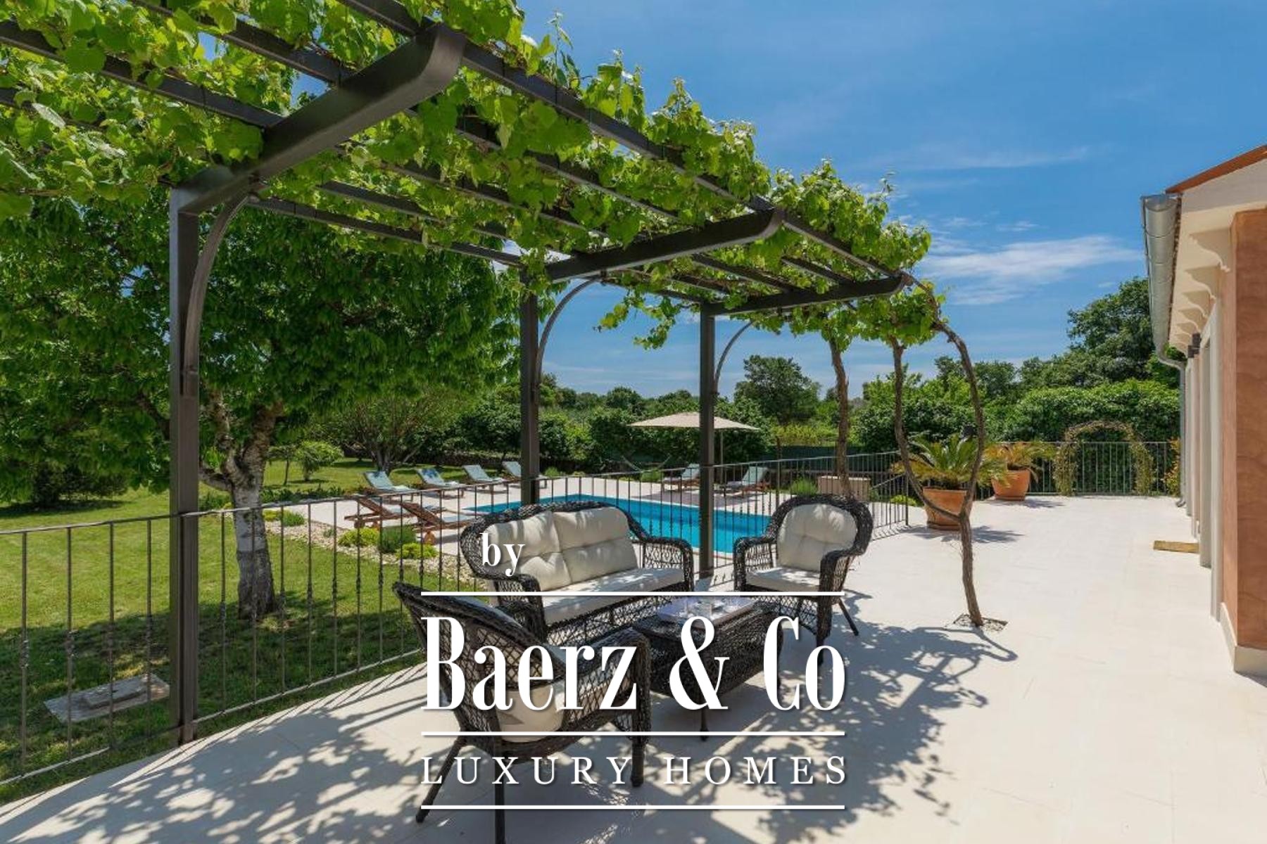 Villa Rovinj is set within a tranquil green enclave, offering a refined estate with two distinct residences and a sense of complete privacy. This villa Rovinj estate spans a living area of 200 m² on a generous 3,116 m² plot, where mature olive and fruit trees and Mediterranean planting provide a natural backdrop to daily life.
