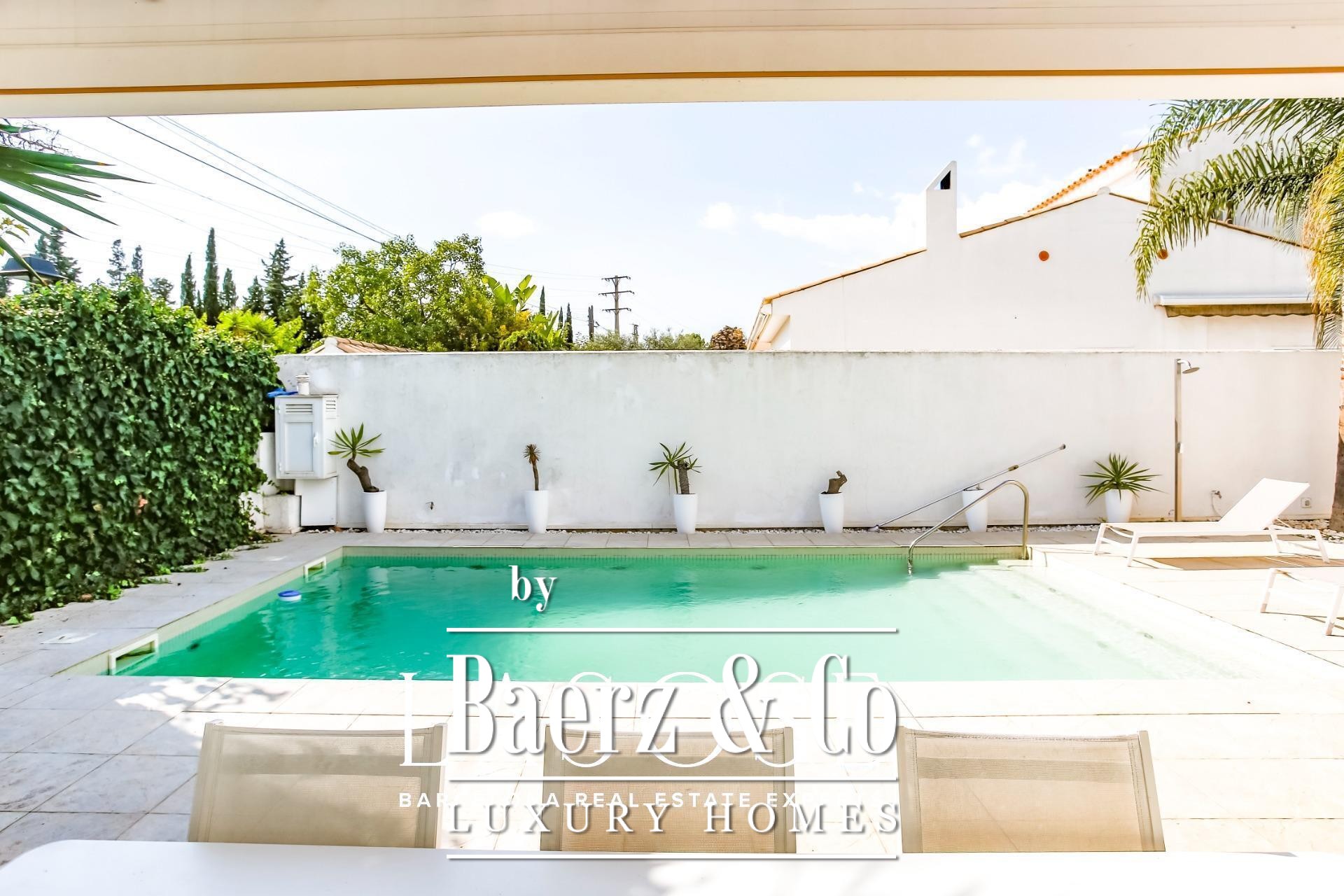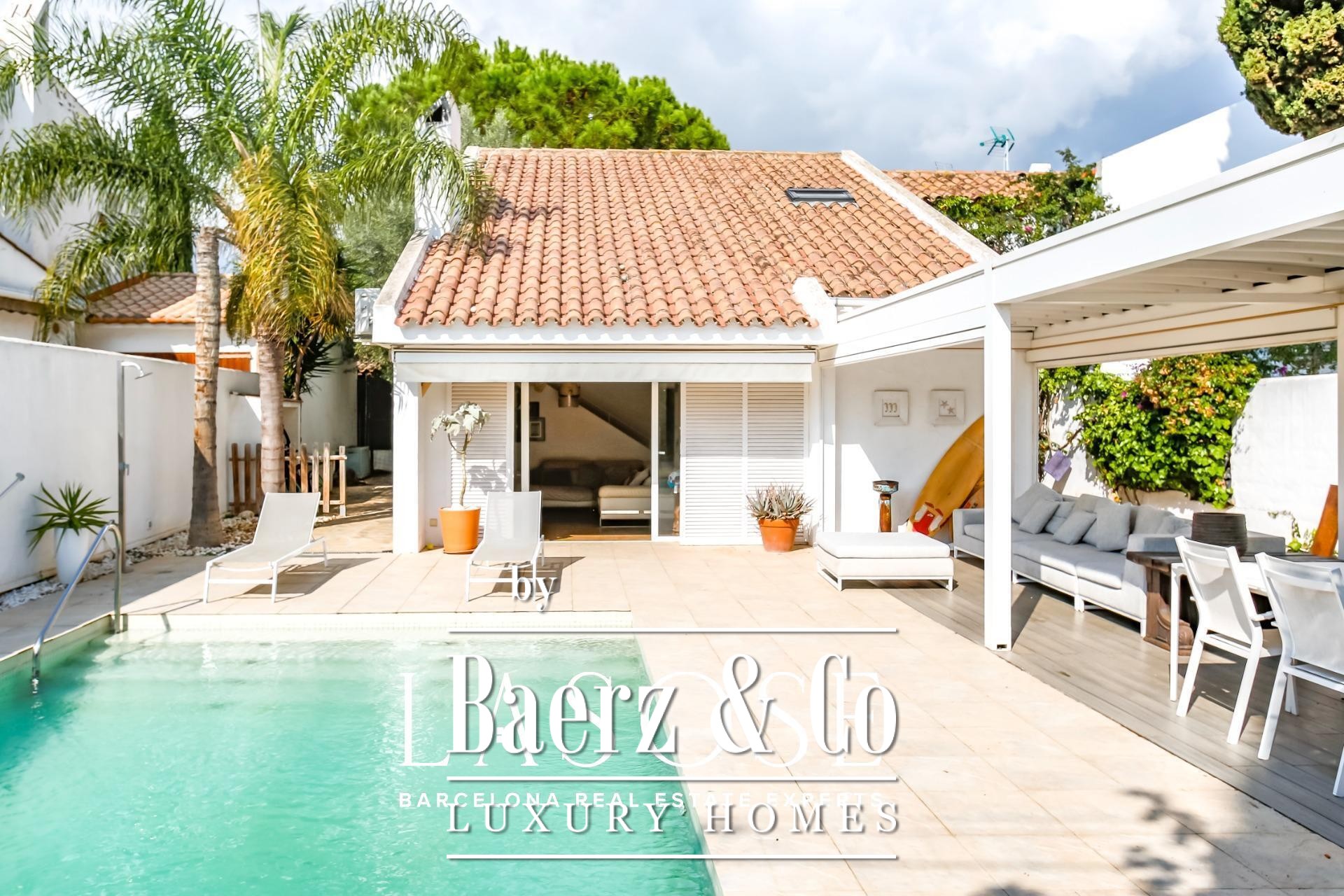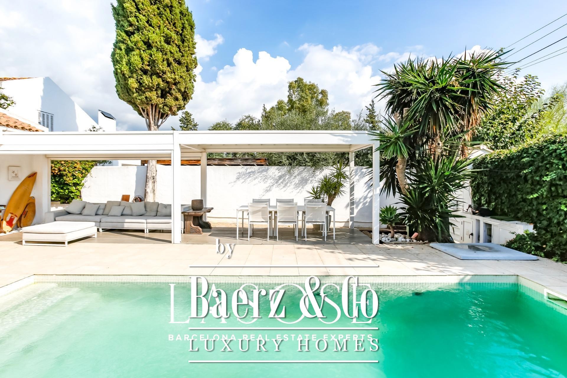 Detached house Sant Pere de Ribes offers an understated, Mediterranean aesthetic set within the exclusive enclave of Los Viñedos. The residence presents 155 m² of considered living space on a 355 m² plot, offering four bedrooms and two bathrooms, thoughtfully arranged for privacy and fluidity. Light flows through expansive sliding windows, connecting interior spaces with lush gardens, lounge terraces, and a private swimming pool—an invitation to daily calm and quiet gatherings alike.