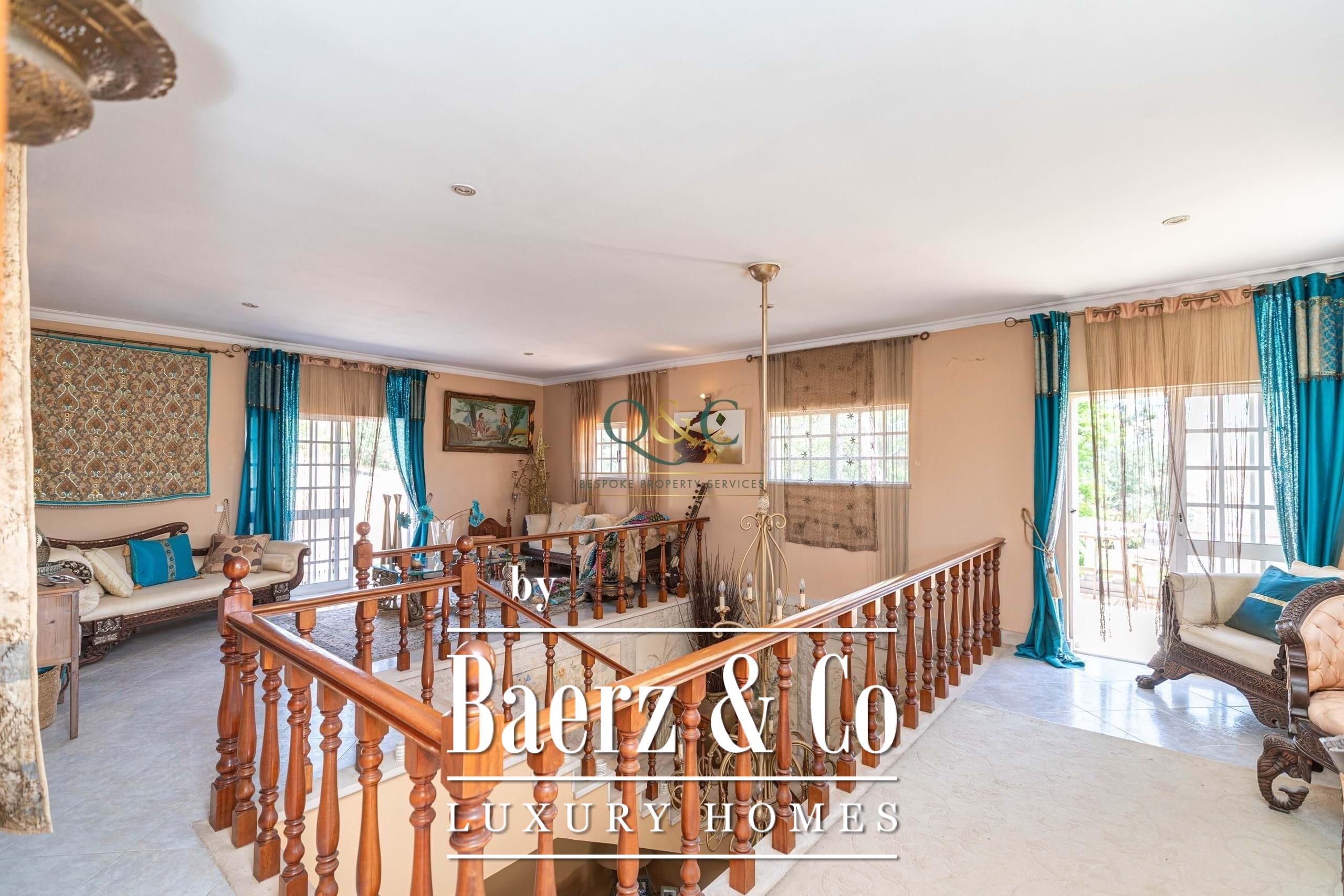 Upstairs, two generous landings open to balcony terraces, while the master suite enjoys a large bedroom, private terrace, walk-in dressing room, and luxurious en-suite bathroom. From one of the terraces, stairs rise to a rooftop terrace the perfect spot for entertaining, relaxing, or watching the sunset.