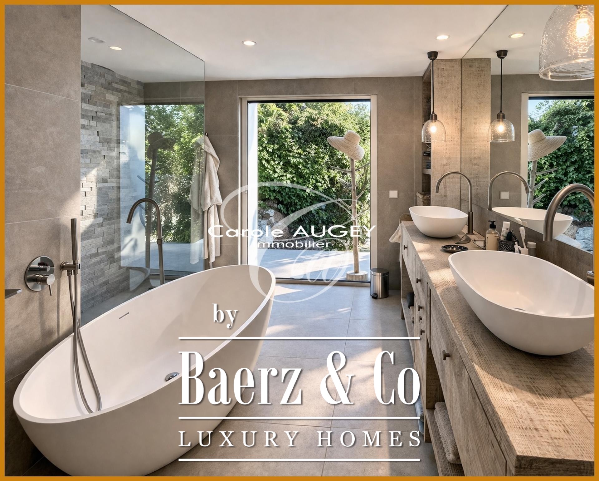 The property boasts 5 suites, including a studio with independent access. The principal suite offers expansive views and a calming atmosphere. The main living area is defined by its generous volumes, soaring ceilings, and an XXL double-sided fireplace, while the fully equipped kitchen enhances the connection between indoor and outdoor living. An elevator adds effortless access, and a sea-view gym completes the amenities.