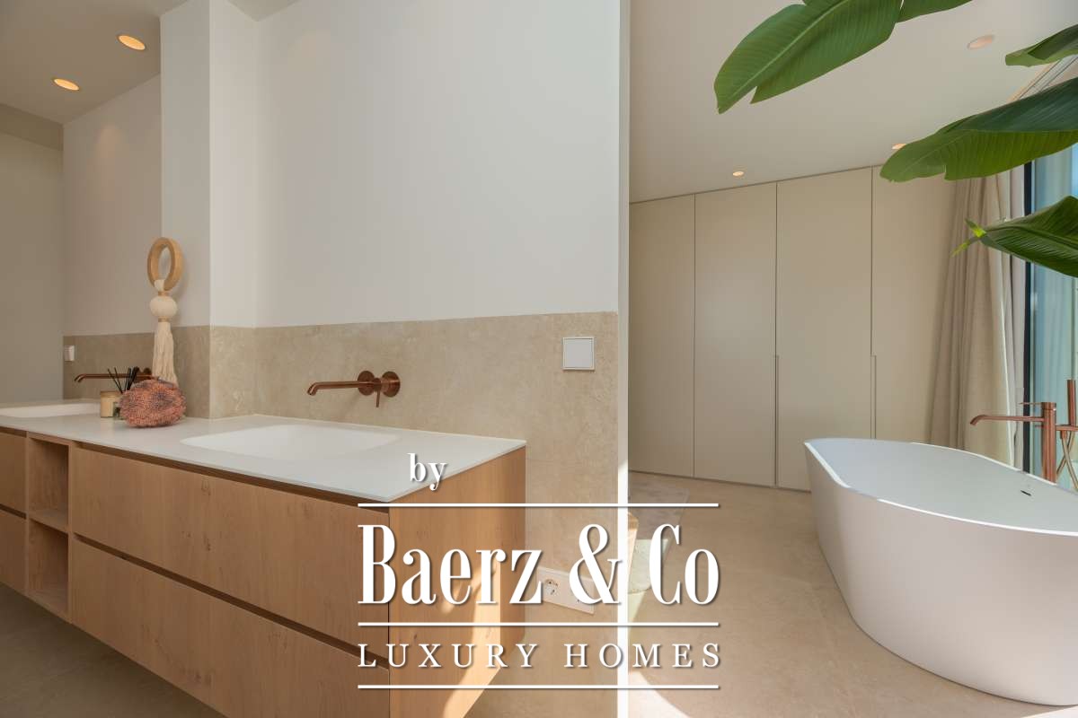 Inside, the villa extends across 410 m². The first floor welcomes you to a hall of 26 m², leading into three bedrooms, each with refined bathrooms. The master suite spans 30 m², featuring a freestanding bathtub and double sinks, designed for privacy and peace. The living area, flowing across 50 m², merges seamlessly with a 40 m² kitchen, unified by an elegant see-through fireplace and views onto the pool and landscaped gardens. A 5 m² loft adds airiness to this central space, and the adjoining veranda connects interior grace to the tranquility outdoors.