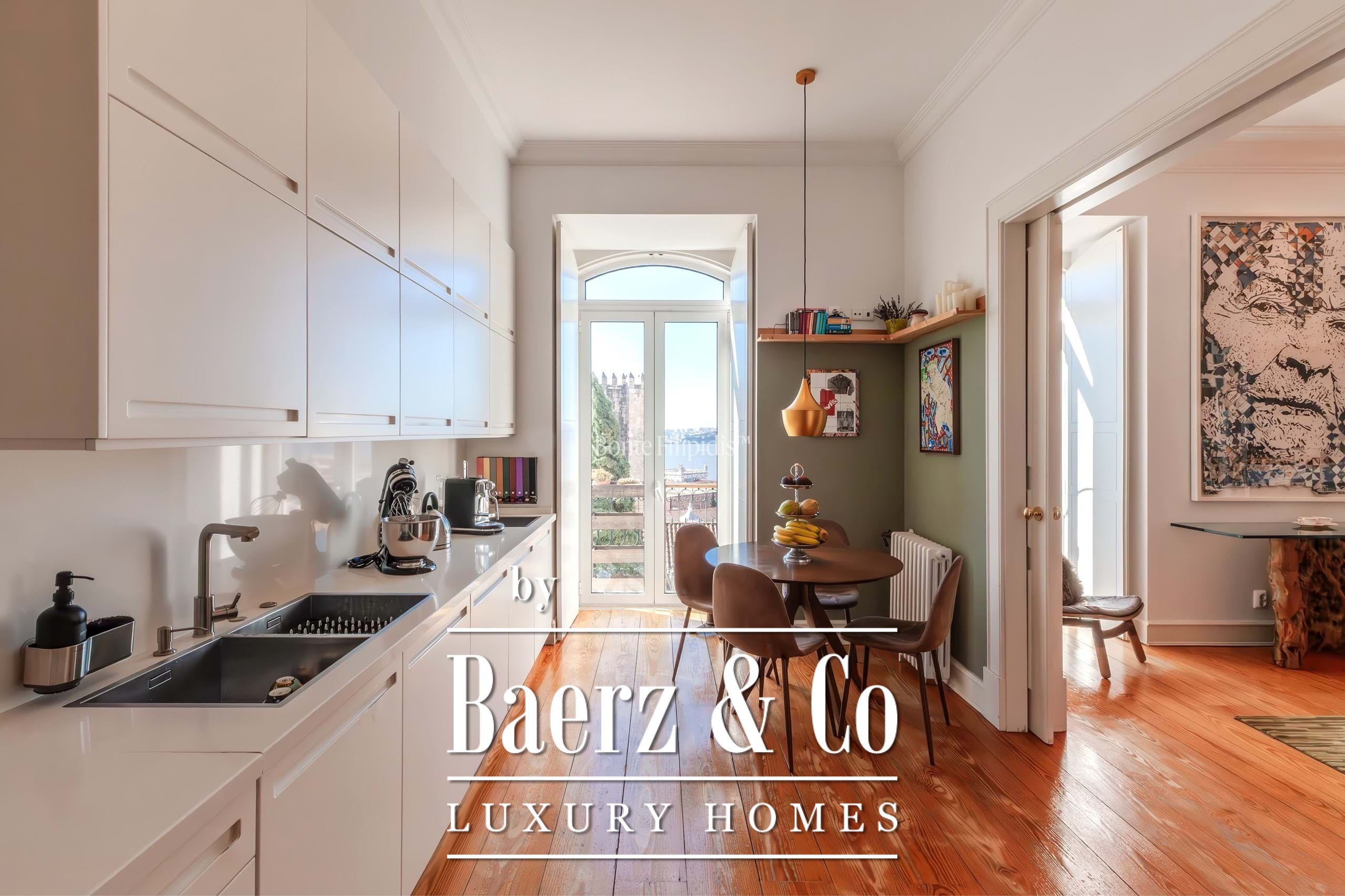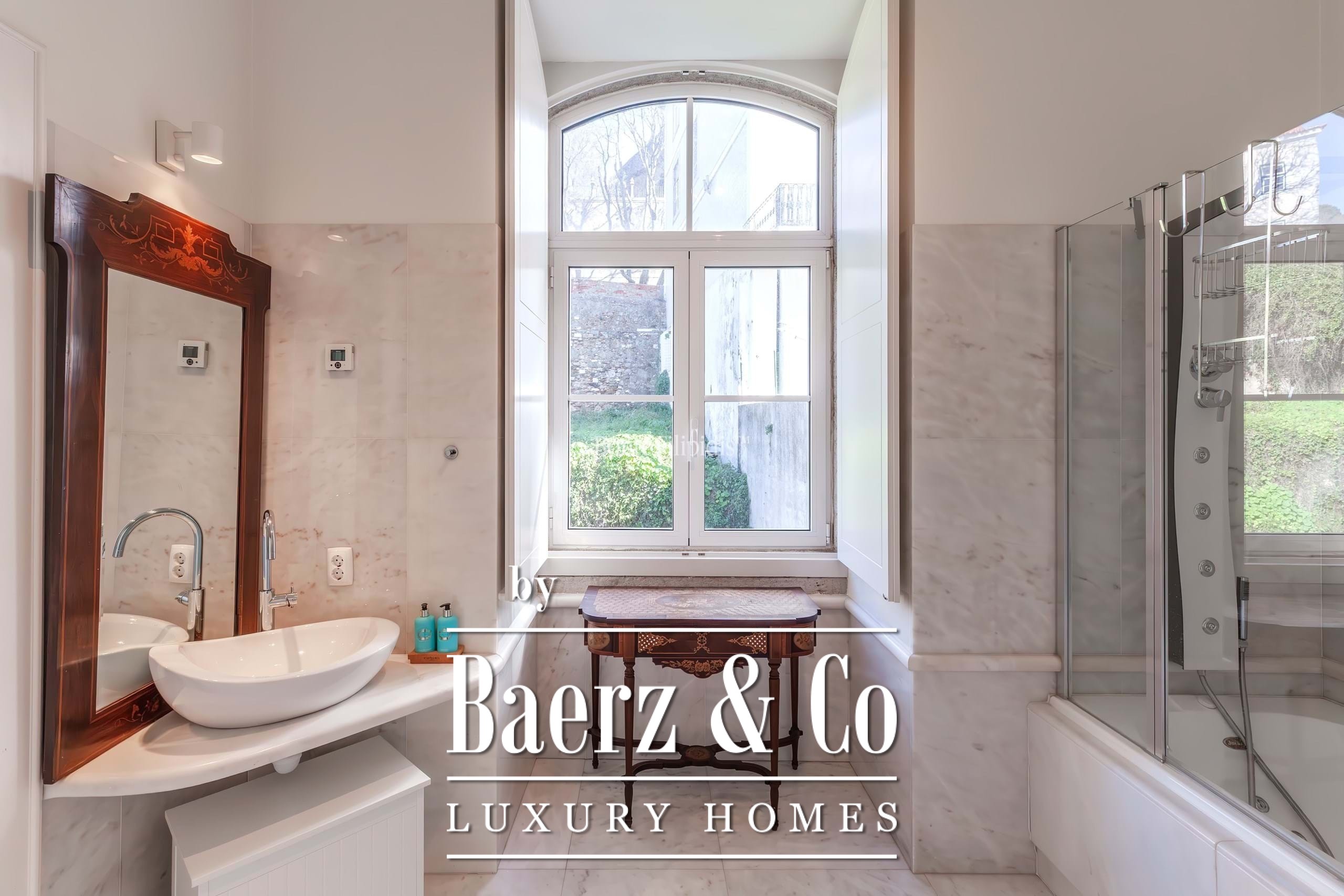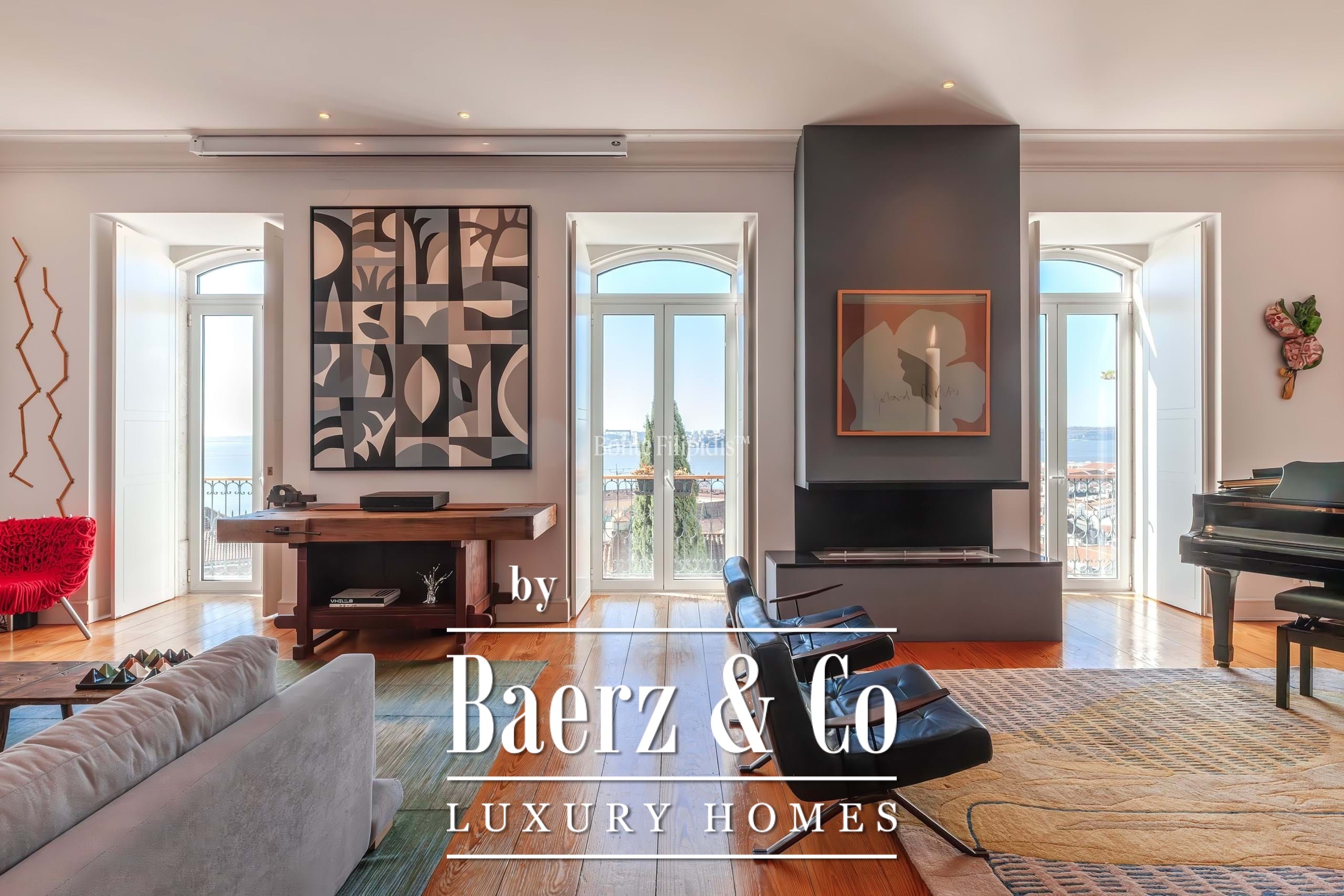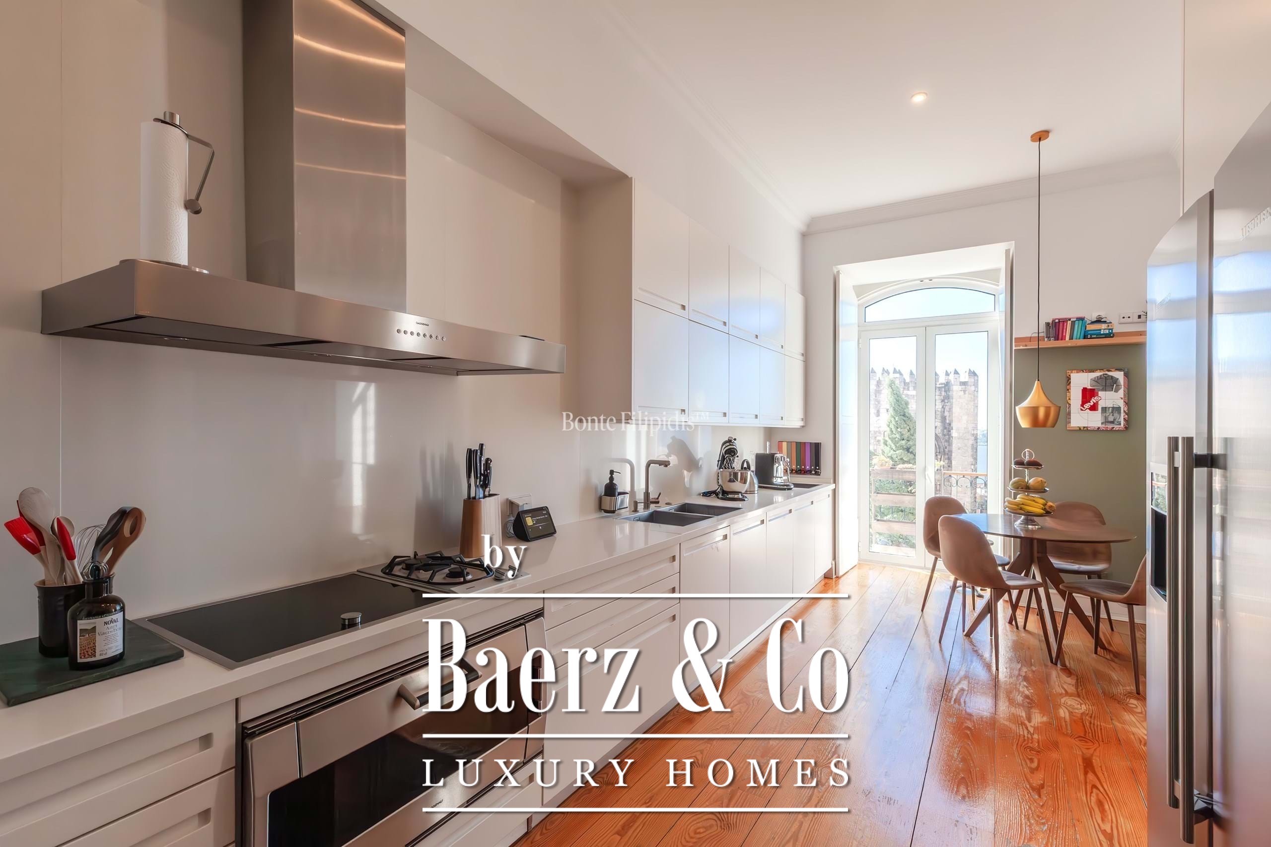 4 bedroom apartment Santa Maria Maior offers sophisticated living in the heart of Lisbon’s historic center. With a generous 353 m², this fully furnished residence balances natural light and panoramic views, including Lisbon Cathedral rooftops and the Tagus River. Seven south-facing windows illuminate spacious living and dining areas, with the 44.9 m² living room featuring a fireplace and high ceilings, and adjoining a 22.5 m² dining room. The 18 m² kitchen is fully equipped and seamlessly connected to social spaces, while a 12 m² office provides a private workspace.