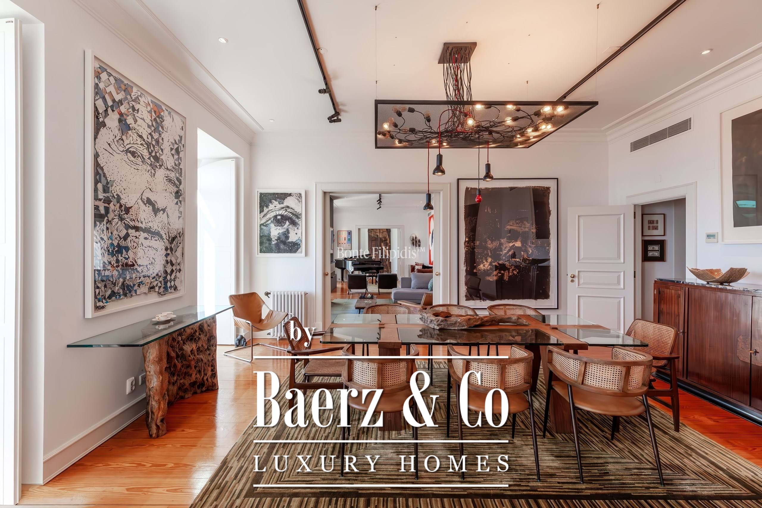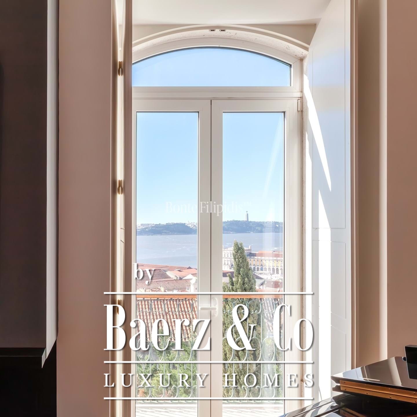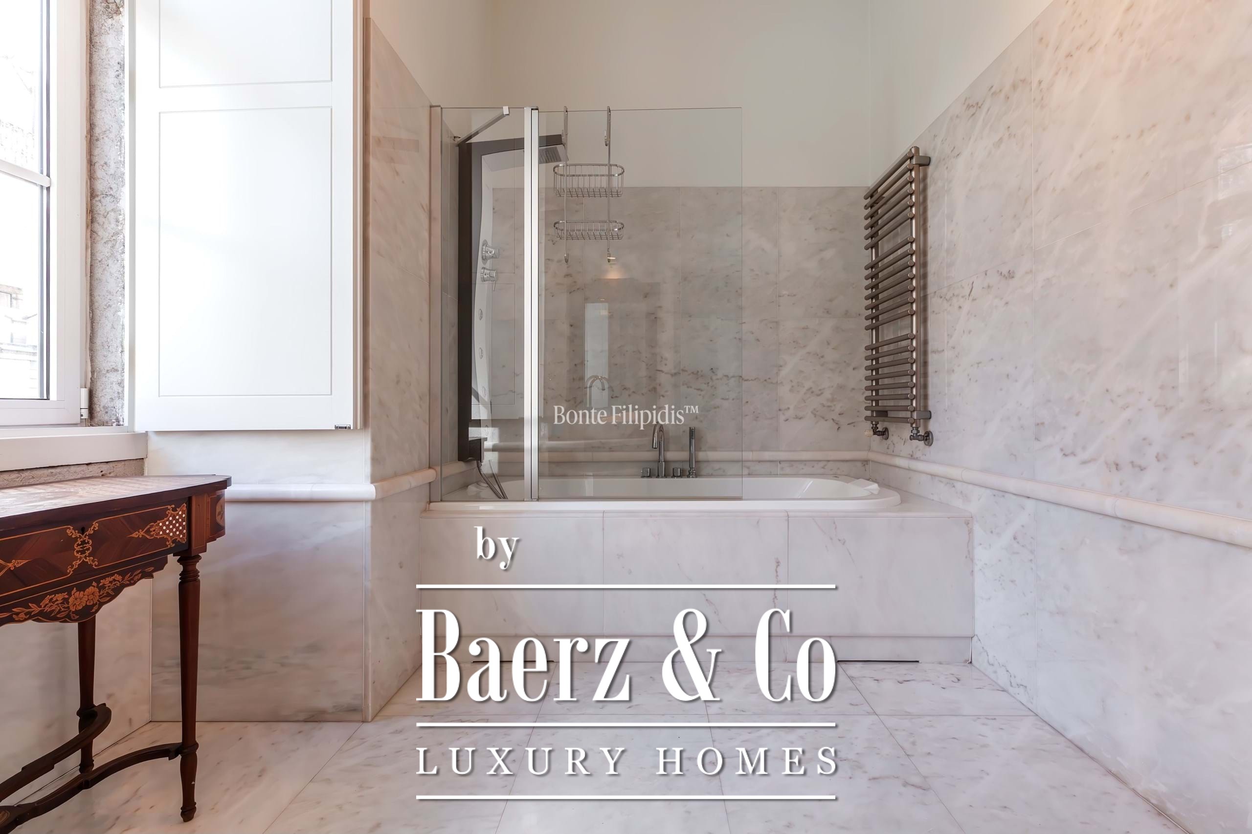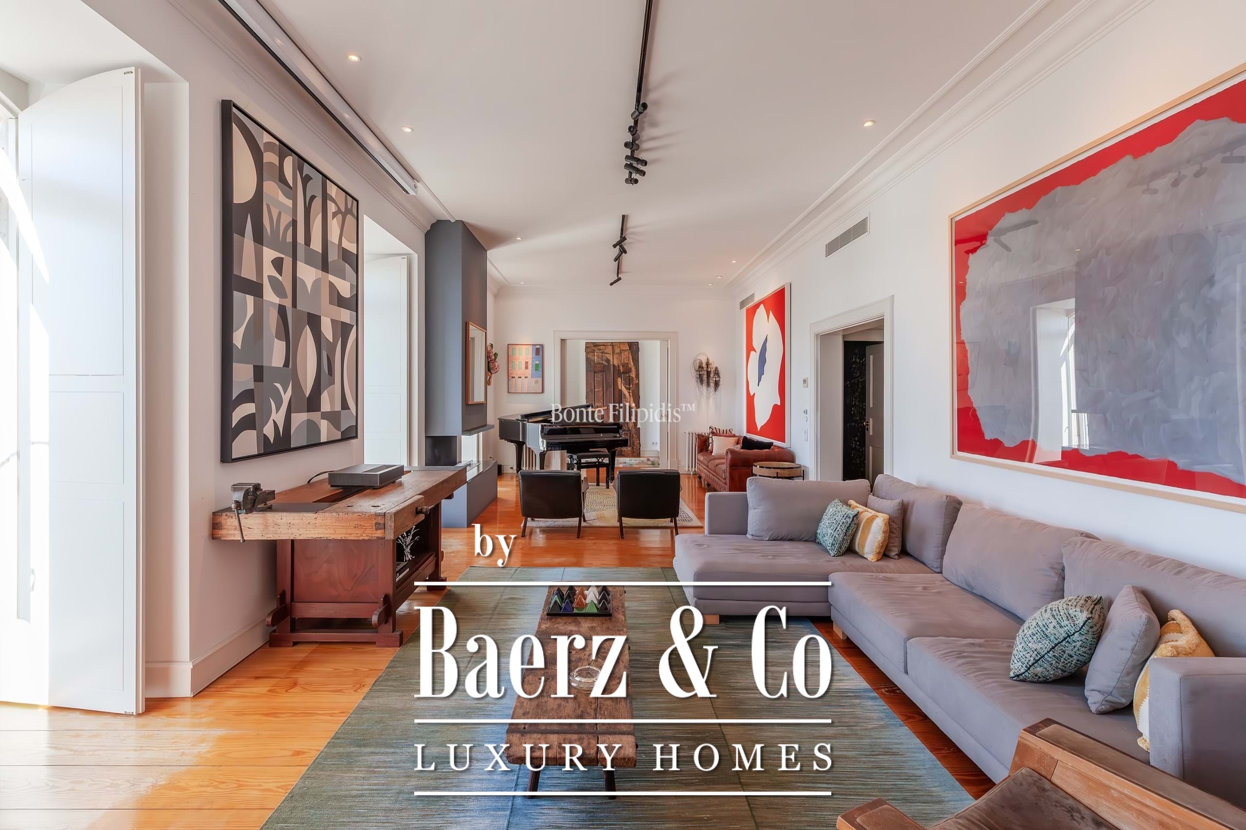 4 bedroom apartment Santa Maria Maior offers sophisticated living in the heart of Lisbon’s historic center. With a generous 353 m², this fully furnished residence balances natural light and panoramic views, including Lisbon Cathedral rooftops and the Tagus River. Seven south-facing windows illuminate spacious living and dining areas, with the 44.9 m² living room featuring a fireplace and high ceilings, and adjoining a 22.5 m² dining room. The 18 m² kitchen is fully equipped and seamlessly connected to social spaces, while a 12 m² office provides a private workspace.